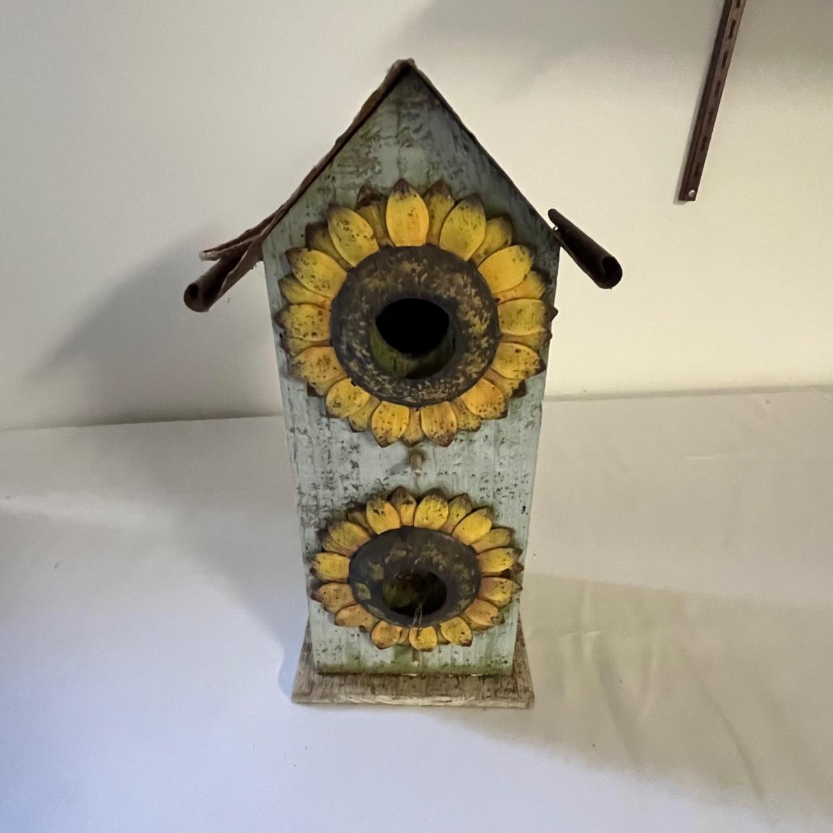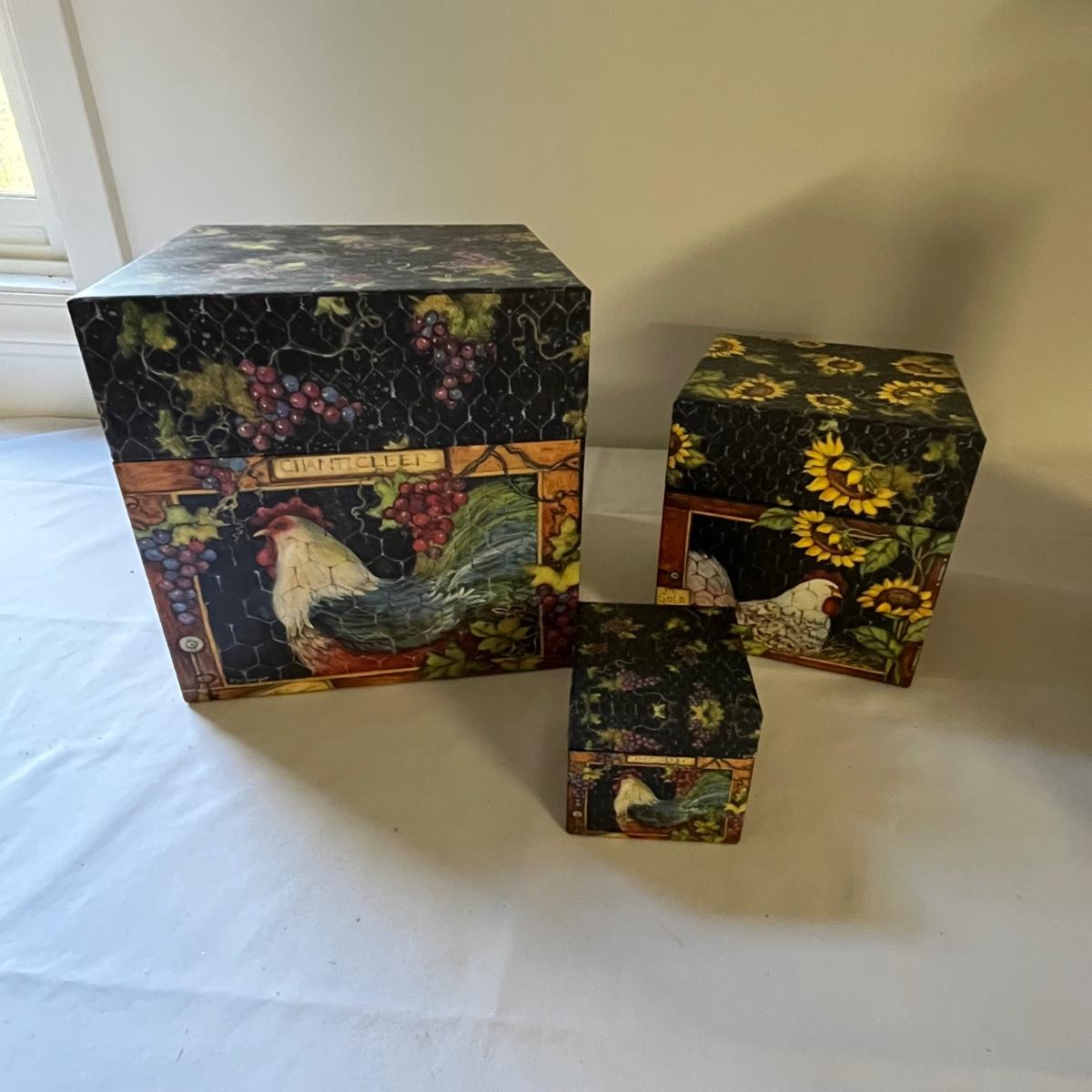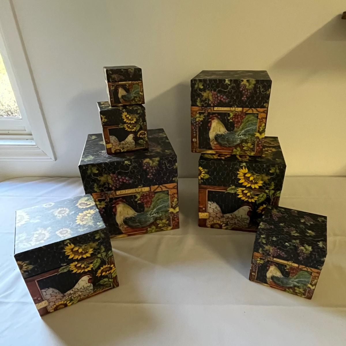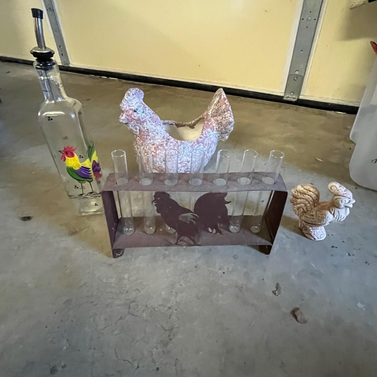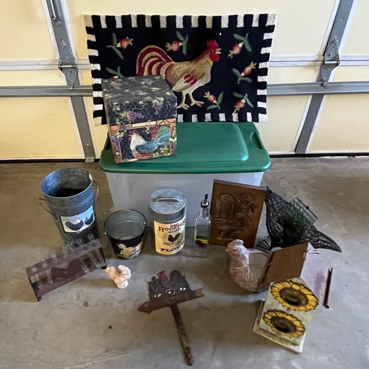 Collection of rooster items including nesting boxes, buckets, pictures, art deco, a rug and a sunflower bird house.