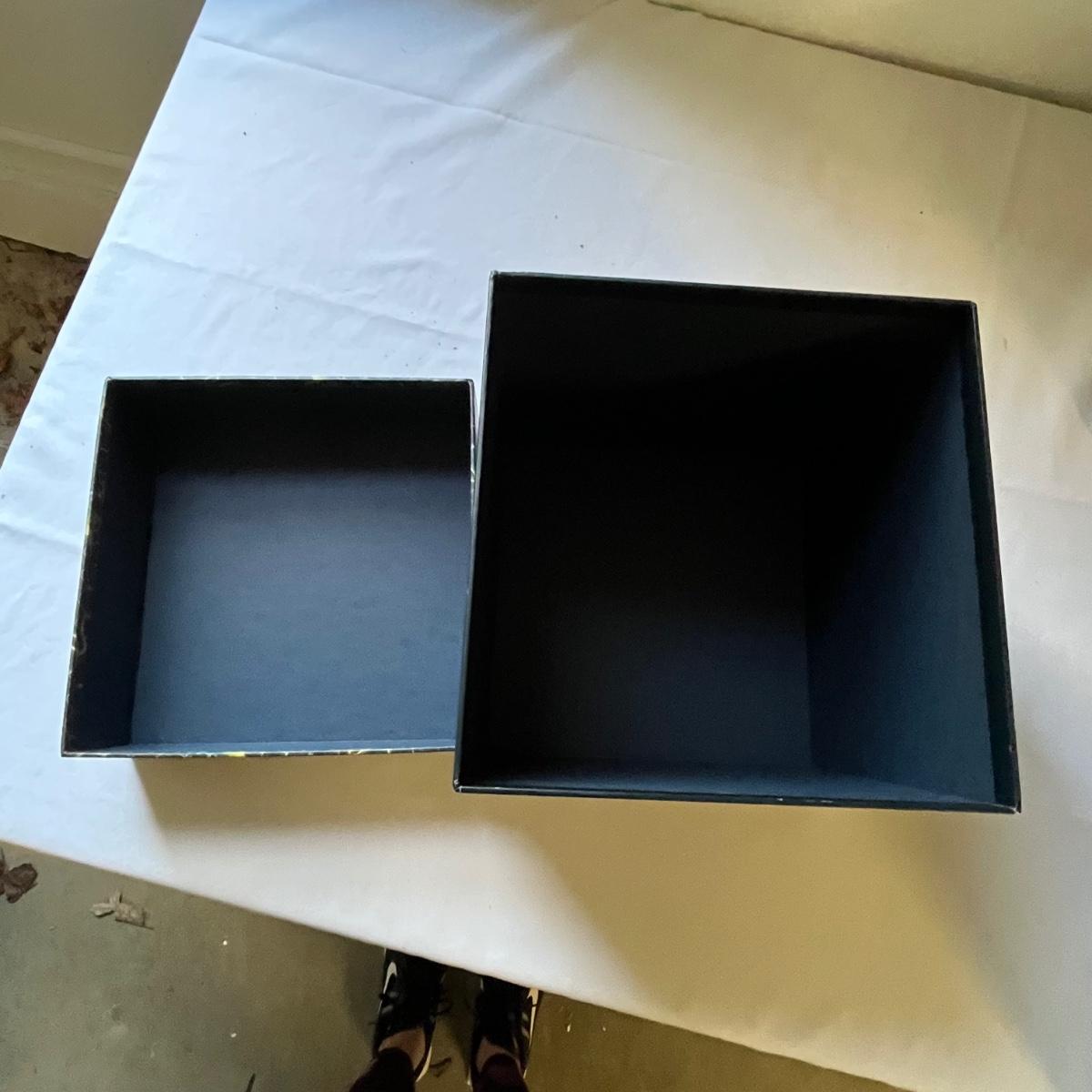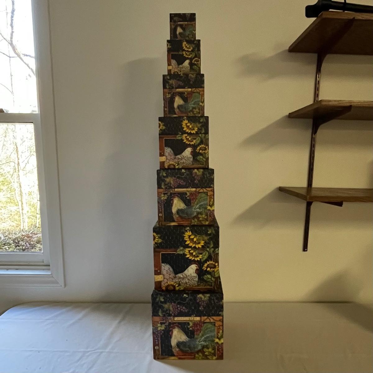 Largest nesting box is 9” cubed. Smallest is 3.25” cubed. Rug is 19” x 31.5”. Shipping available. Includes the storage bin pictured.