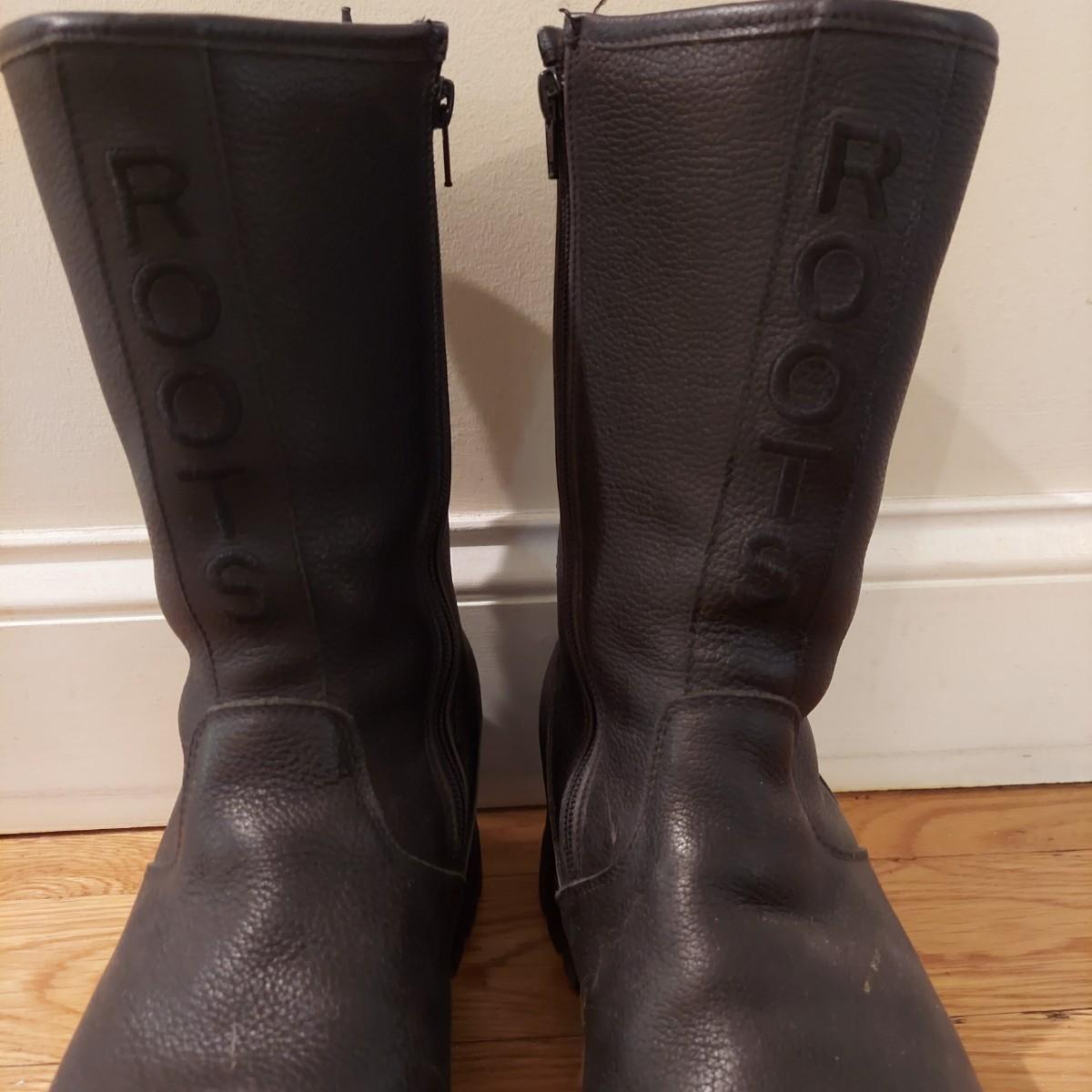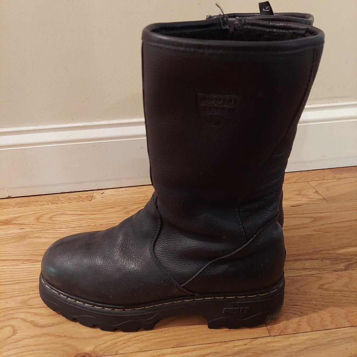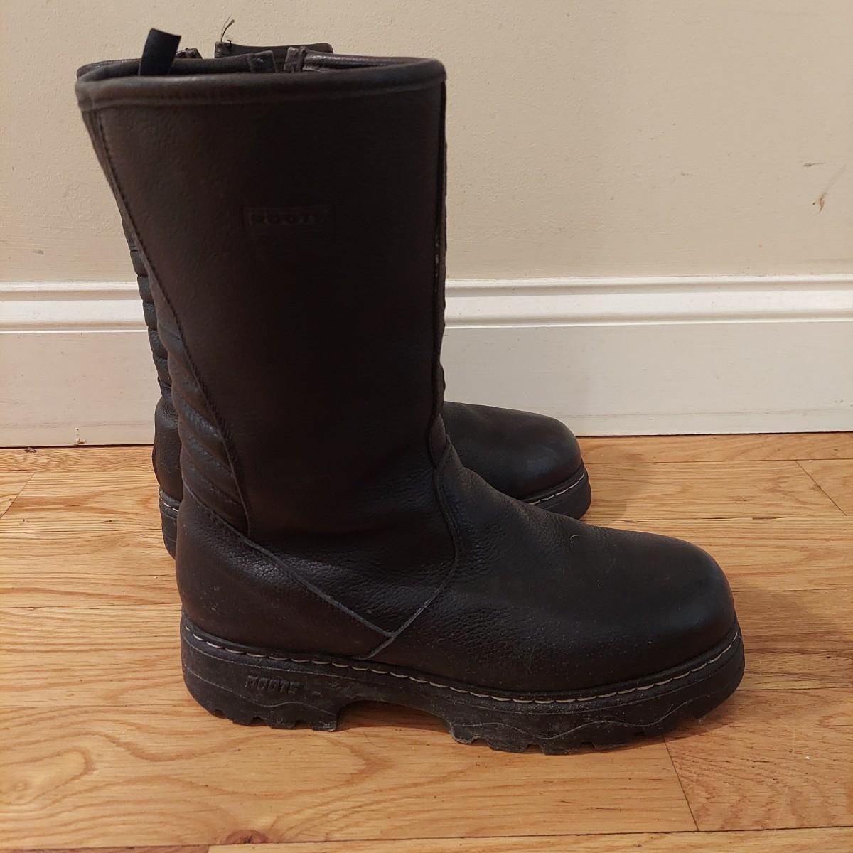 Black leather boots by Roots Tuff brand. They appear to be insulated with some sort of fleece. They are a men’s US size 9. Side zip. Some signs of wear. Please see photos for details. Shipping available
