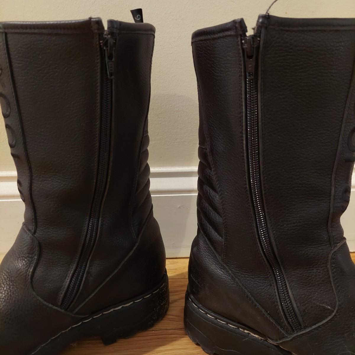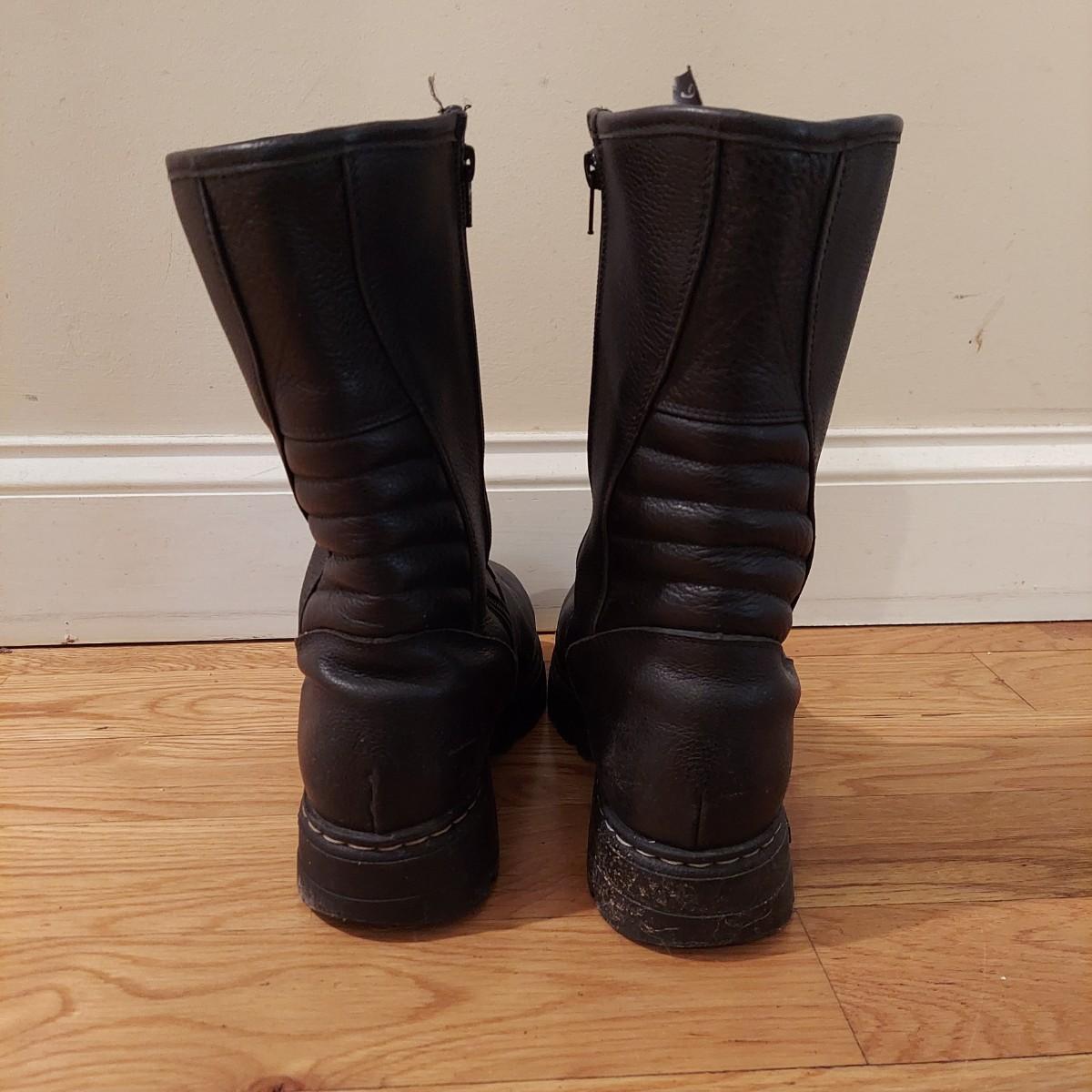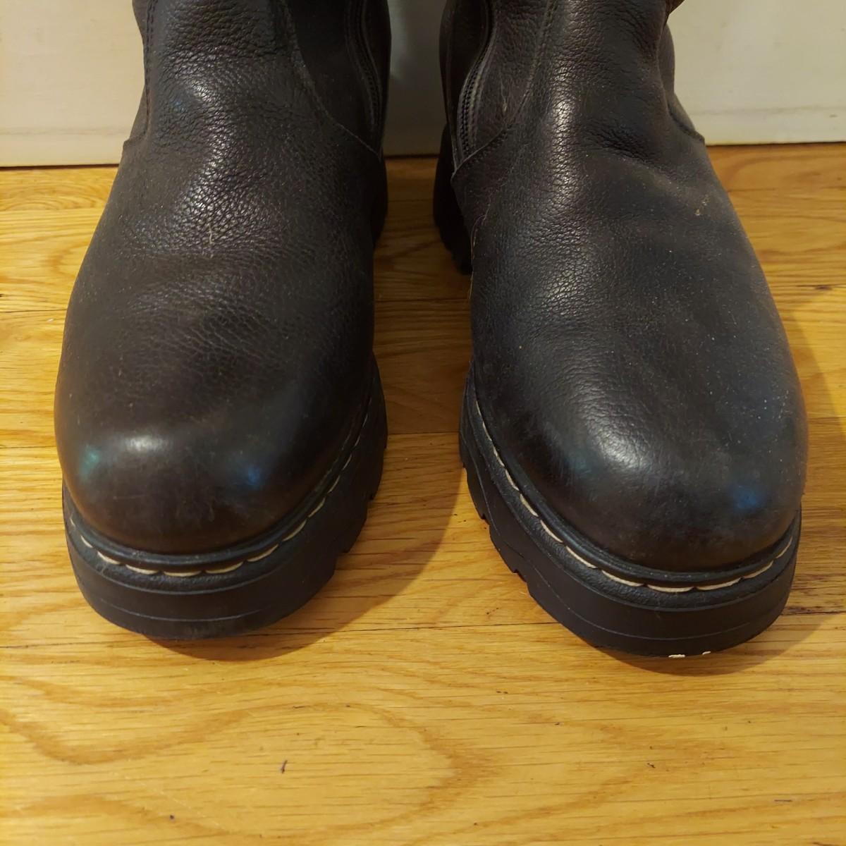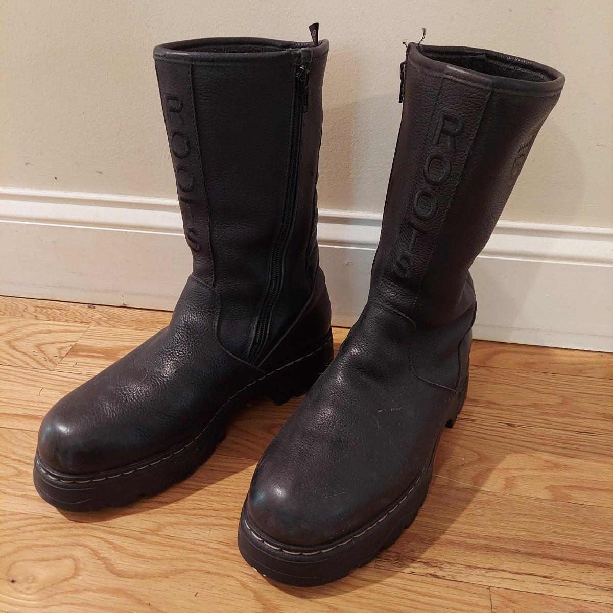 Black leather boots by Roots Tuff brand. They appear to be insulated with some sort of fleece. They are a men’s US size 9. Side zip. Some signs of wear. Please see photos for details. Shipping available