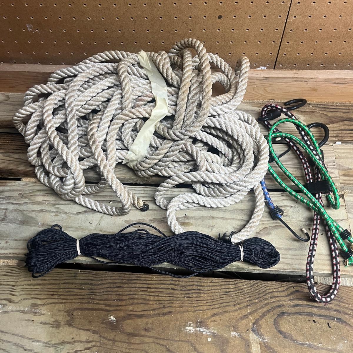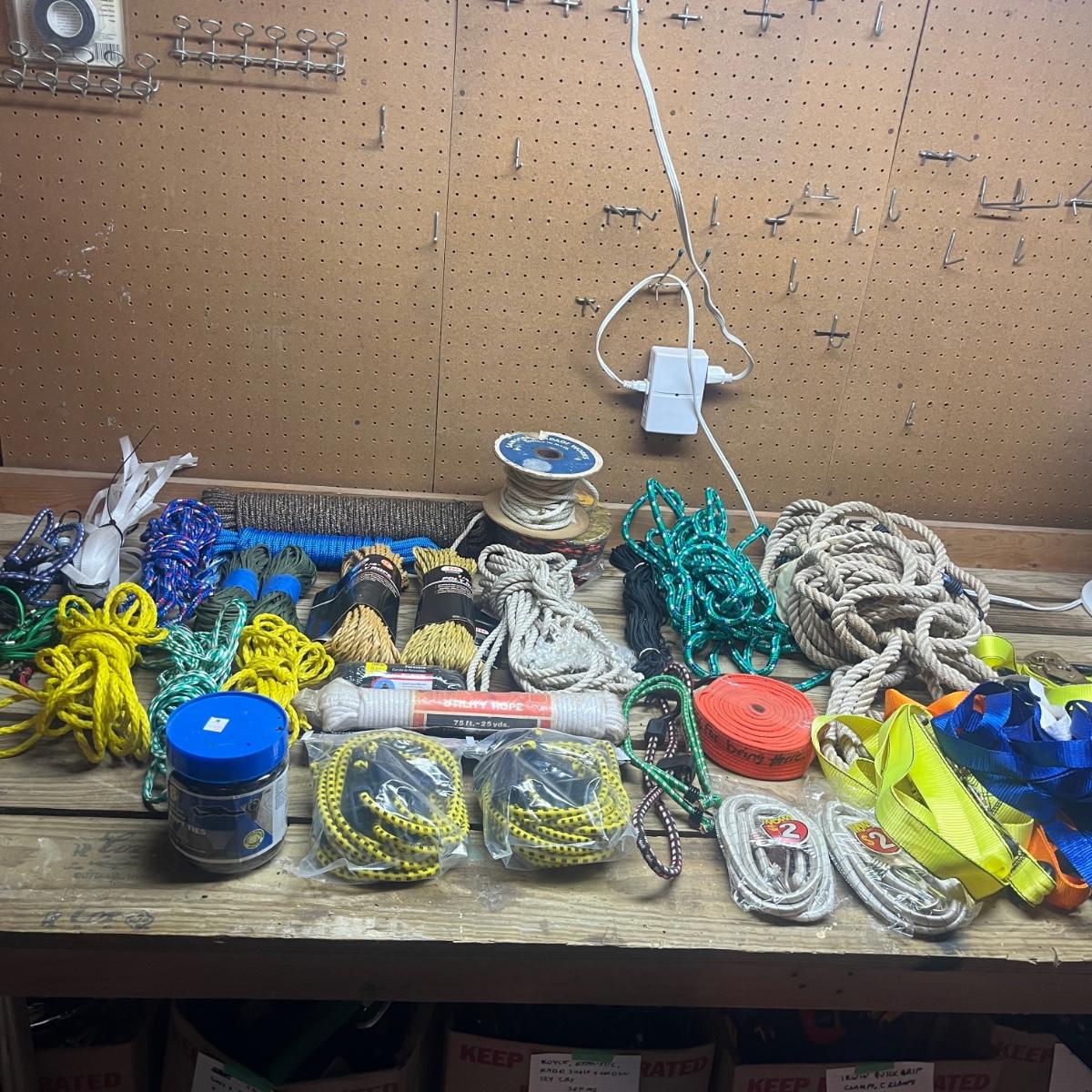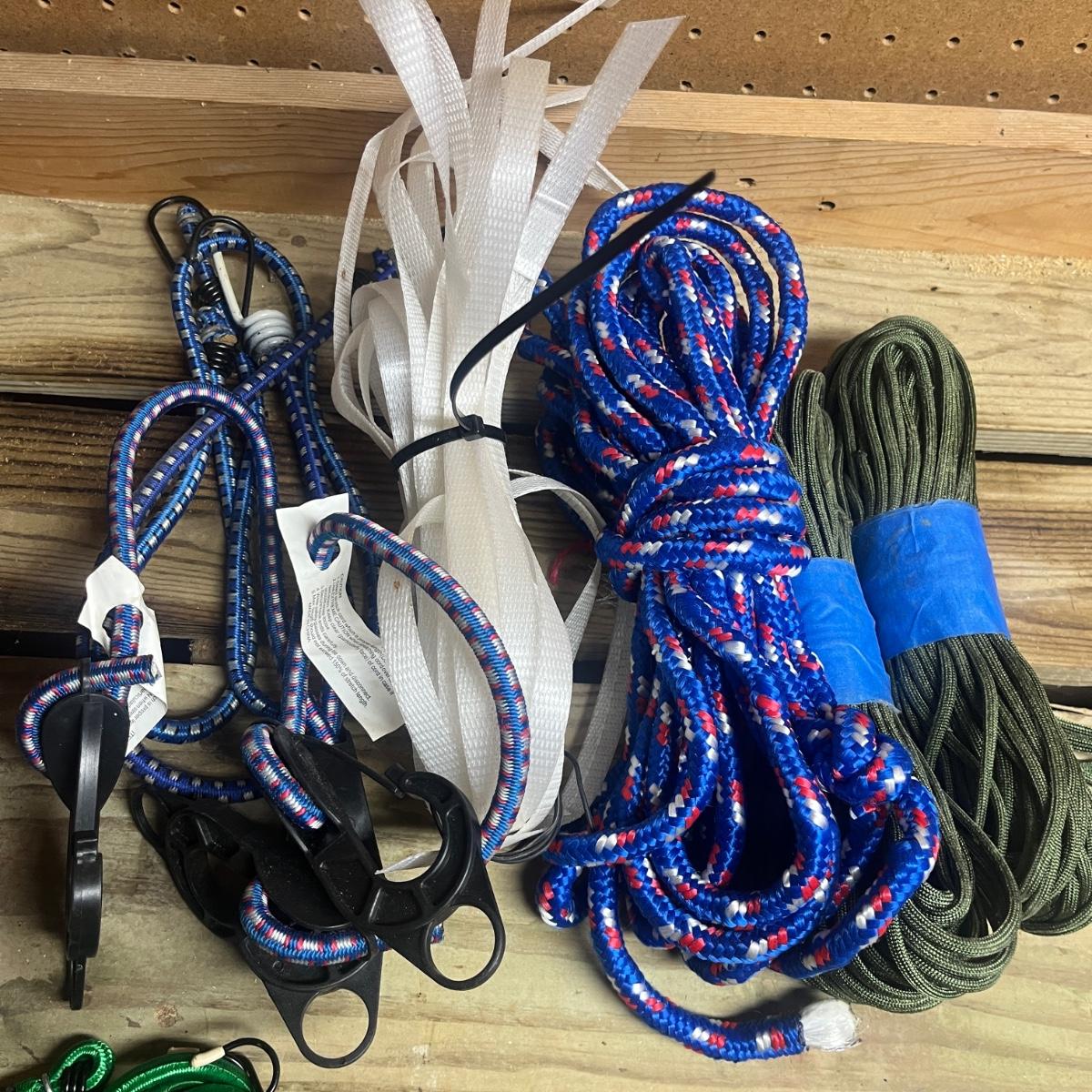 Lot includes a selection of rope, paracord, ratchet straps, bungee cords in a variety of sizes and materials.