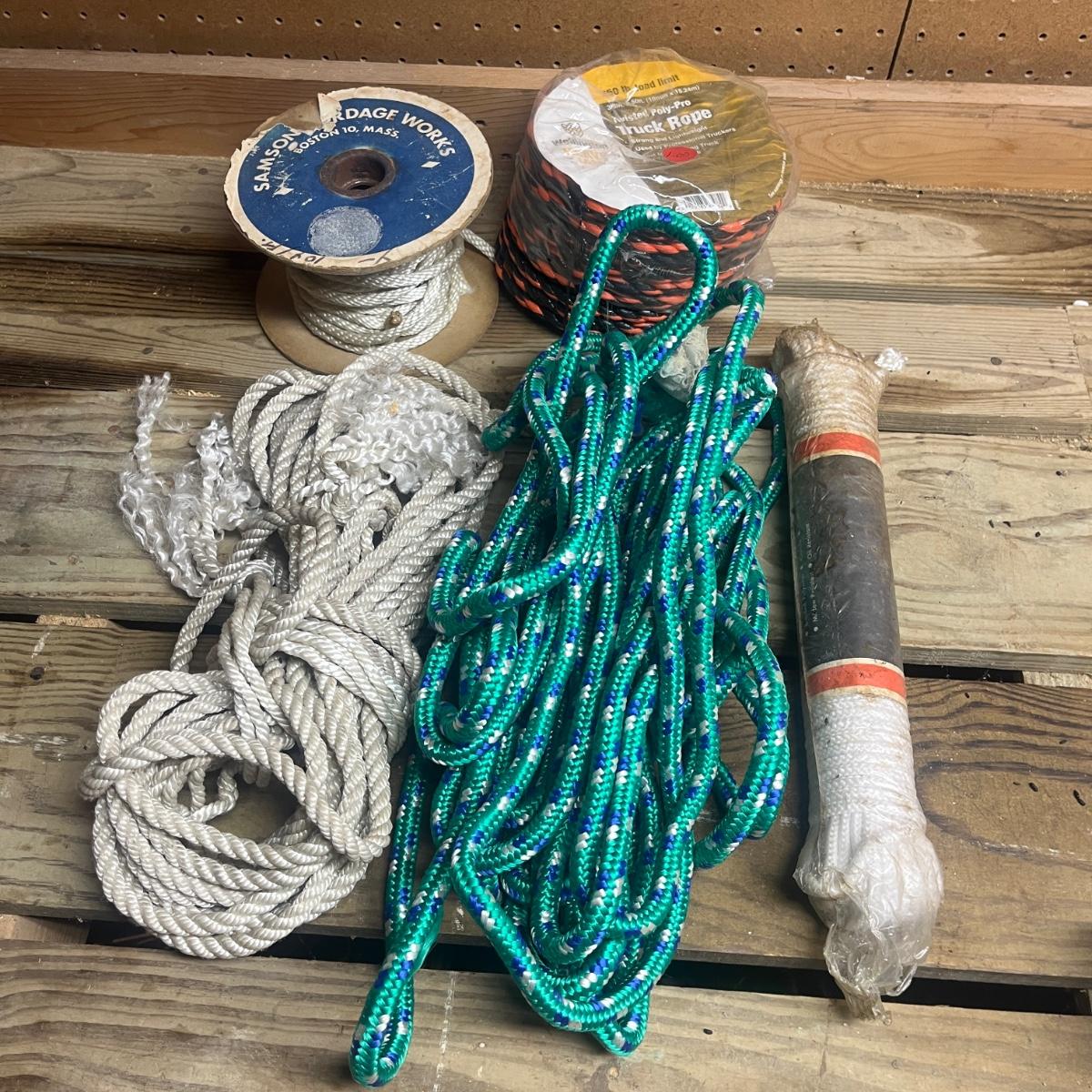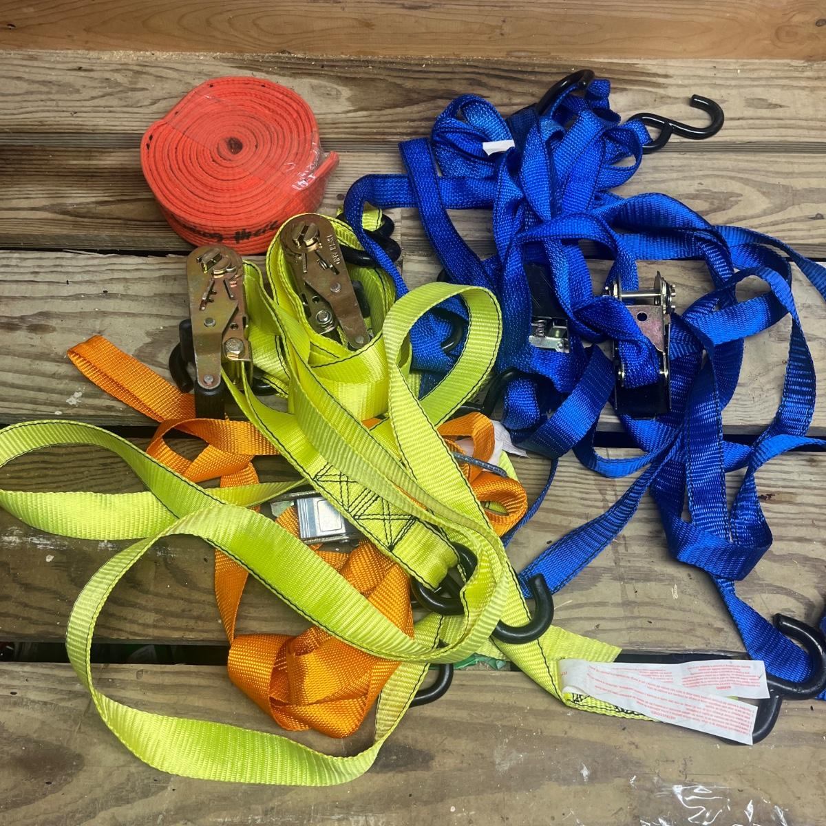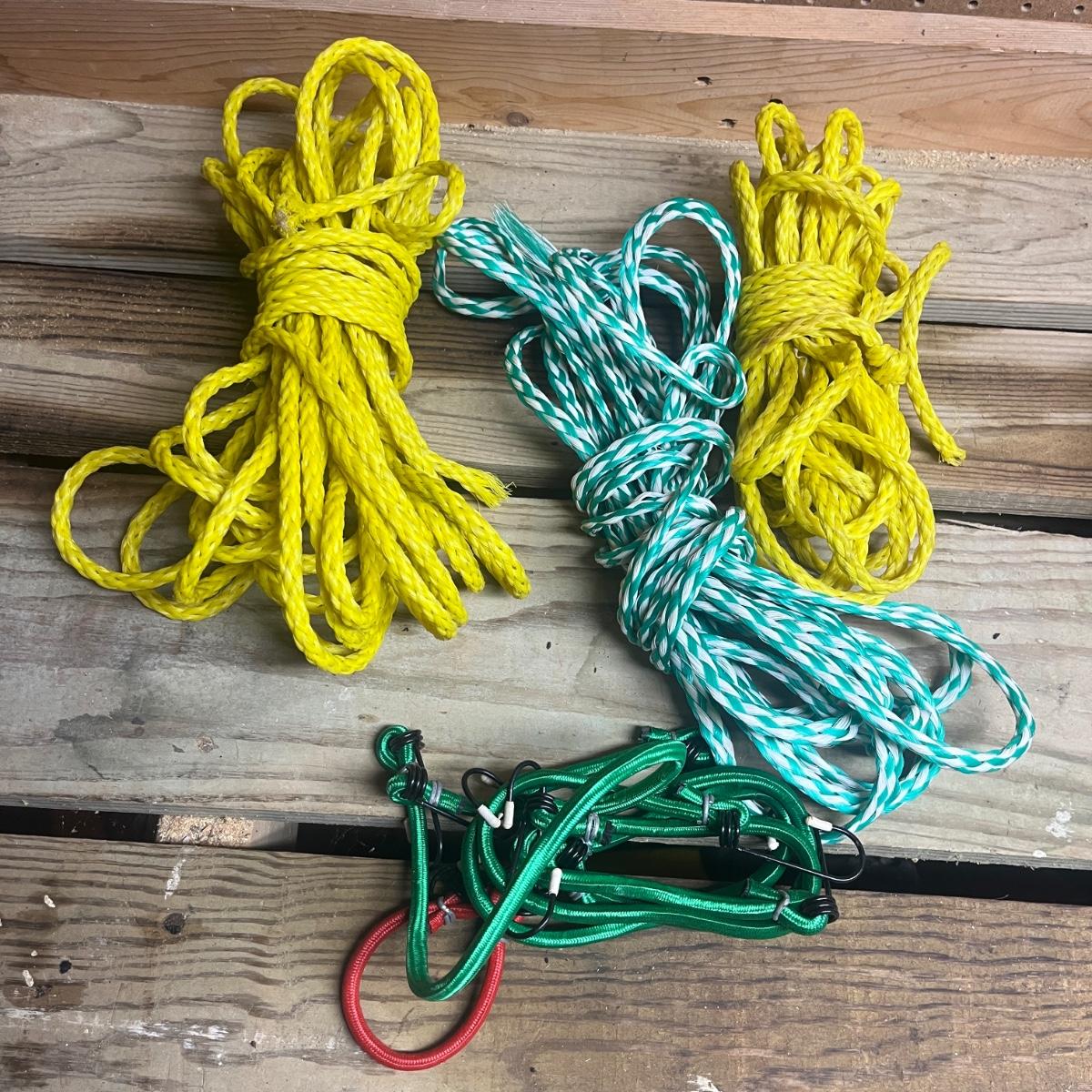 Lot includes a selection of rope, paracord, ratchet straps, bungee cords in a variety of sizes and materials.
