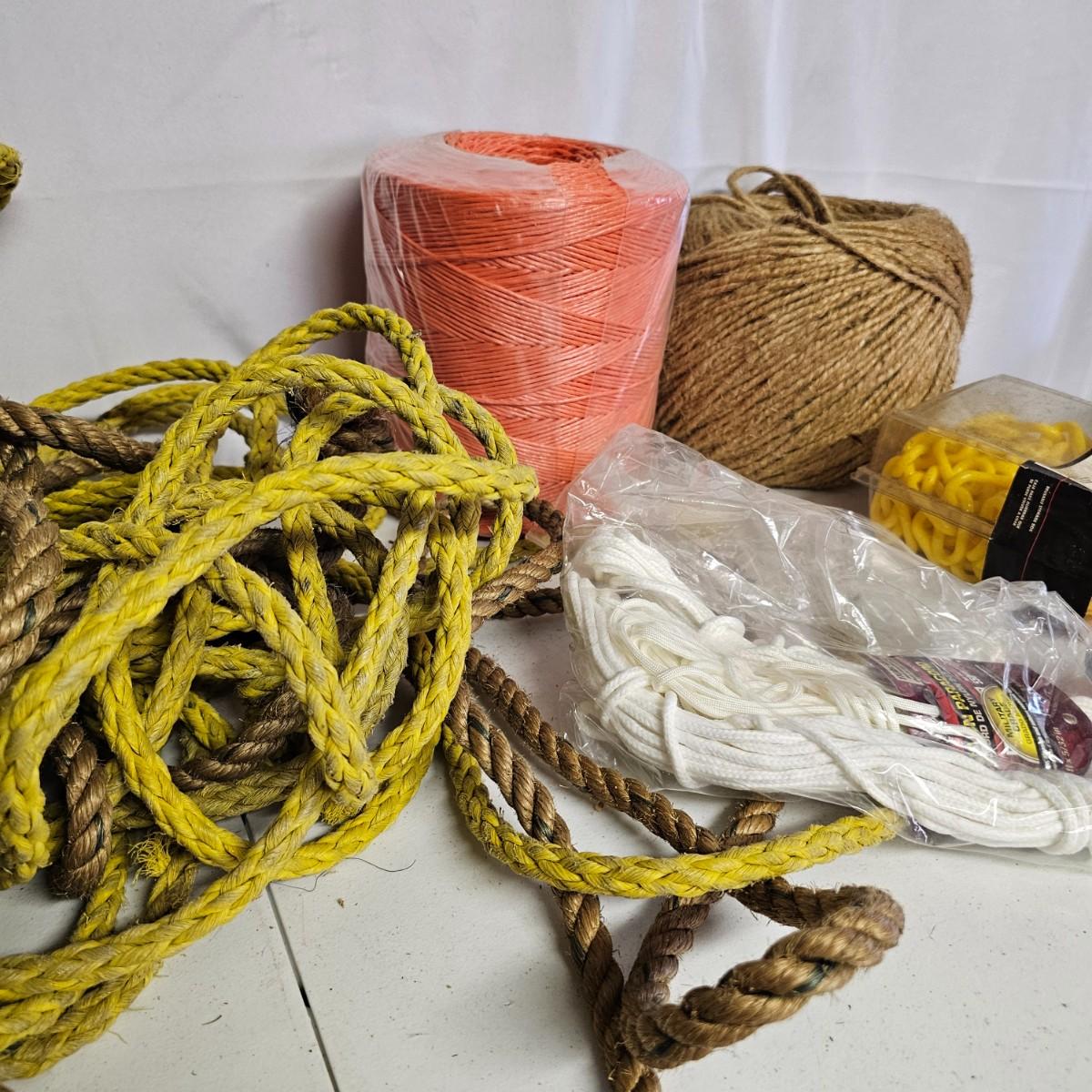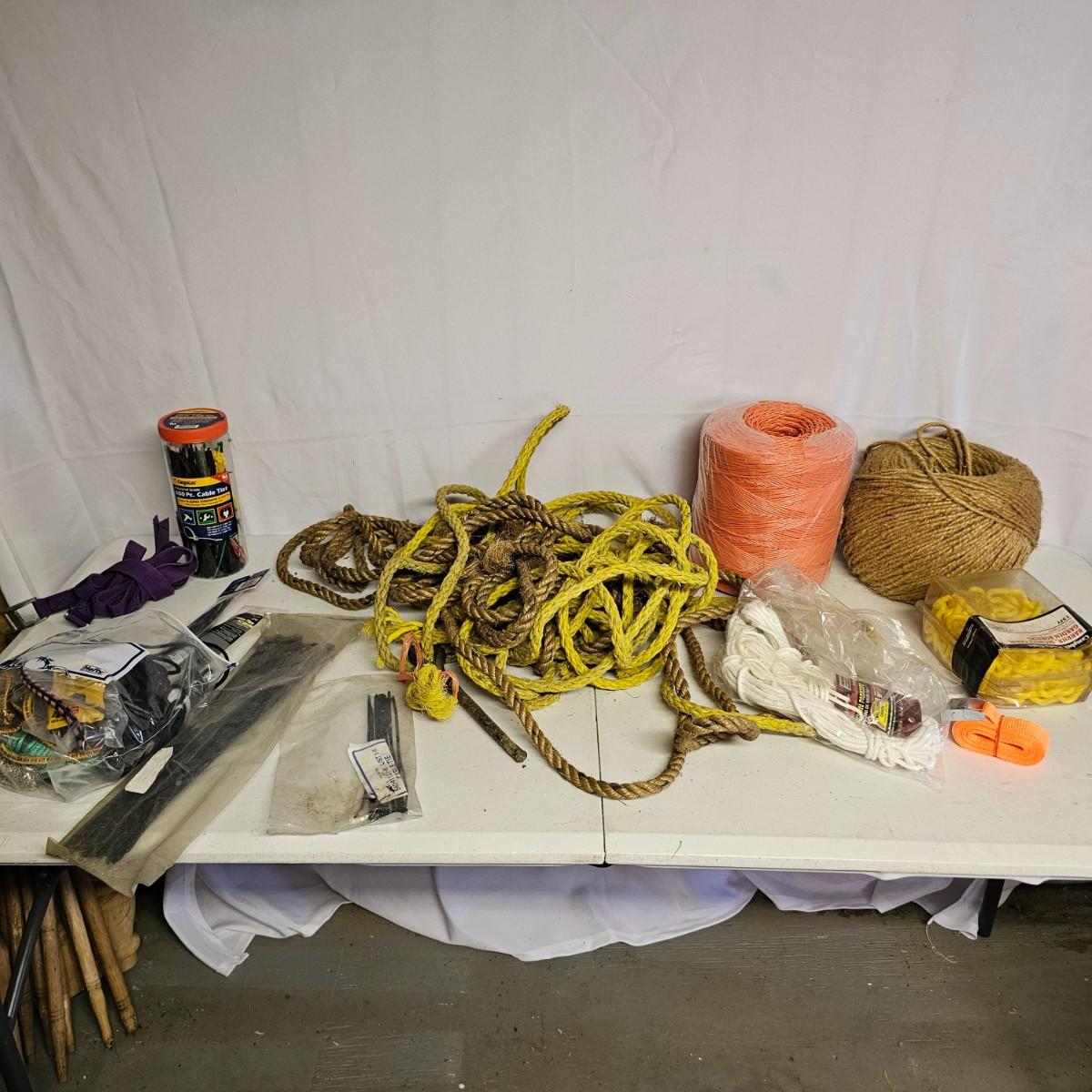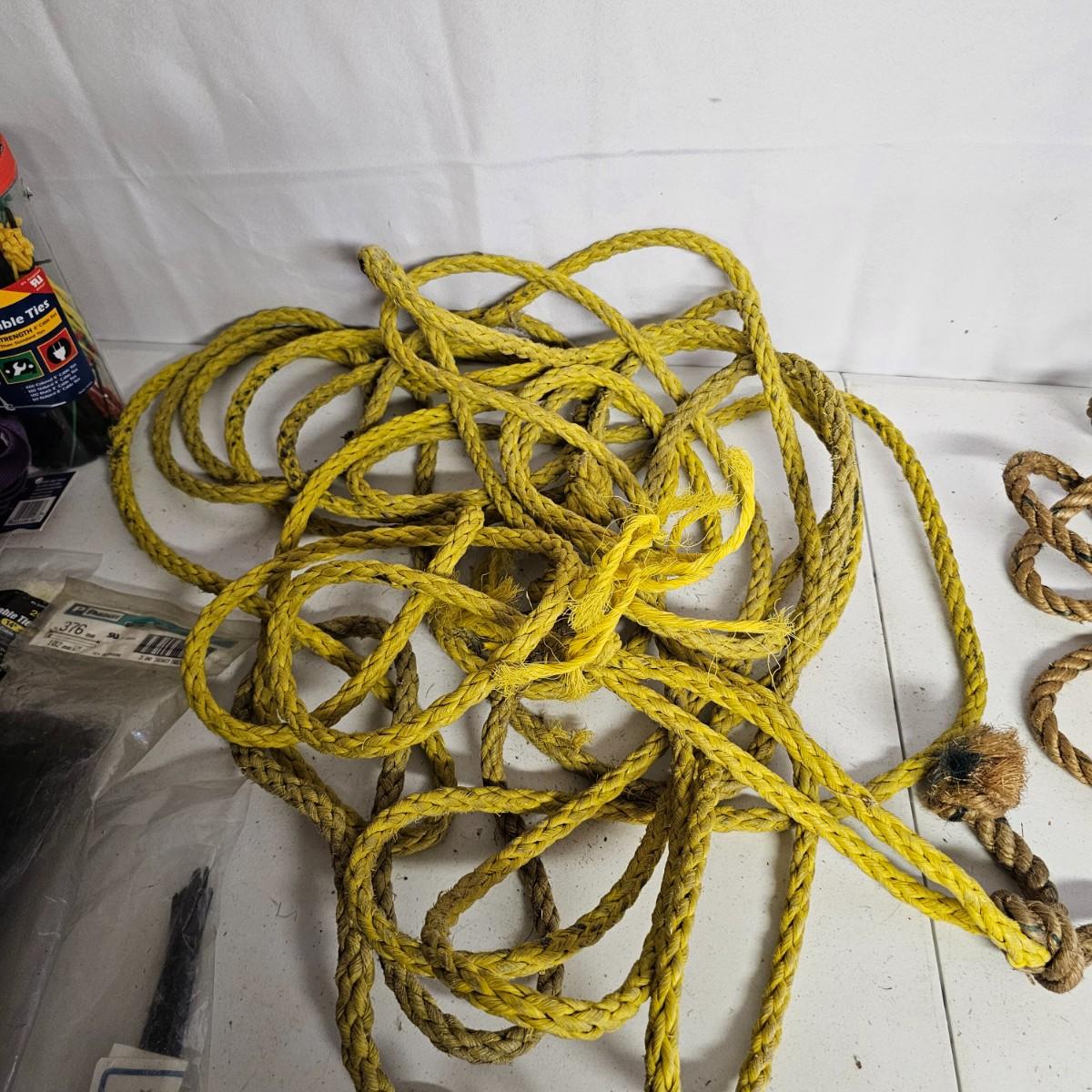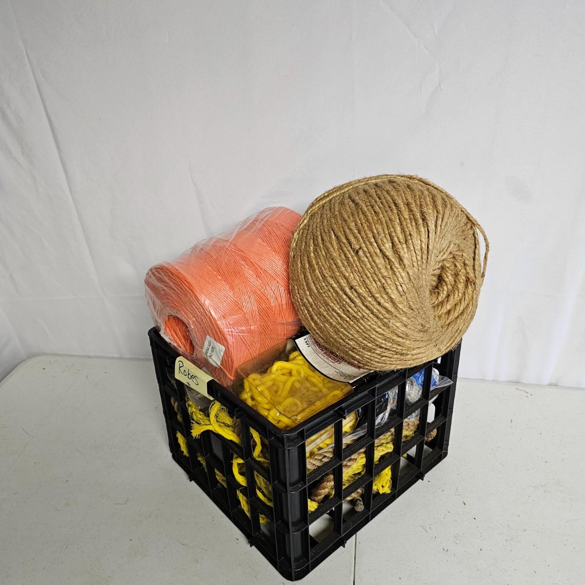 Various sizes and types of tying and binding material. Bungie cords, zip ties, adjustable straps, nylon and sisal rope. Not marked in length, but orange package is polyester binder twine that is 8"D x 9"H. Plastic crate included. See photos for details. Local pickup only.