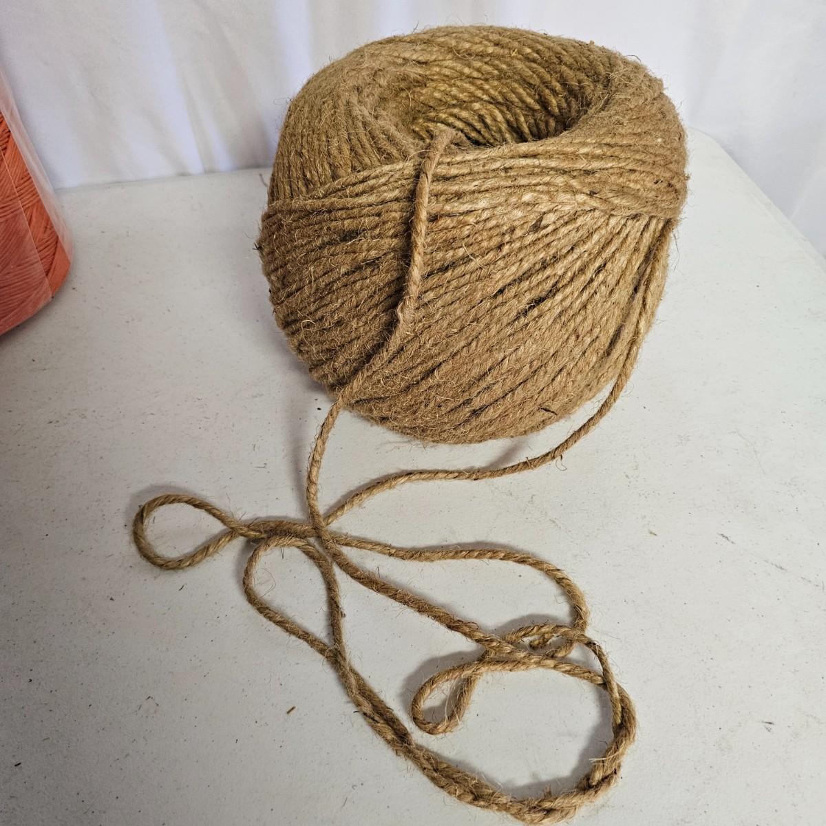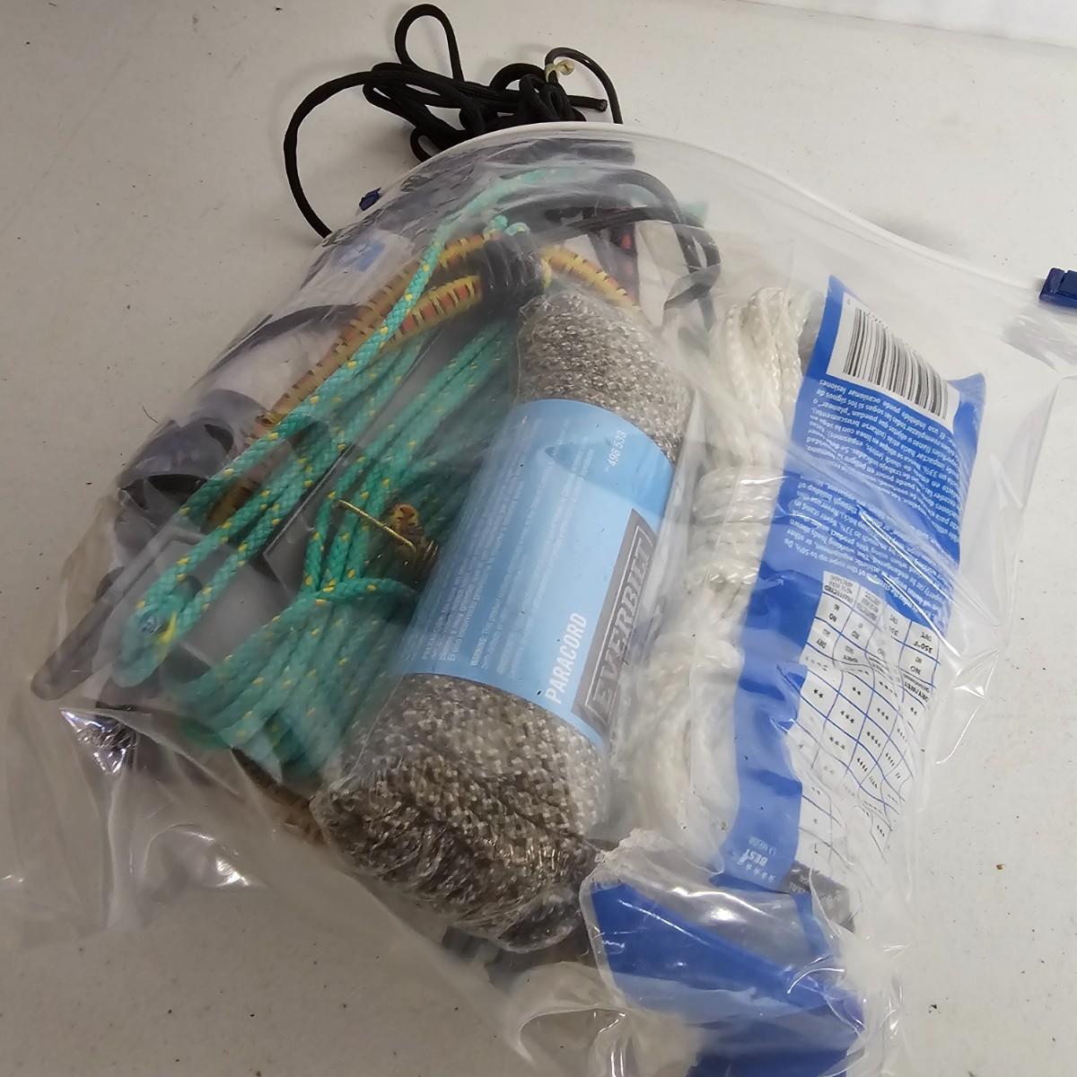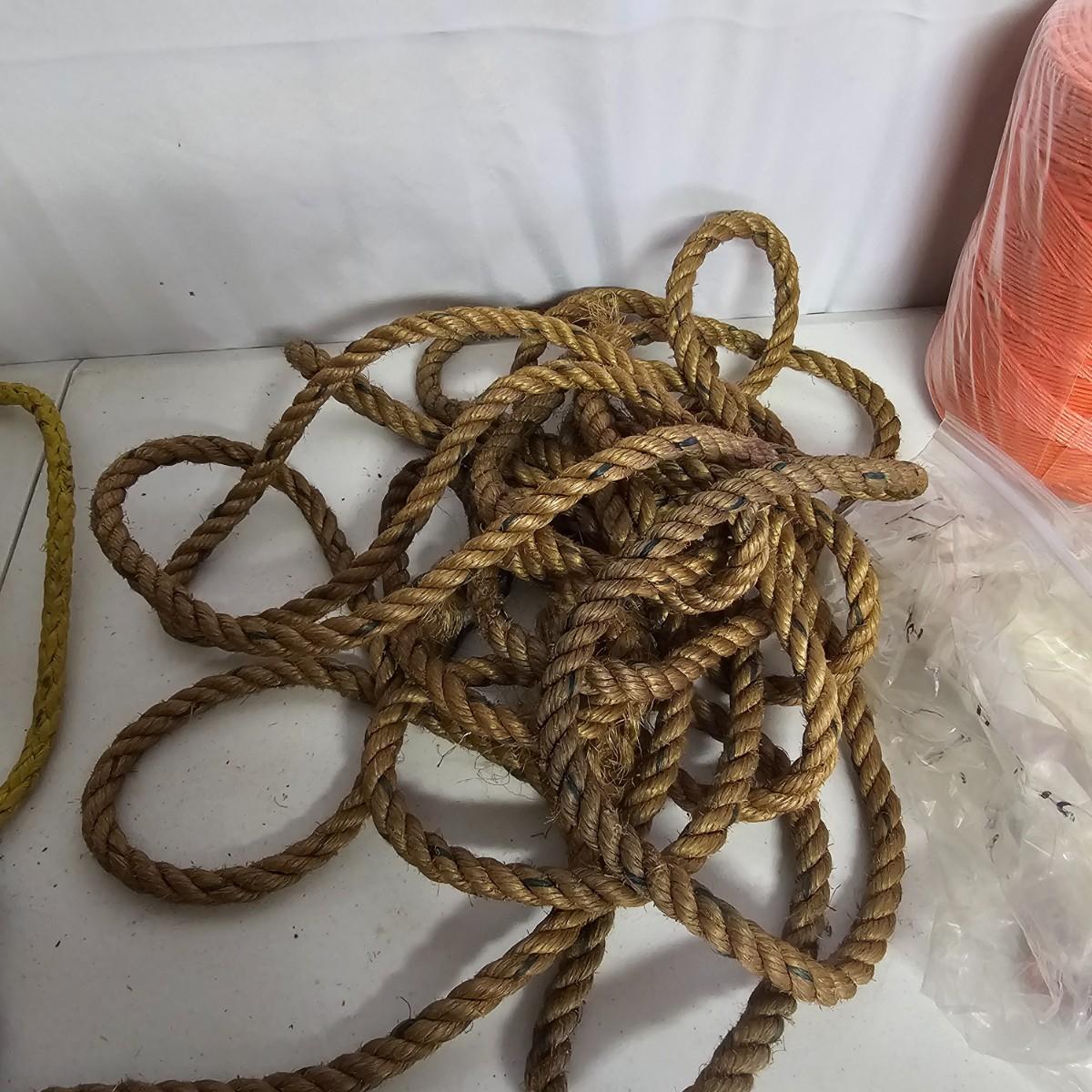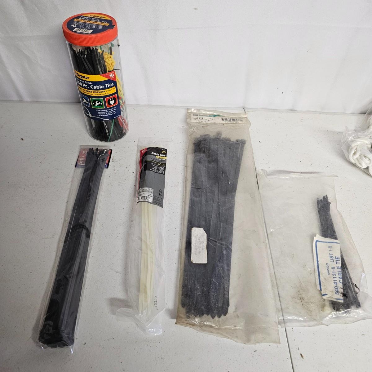Various sizes and types of tying and binding material. Bungie cords, zip ties, adjustable straps, nylon and sisal rope. Not marked in length, but orange package is polyester binder twine that is 8"D x 9"H. Plastic crate included. See photos for details. Local pickup only.