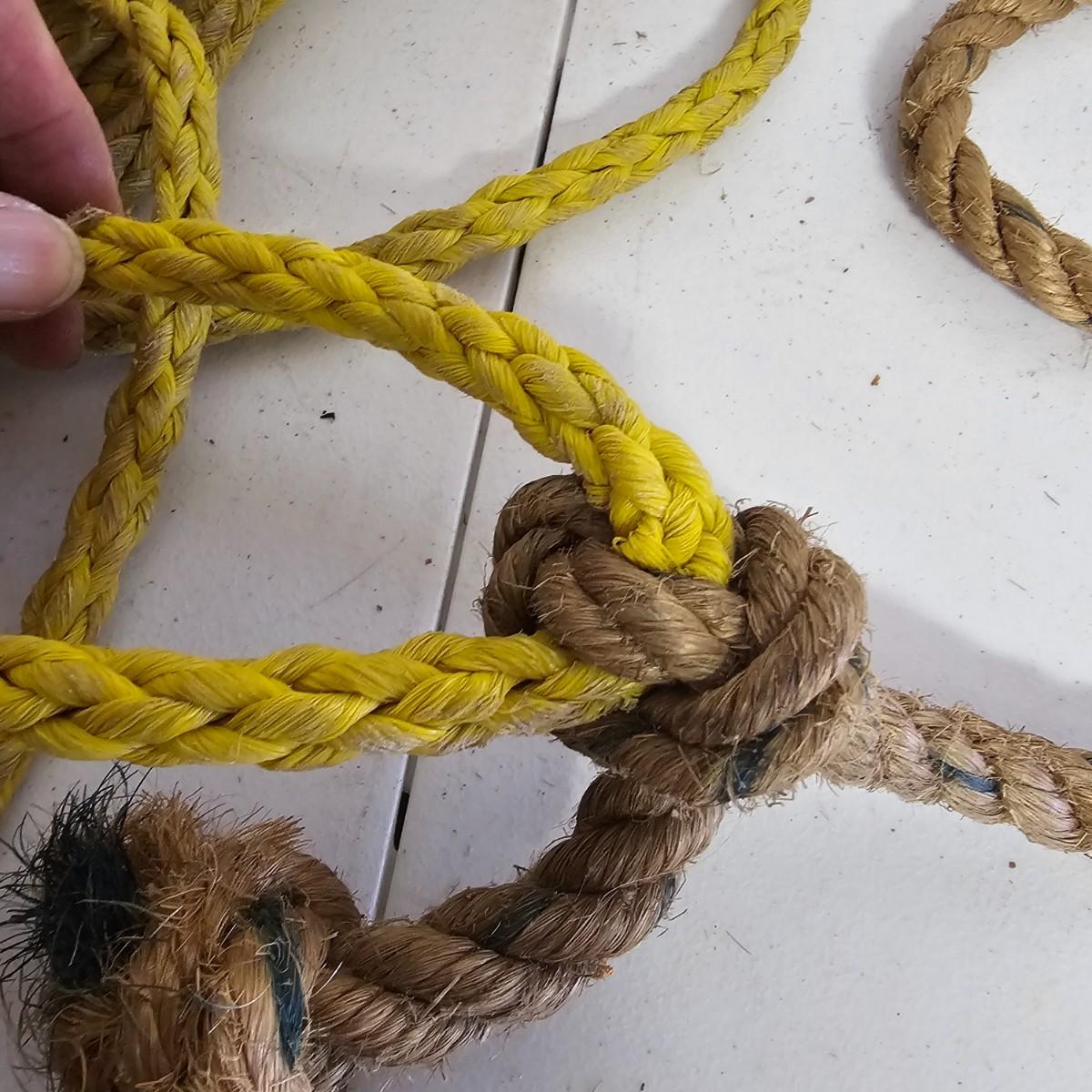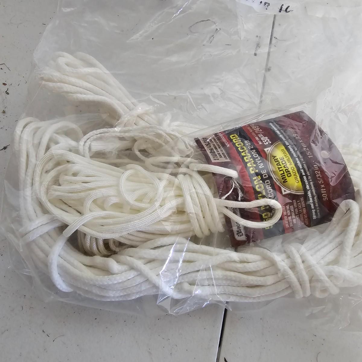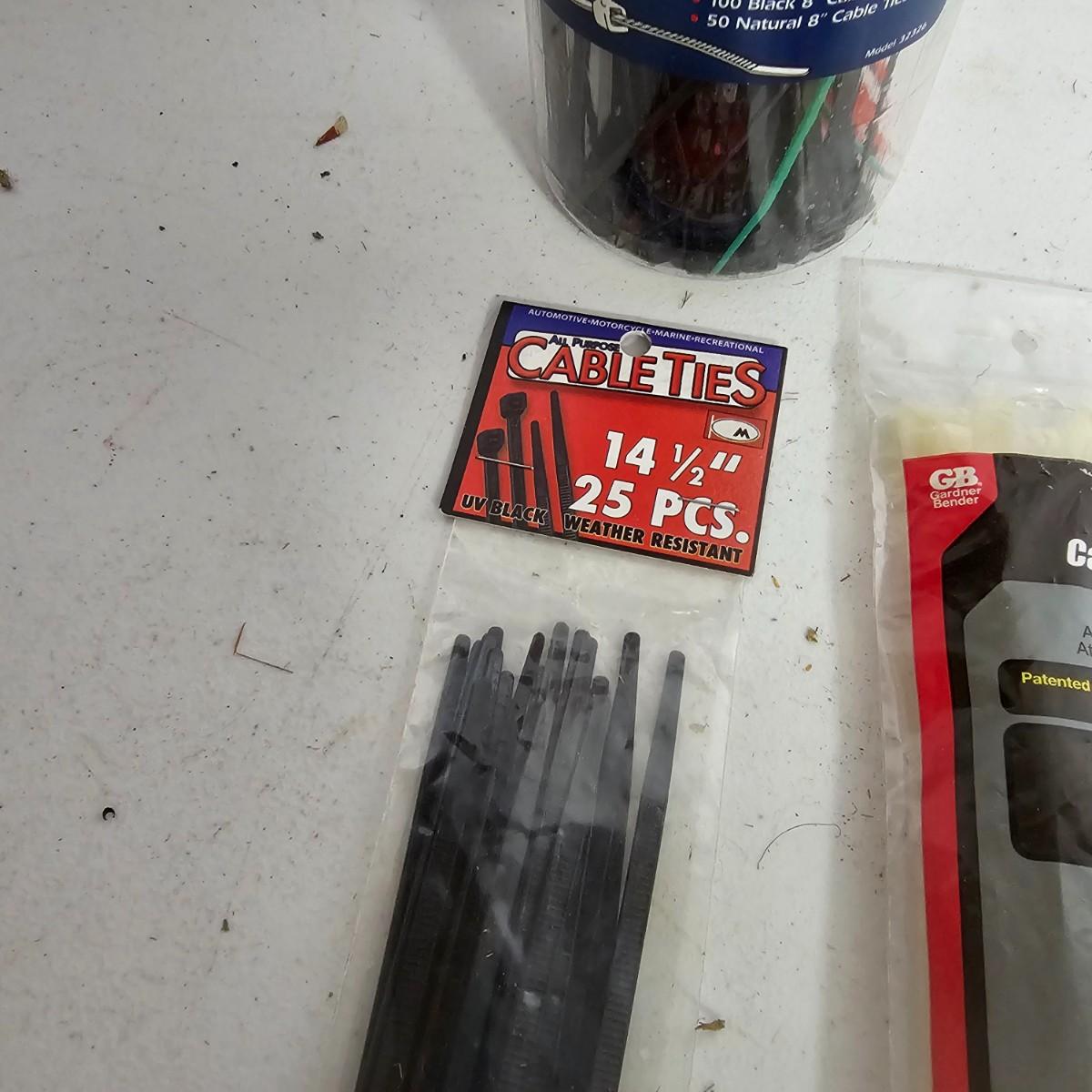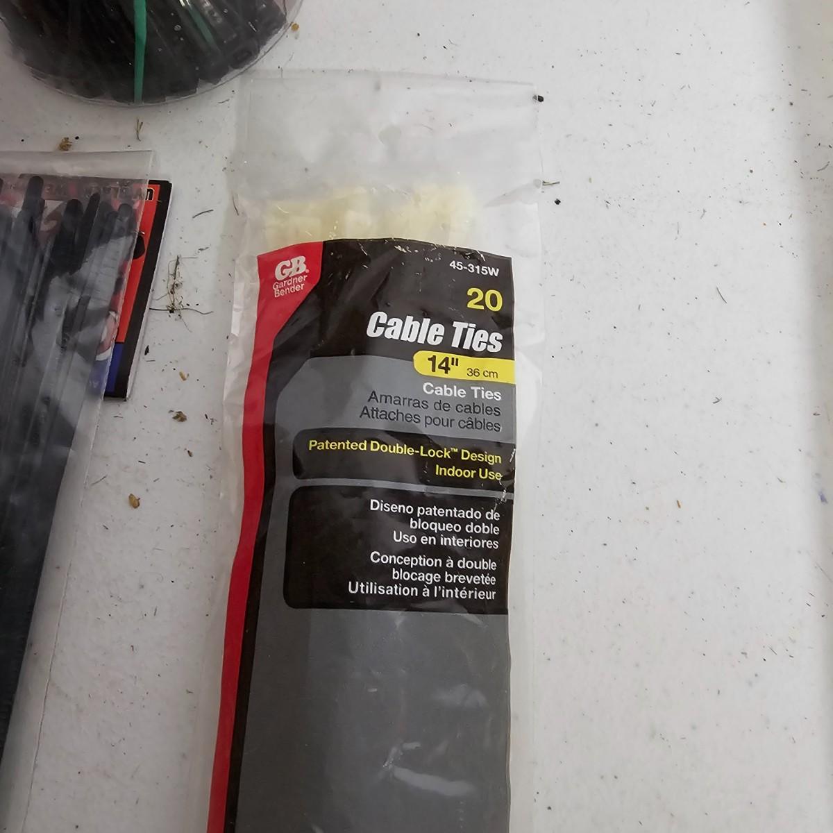 Various sizes and types of tying and binding material. Bungie cords, zip ties, adjustable straps, nylon and sisal rope. Not marked in length, but orange package is polyester binder twine that is 8"D x 9"H. Plastic crate included. See photos for details. Local pickup only.