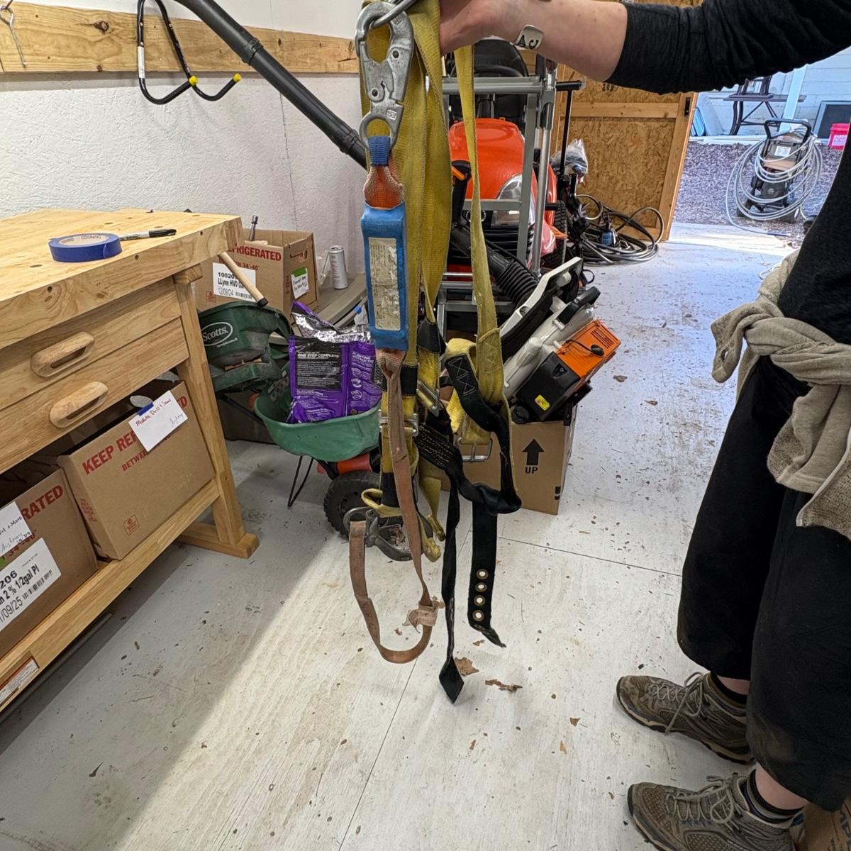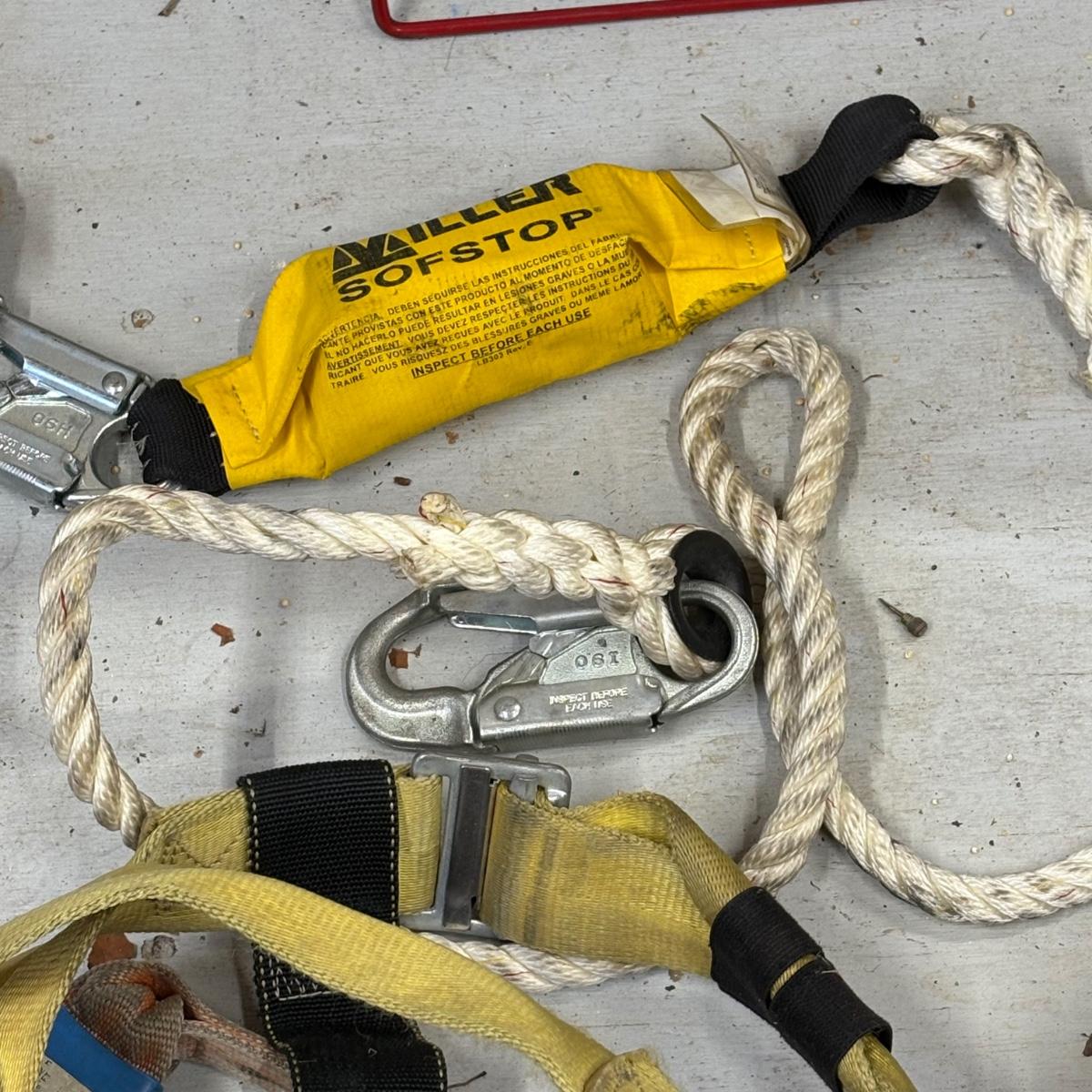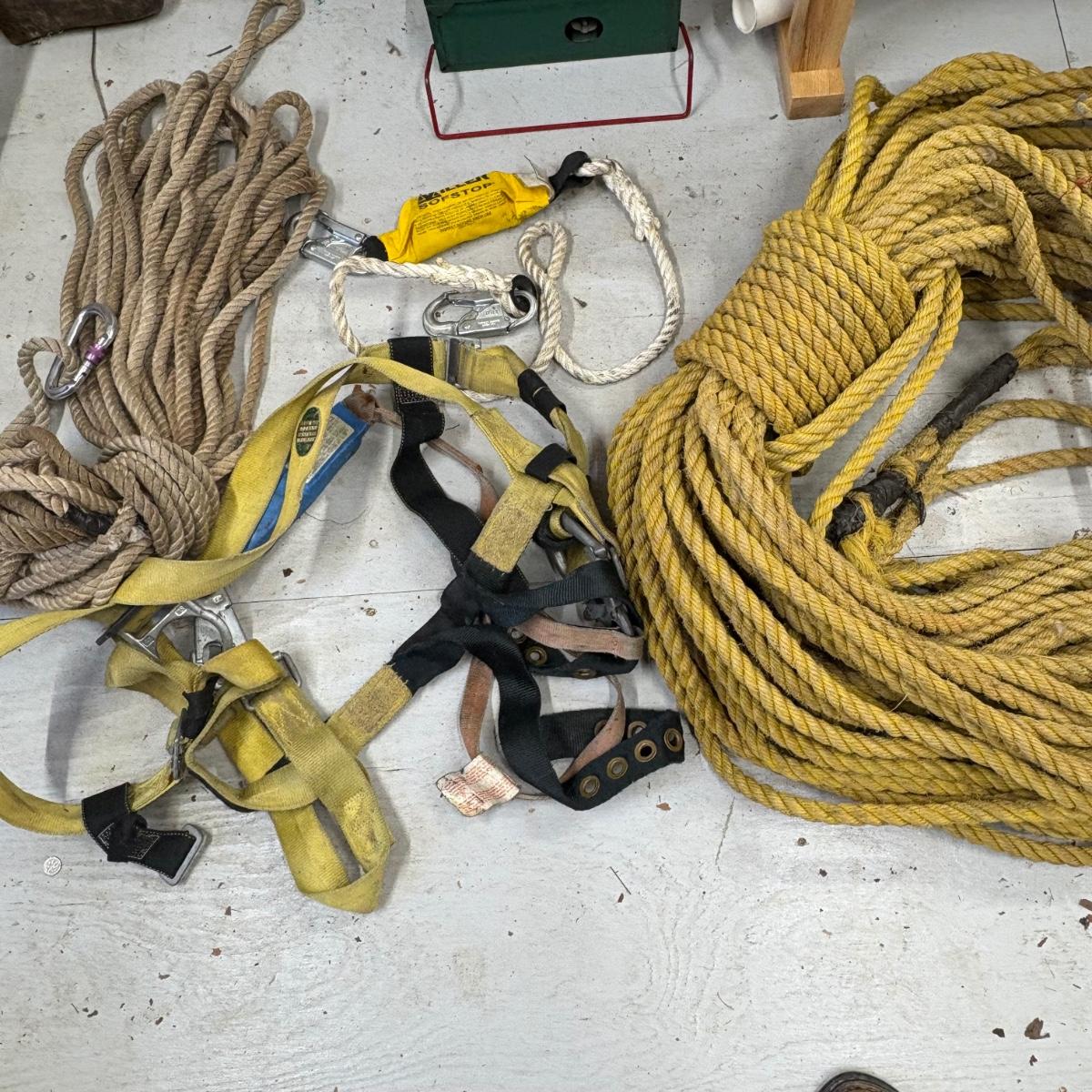 An assortment of ropes and a body harness, see pics for full inventory. Plastic tub is included.