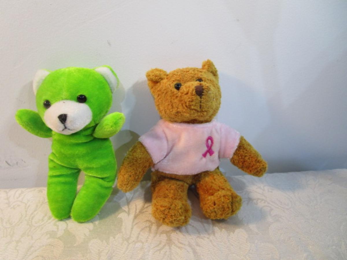 Rory is 9" tall & takes 2 AA batteries not included, biggest bear is 20" tall, breast cancer bear is 6-1/2", the green bear is 5-1/2", Monkey is 11" tall & has a tag See pictures