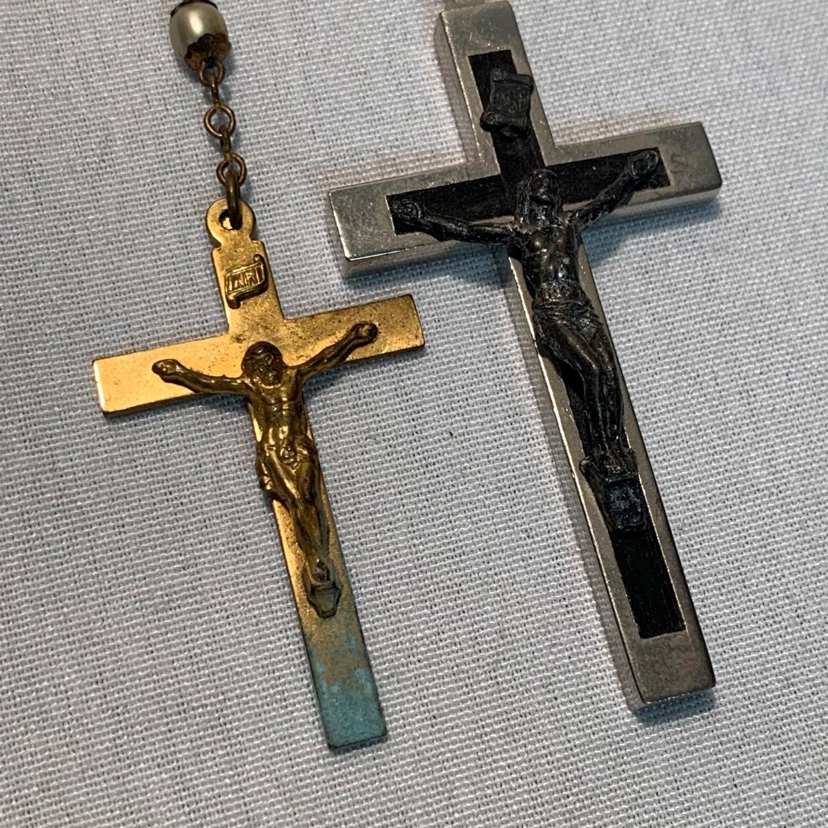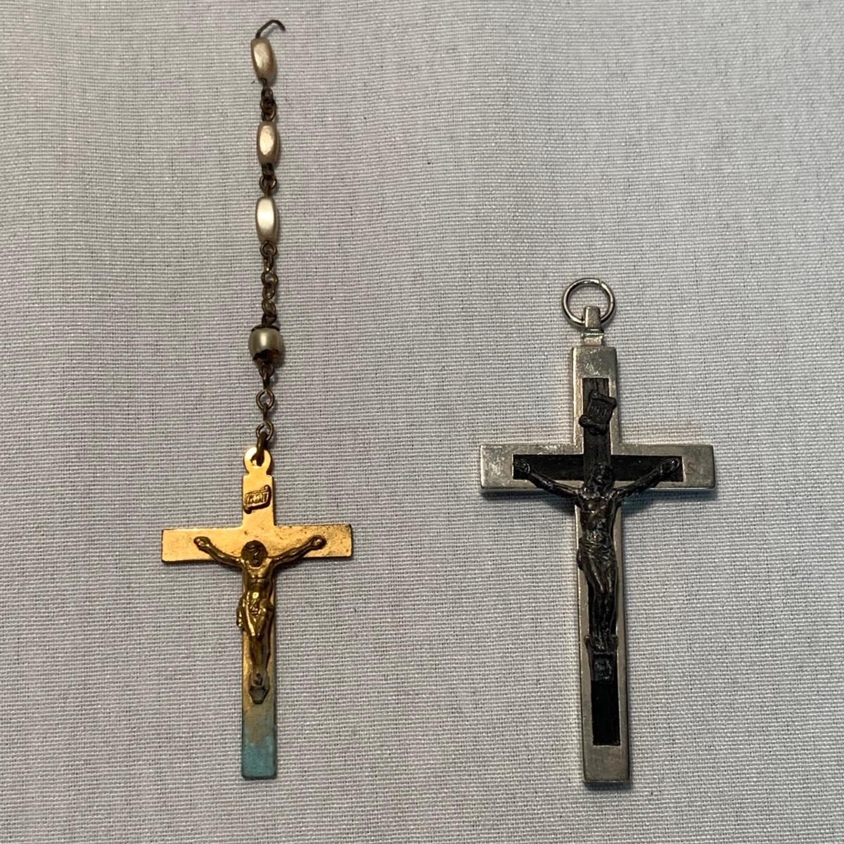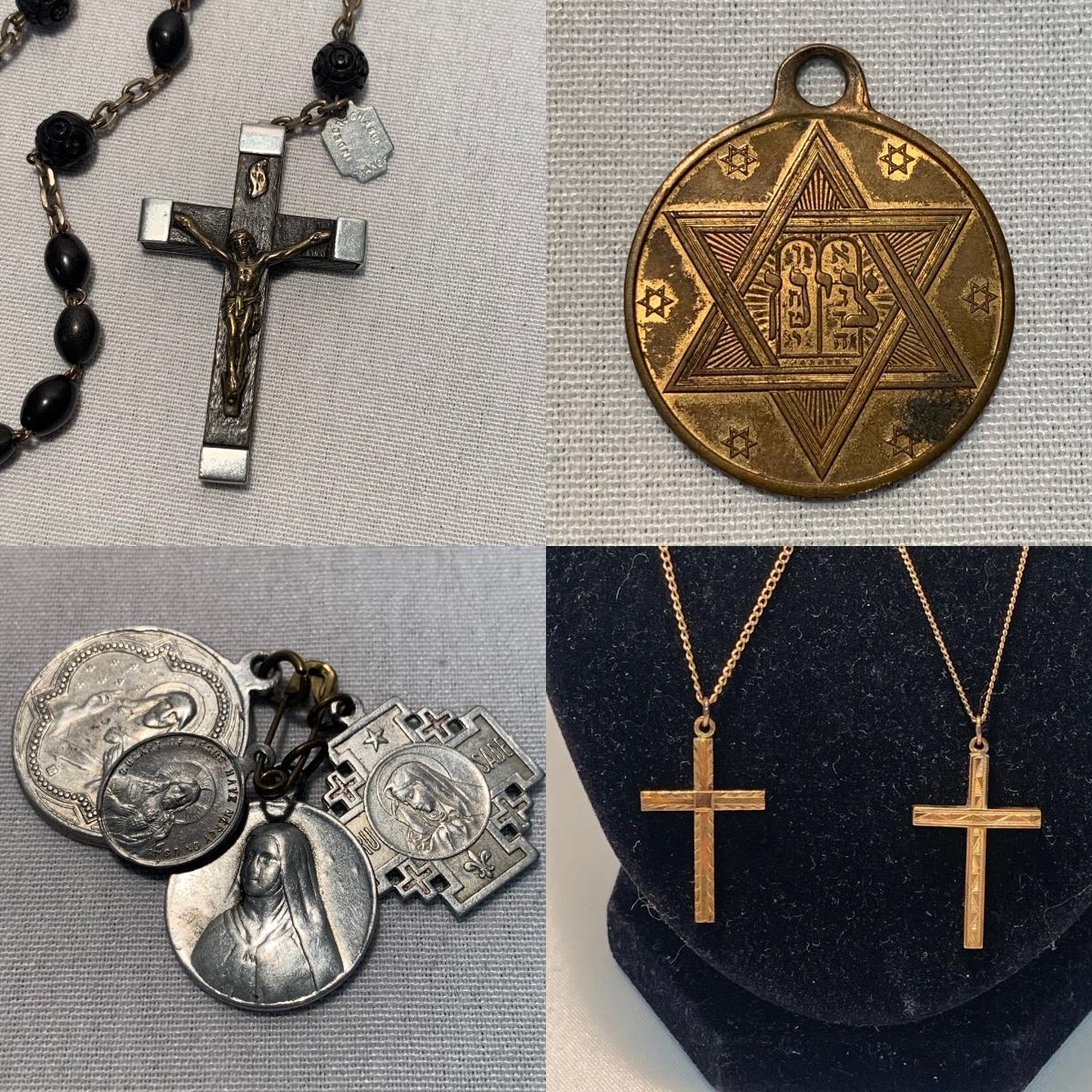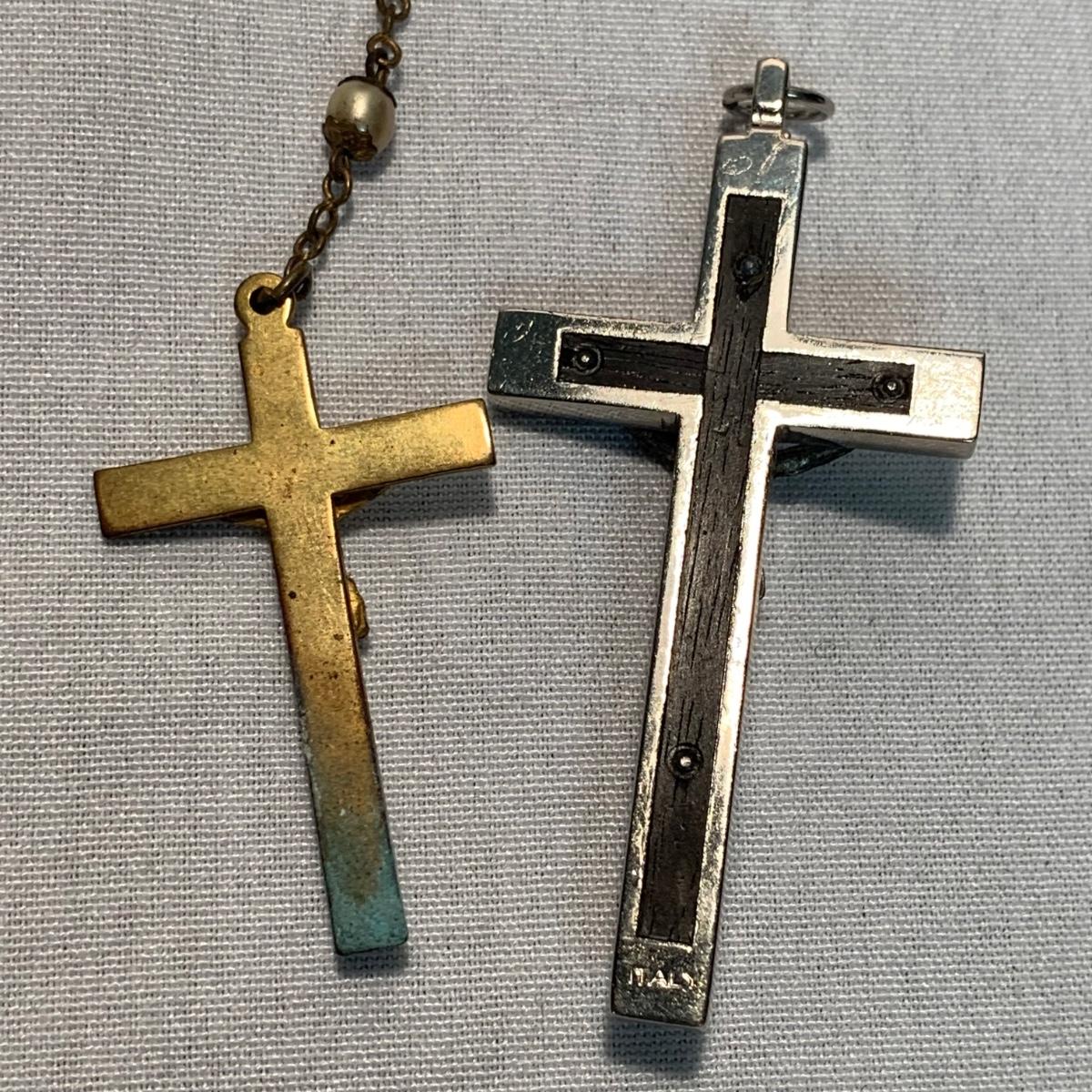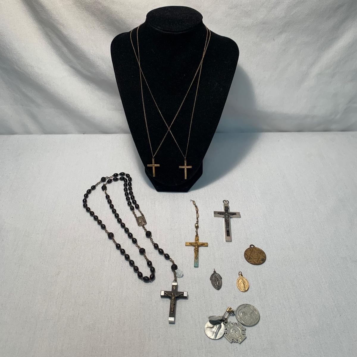 A collection of religious items, with one rosary, two gold cross pendants on necklace chains, and nine more pendants. The black and silver loose cross pendant is 1.5” x 2.5”. The necklace chains are 19“. Please see photos for inventory and all markings found.