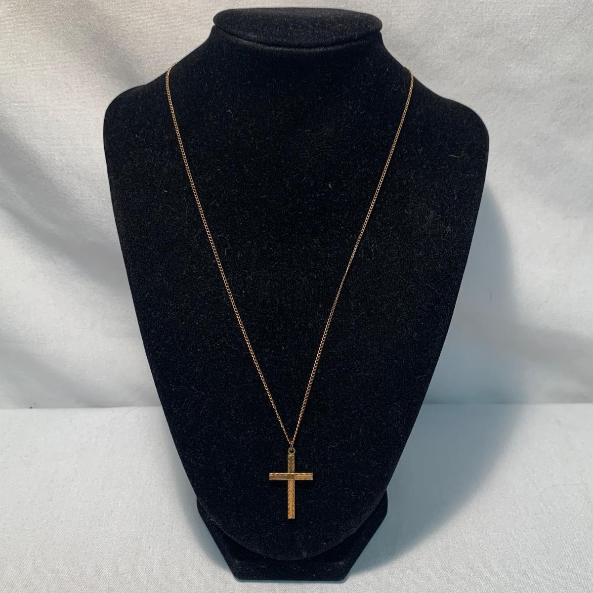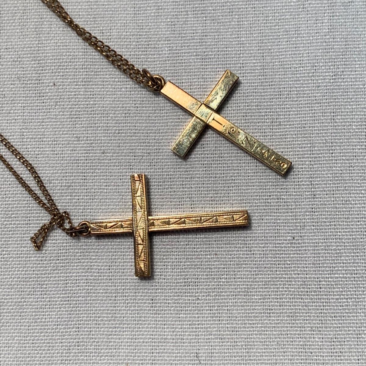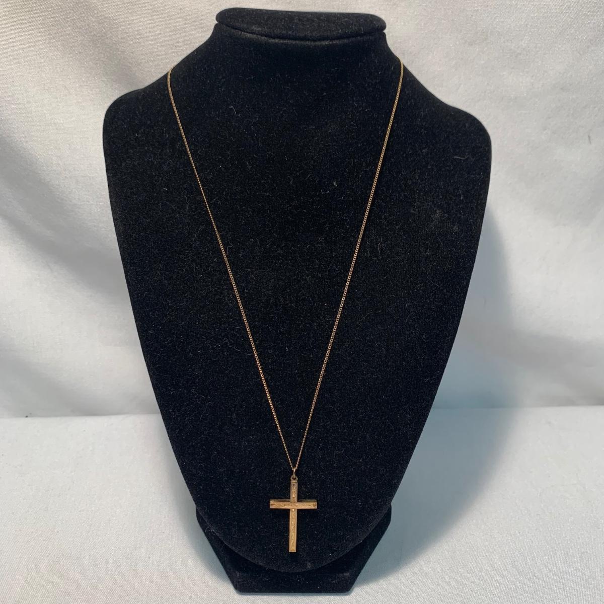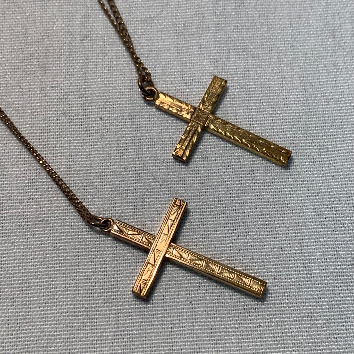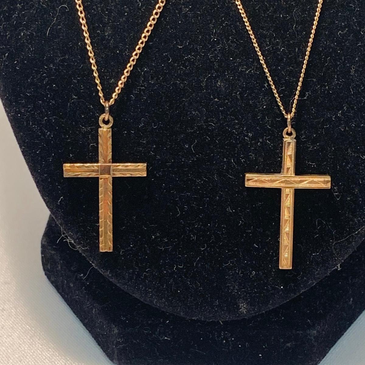 A collection of religious items, with one rosary, two gold cross pendants on necklace chains, and nine more pendants. The black and silver loose cross pendant is 1.5” x 2.5”. The necklace chains are 19“. Please see photos for inventory and all markings found.