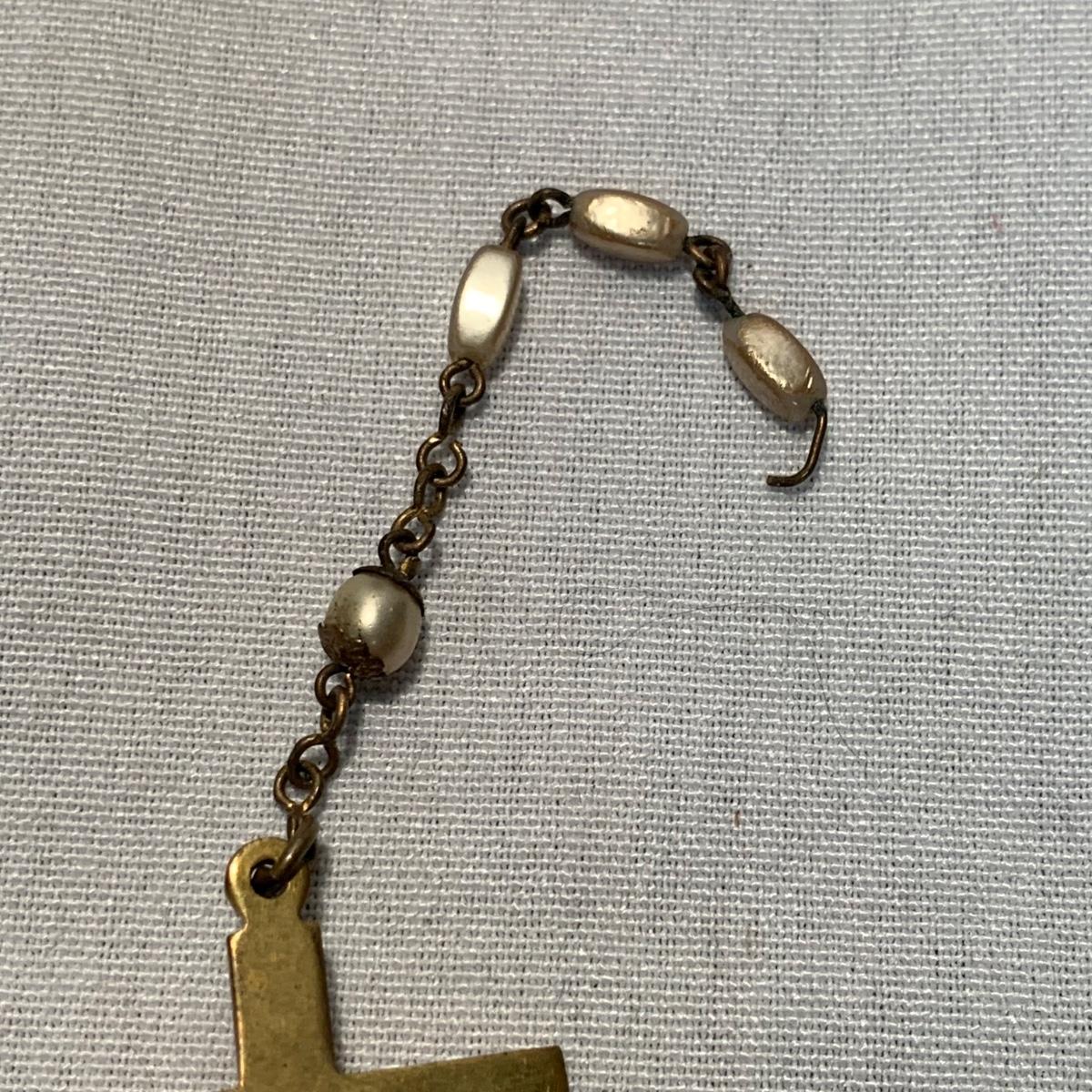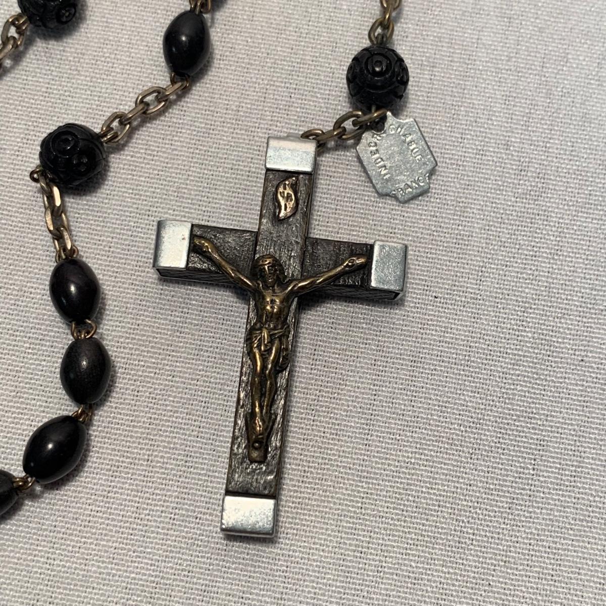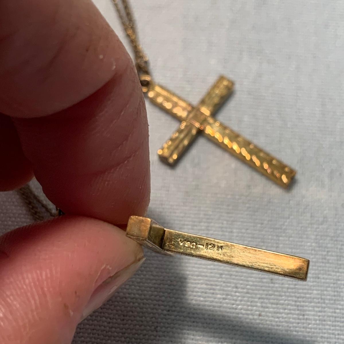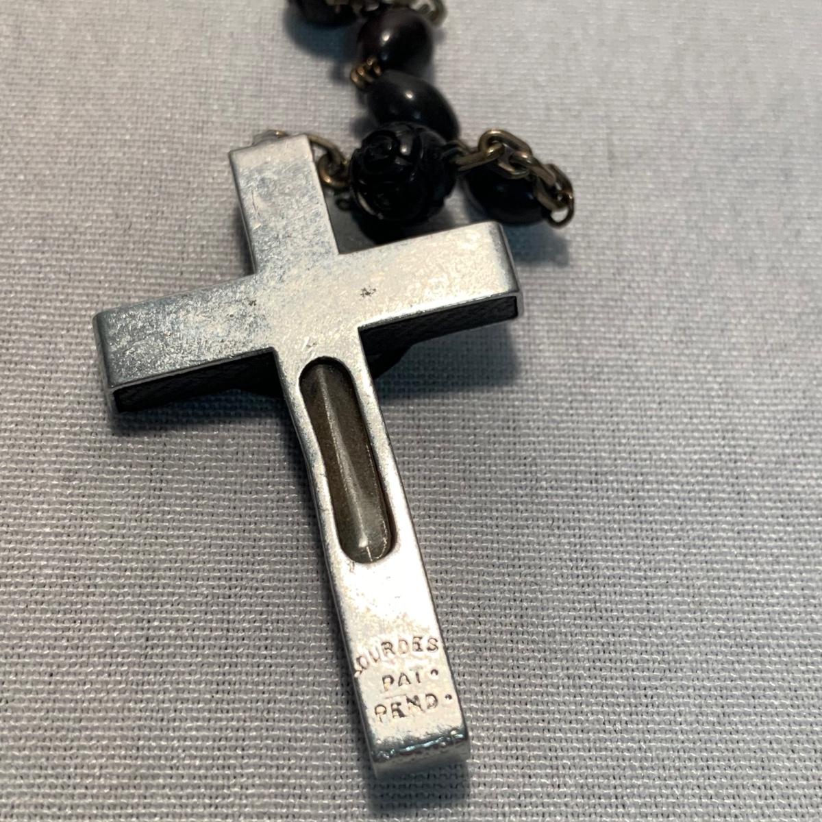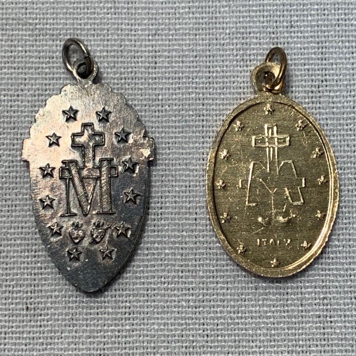 A collection of religious items, with one rosary, two gold cross pendants on necklace chains, and nine more pendants. The black and silver loose cross pendant is 1.5” x 2.5”. The necklace chains are 19“. Please see photos for inventory and all markings found.