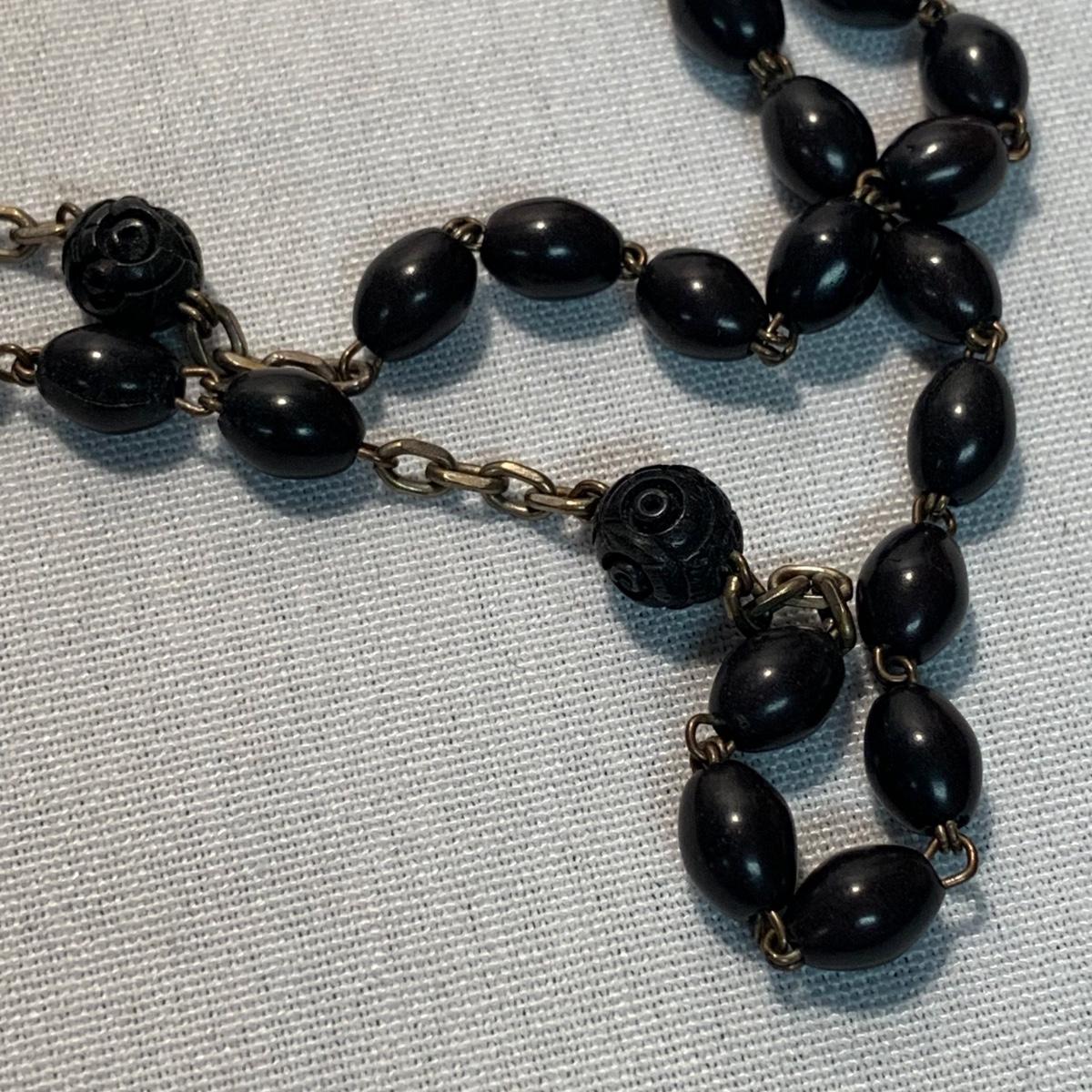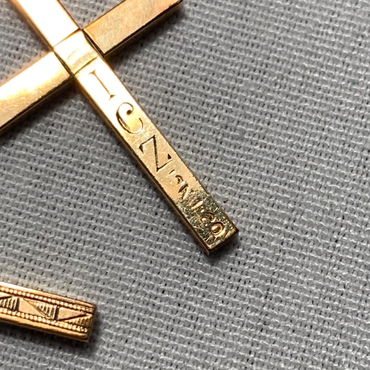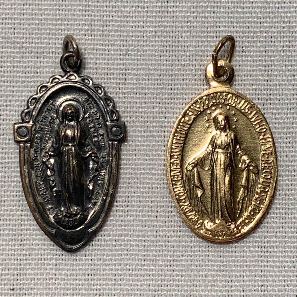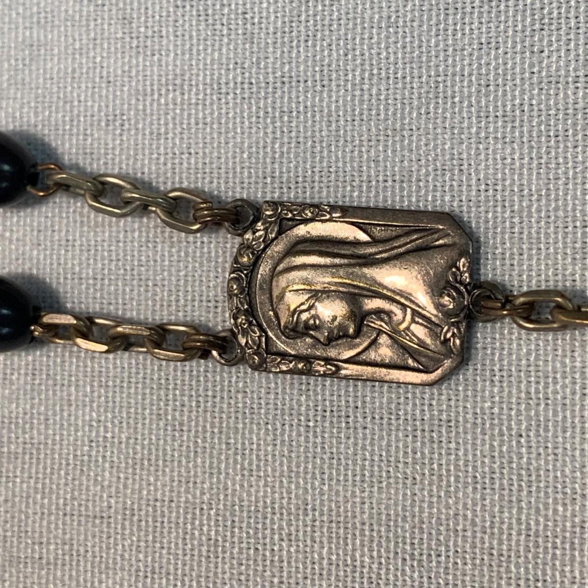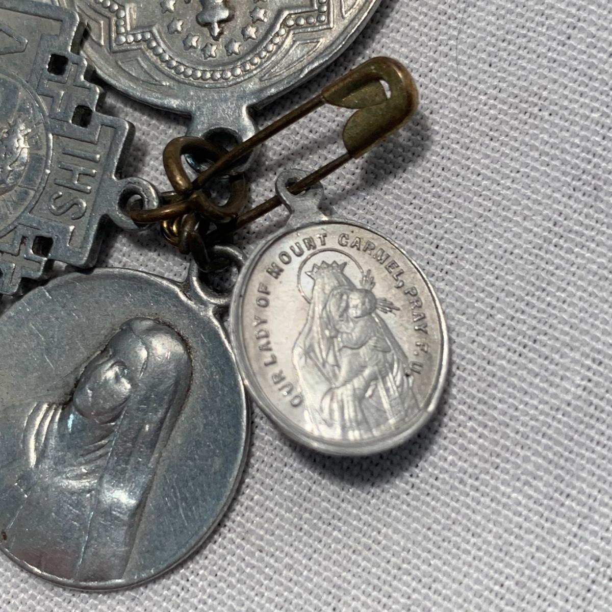 A collection of religious items, with one rosary, two gold cross pendants on necklace chains, and nine more pendants. The black and silver loose cross pendant is 1.5” x 2.5”. The necklace chains are 19“. Please see photos for inventory and all markings found.
