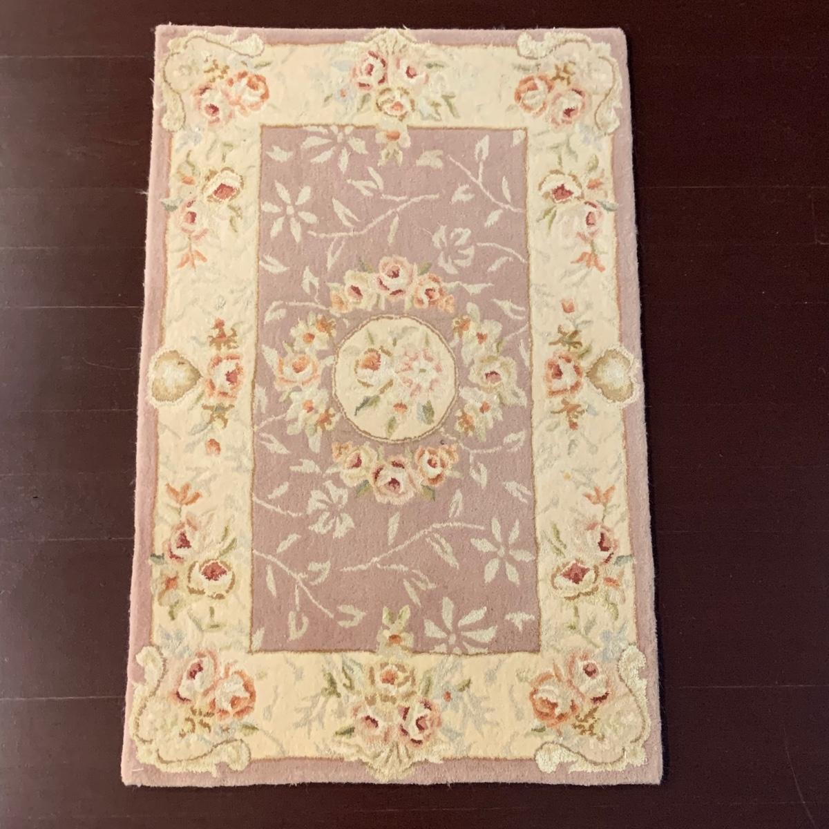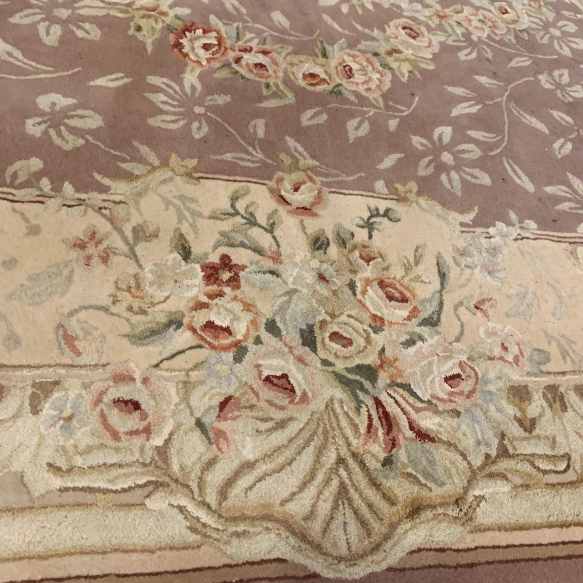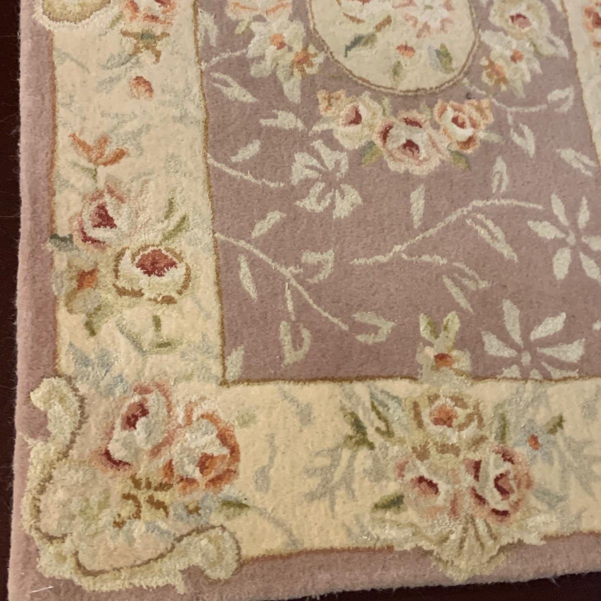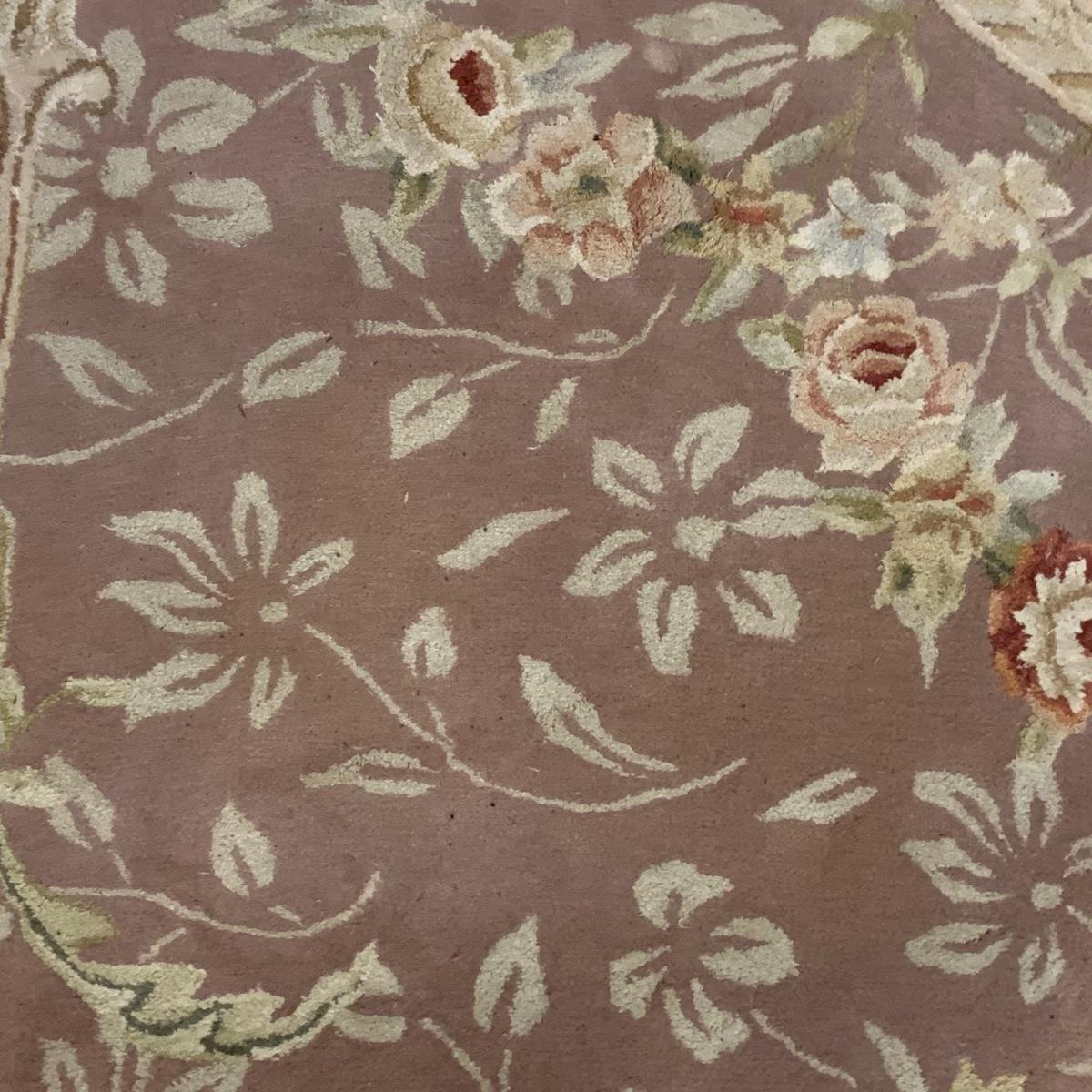 Two matching rose-themed rugs. The main colors of these rugs is ivory and dusty rose. The larger rug is 7’ 7.5” x 9’ 8”. The smaller is 2’ x 3’. The rugs feel quite soft. They will need to be vacuumed.