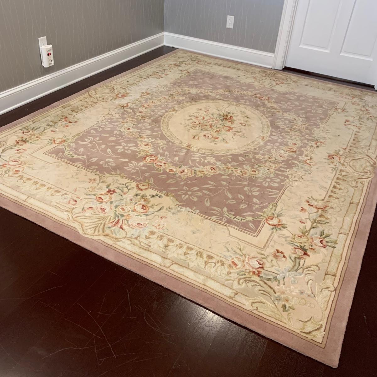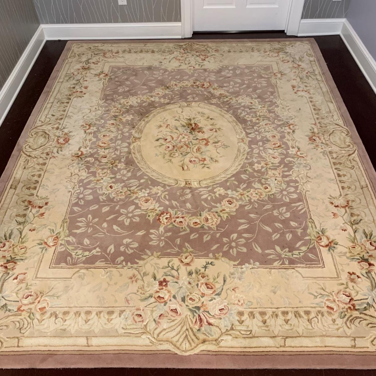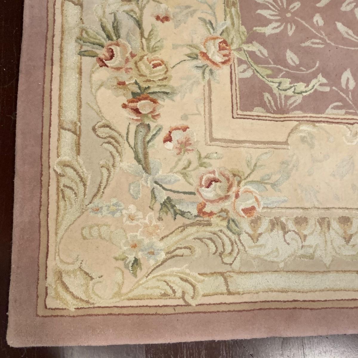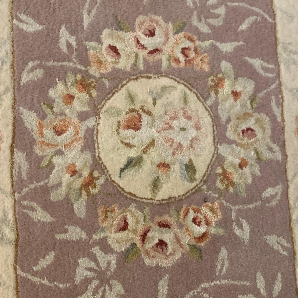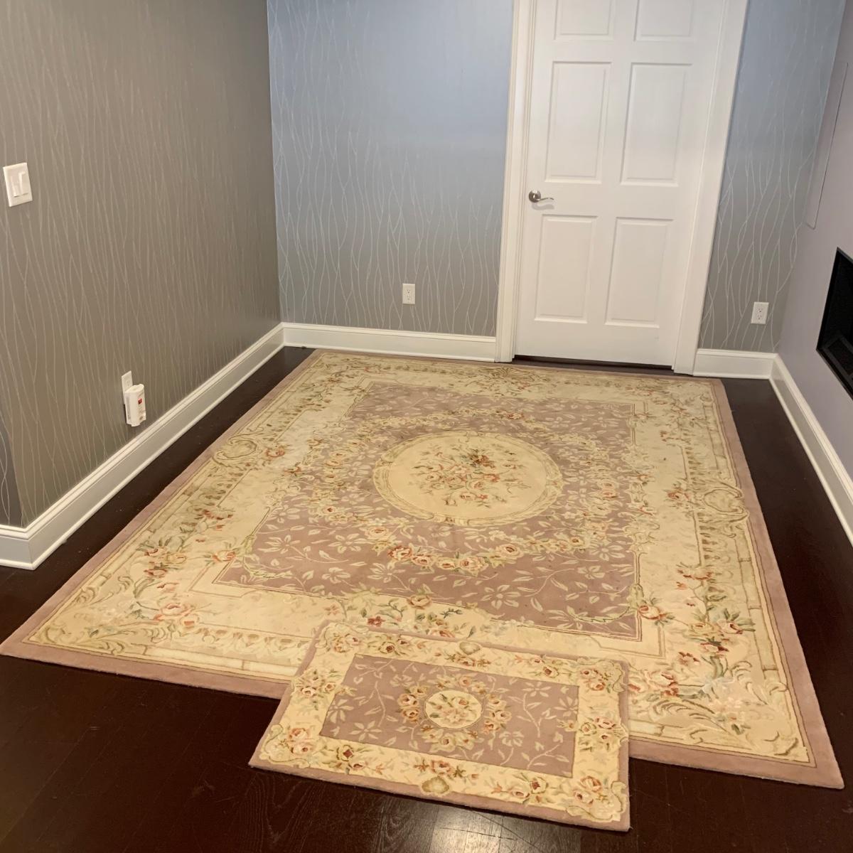 Two matching rose-themed rugs. The main colors of these rugs is ivory and dusty rose. The larger rug is 7’ 7.5” x 9’ 8”. The smaller is 2’ x 3’. The rugs feel quite soft. They will need to be vacuumed.