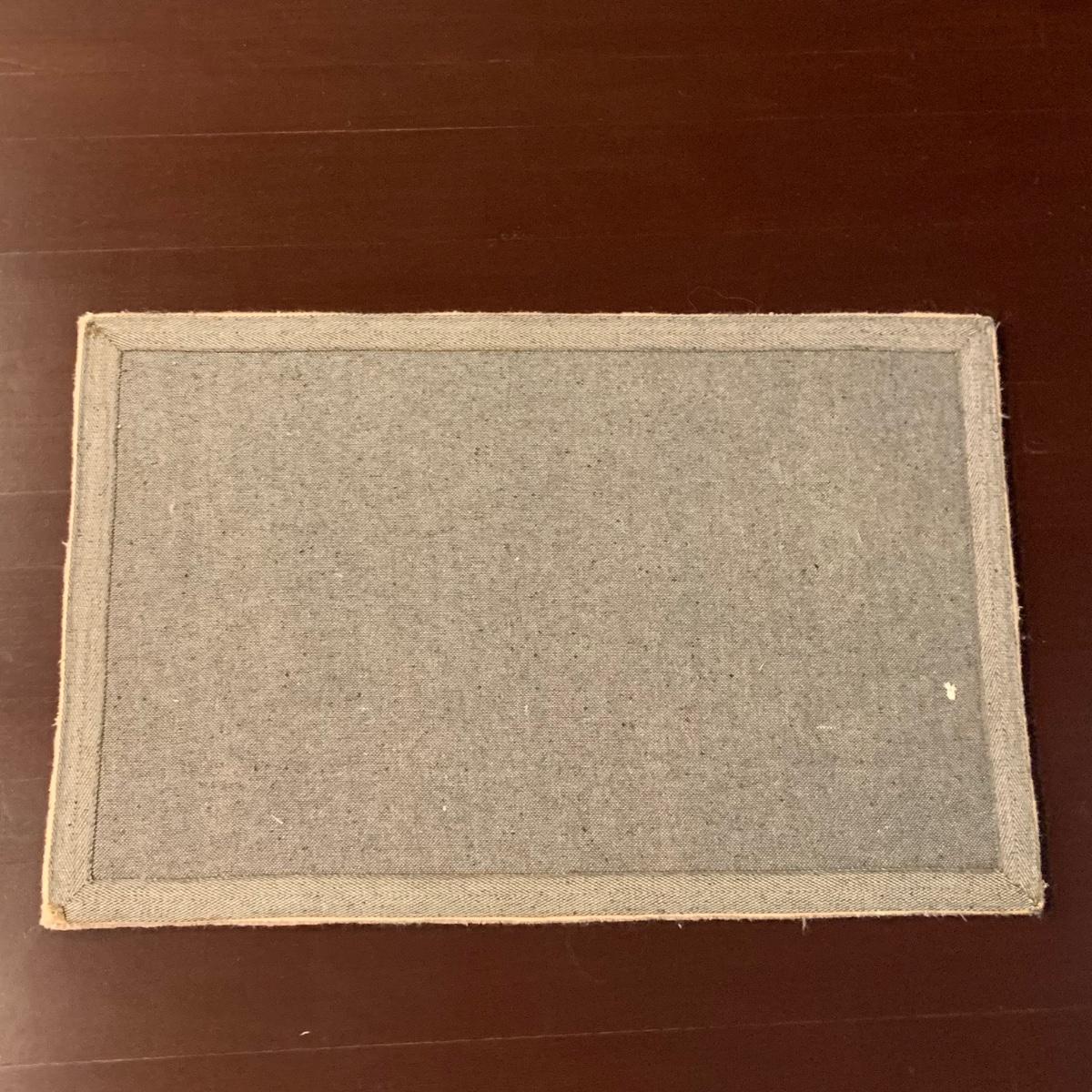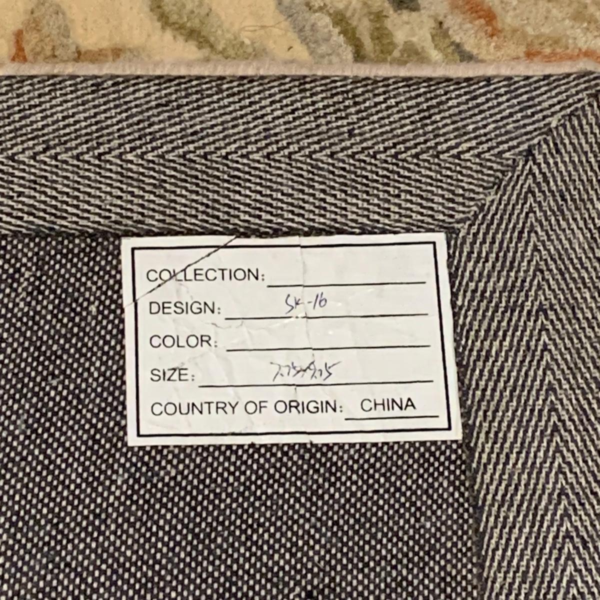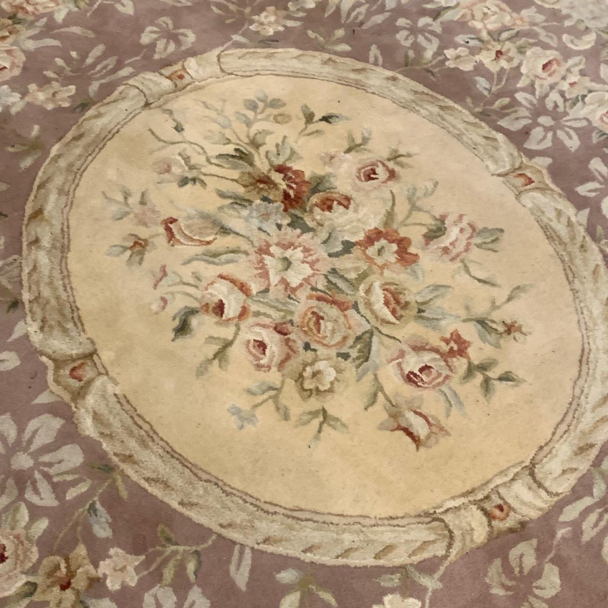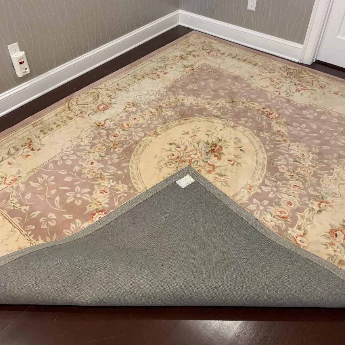 Two matching rose-themed rugs. The main colors of these rugs is ivory and dusty rose. The larger rug is 7’ 7.5” x 9’ 8”. The smaller is 2’ x 3’. The rugs feel quite soft. They will need to be vacuumed.