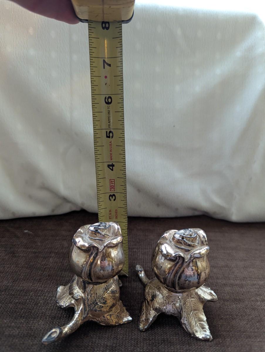 Lovely antique silver plated rose salt and pepper shakers. In good condition. Heavy.