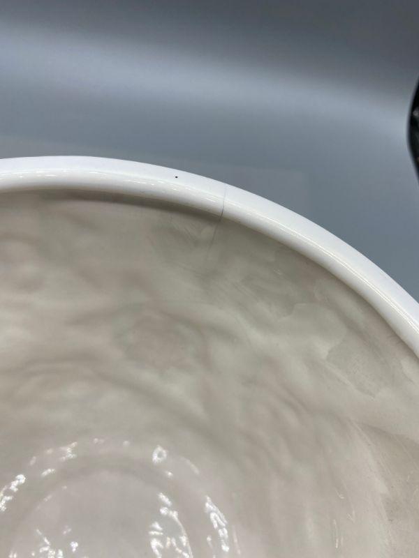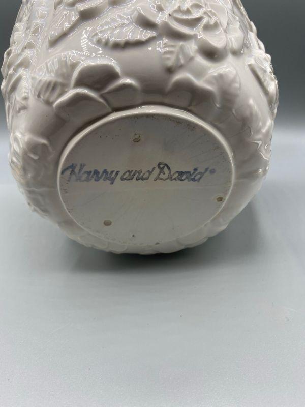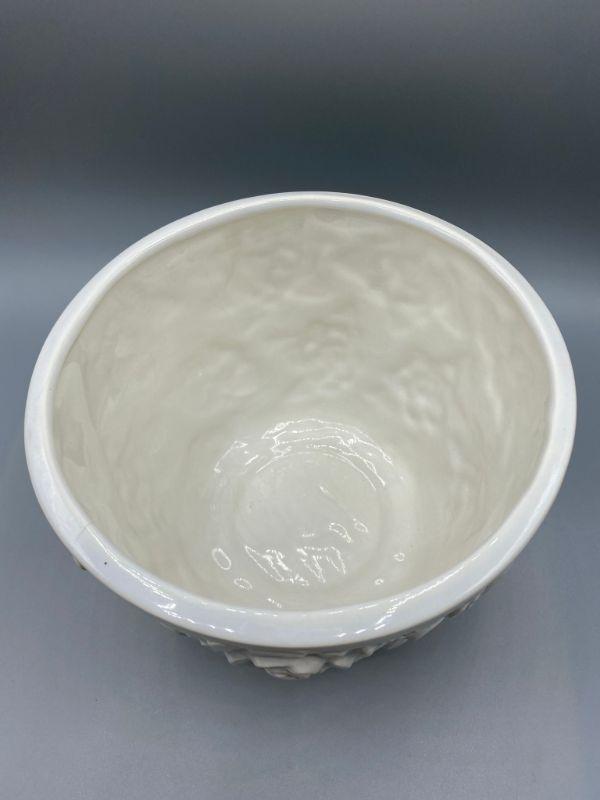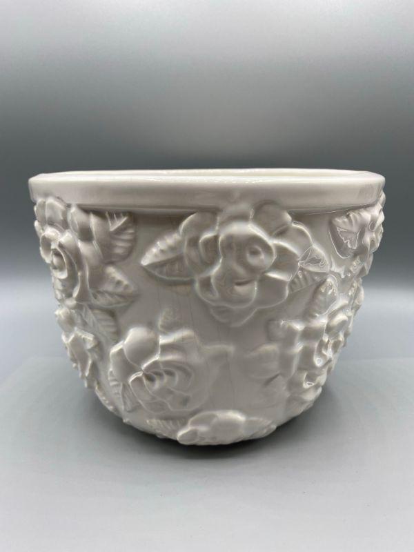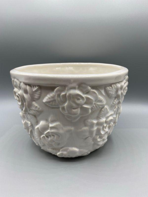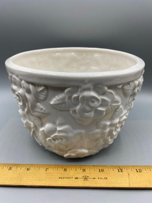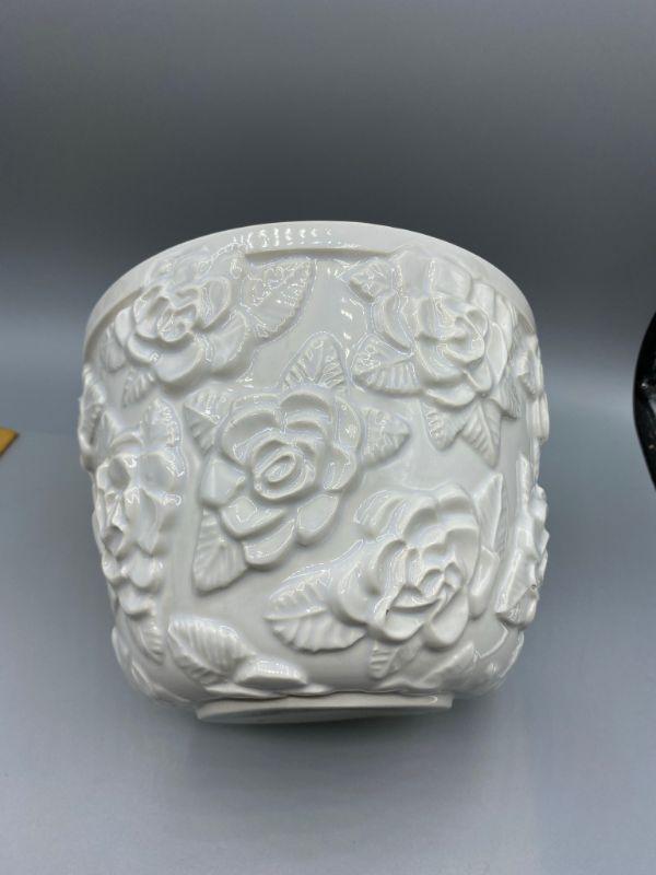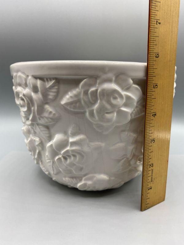 White ceramic rose embossed planter from Harry and David. Embossed rose pattern on a 6" pot. Good condition, displays nicely. Does have a fine line crack in rim.