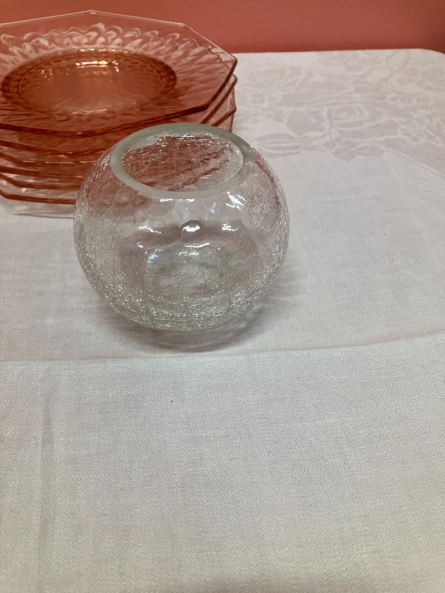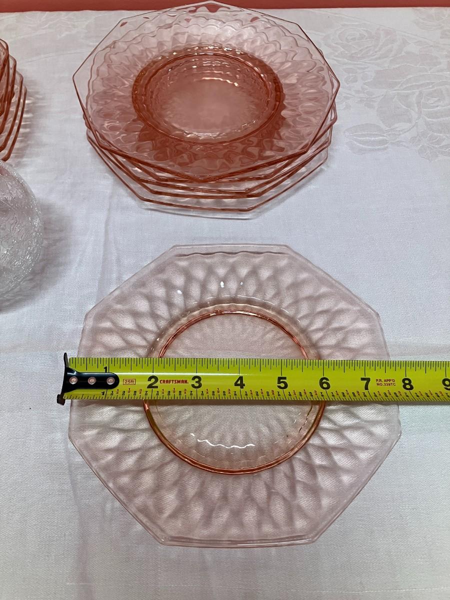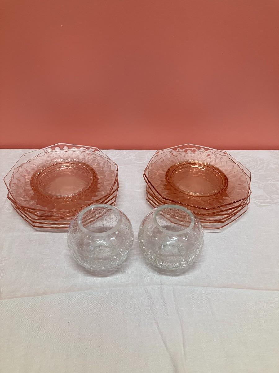 Set of 12 8" rose glass plates and 2 crackle clear glass votive holders