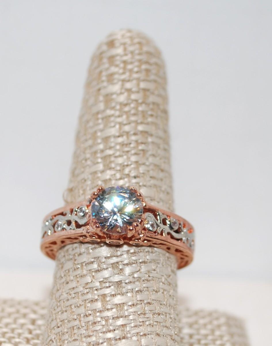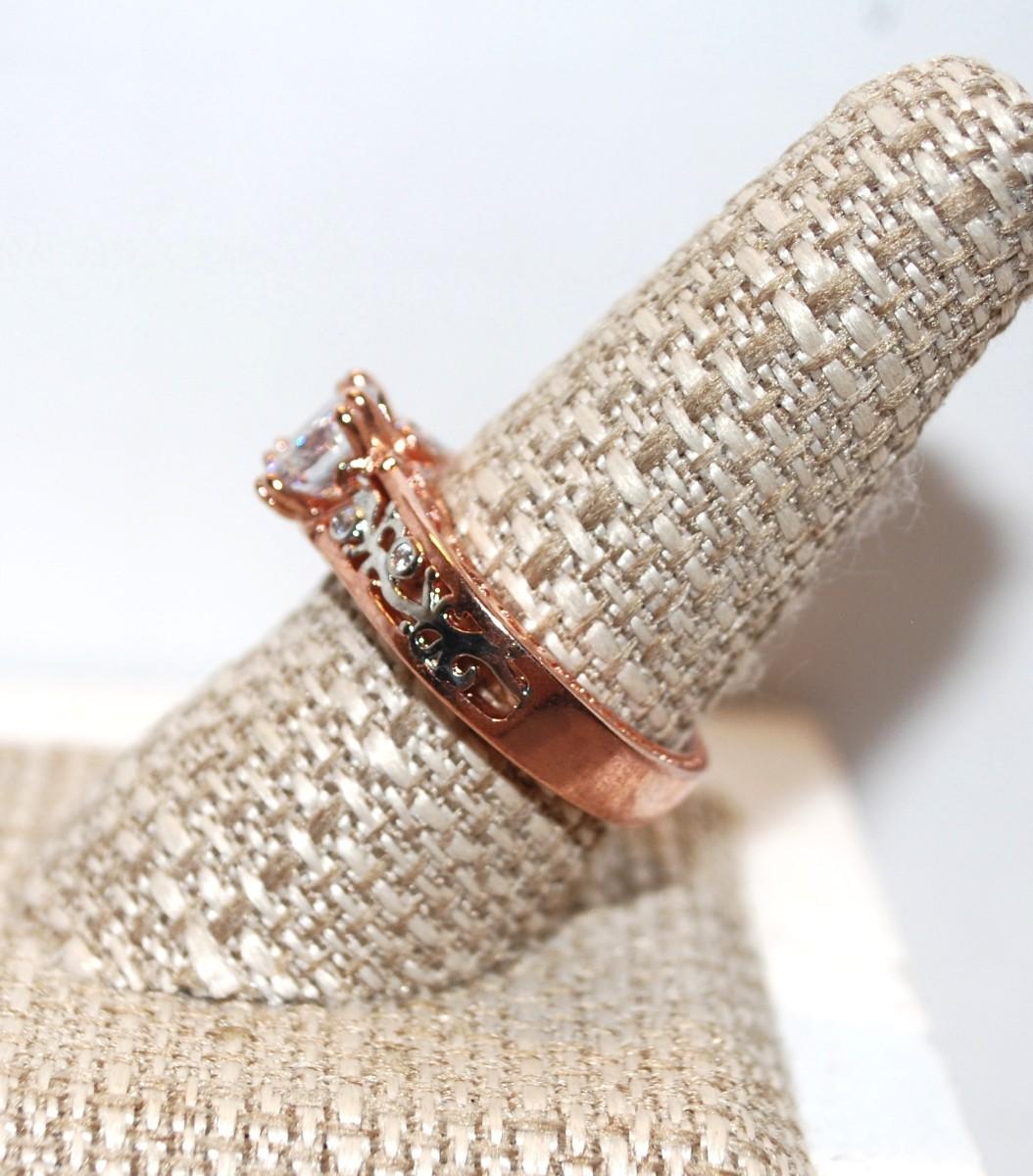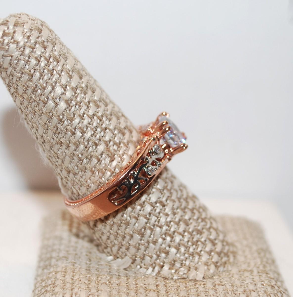 Size: 9½ Rose Gold Plated Ring with Round Cut Cubic Zirconia and 2 Smaller Stones on Each Size (5.1g)