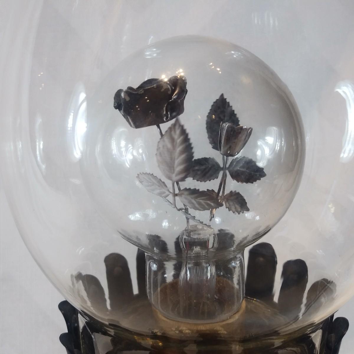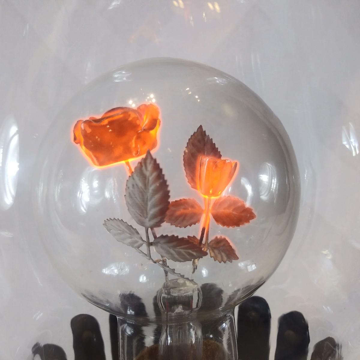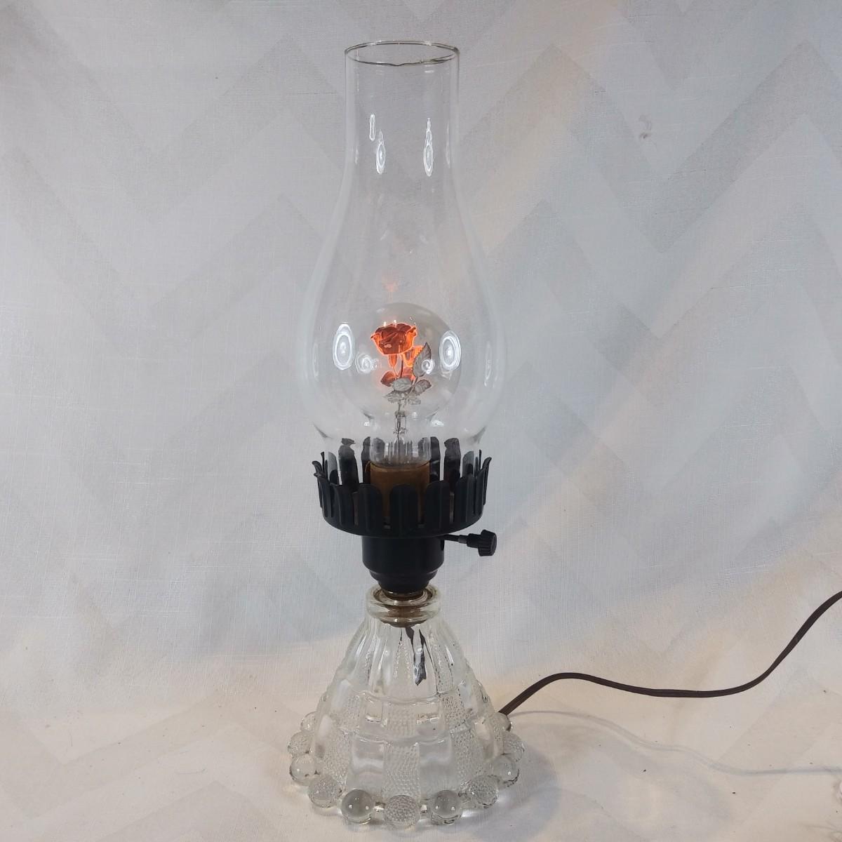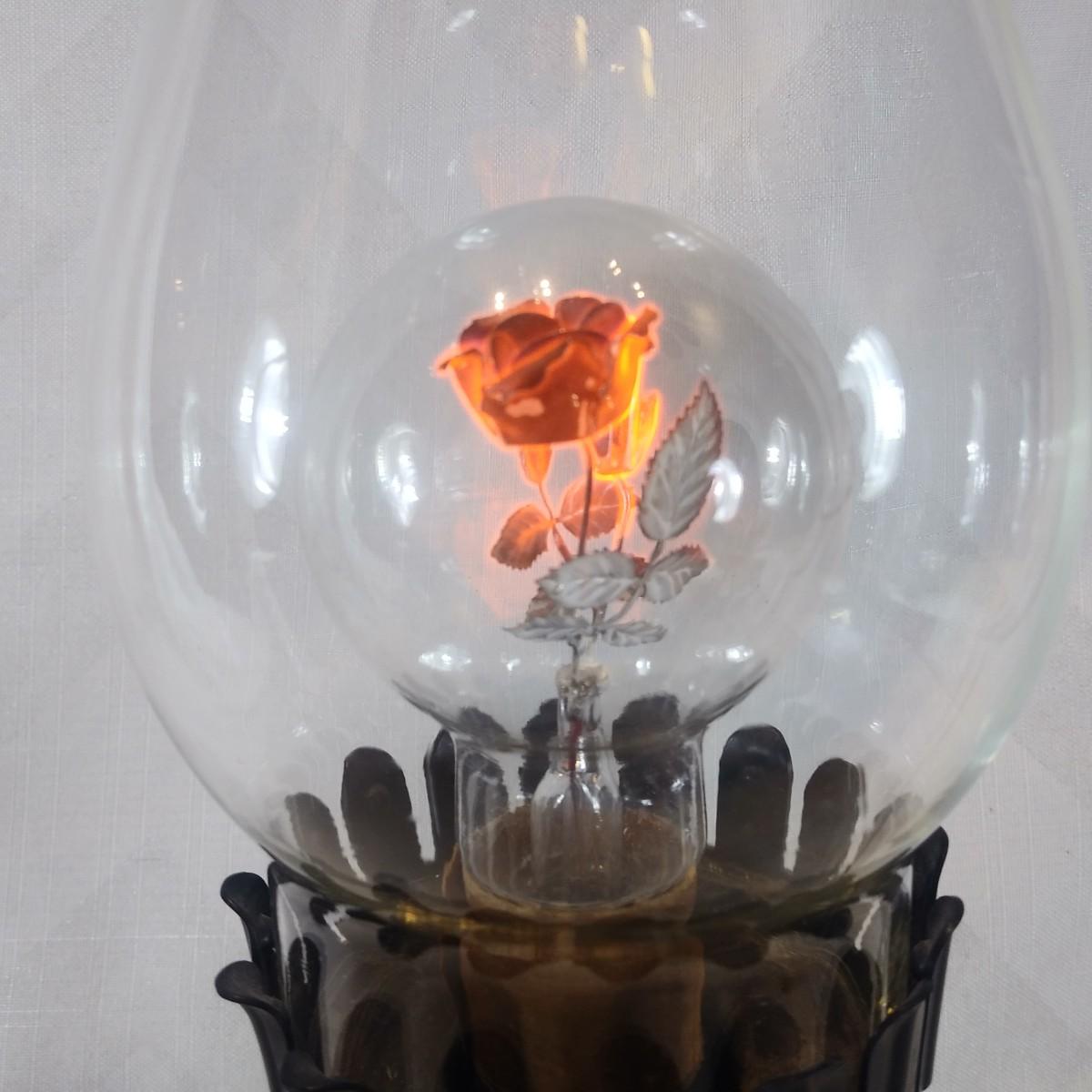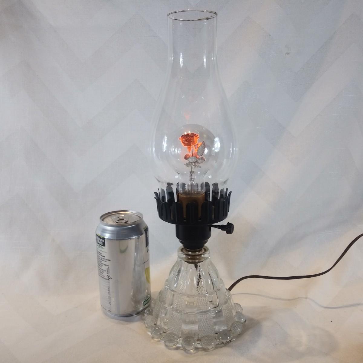 This auction lot is for a Rose Light Bulb Hurricane Lamp. This is an electrified hobnail based hurricane lamp. It is unmarked. The light bulb filaments are stemmed roses and light up a salmon pink color. Main picture shows the lit bulb. Local pick up only - will not ship due to fragile light bulb. It measures 14-inches tall.