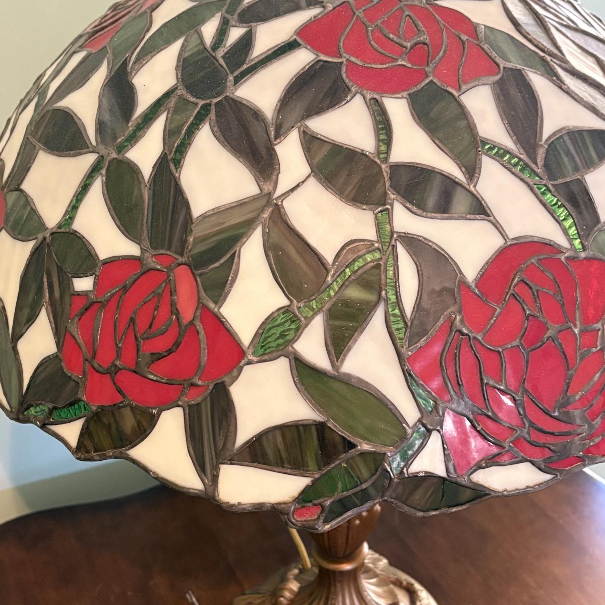 This vintage stained glass table lamp has a dome-shaped shade with red and green rose motifs. The base and body is an ornate gold finish. The approximate measurement of the base is 10"D and the shade is 22"D. The lamp stands at 28"H.