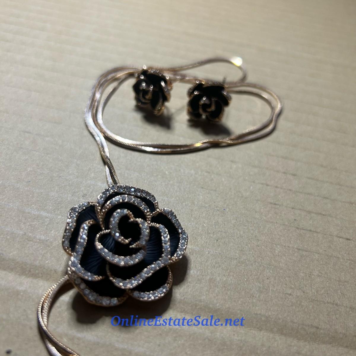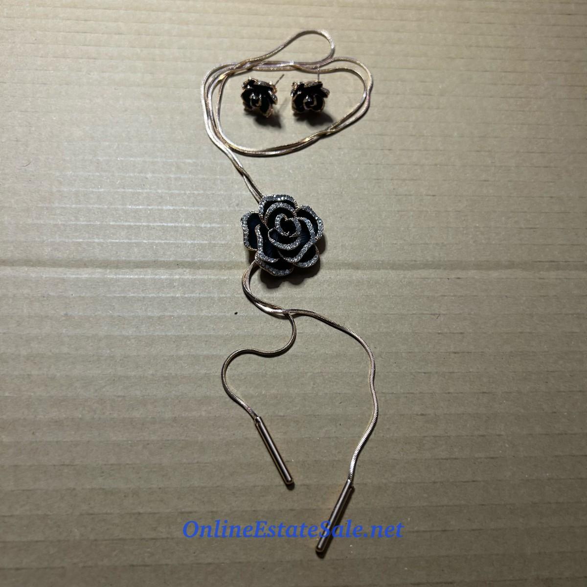 20in Gold Chain with Black Rose Pendant with Rhinestone Detail and Matching Earrings