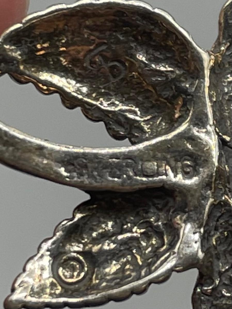 This item is in great condition. On the back in very tiny letters, it says “sterling.” There is no obvious damages and the sharp part of the item opens and closes great.