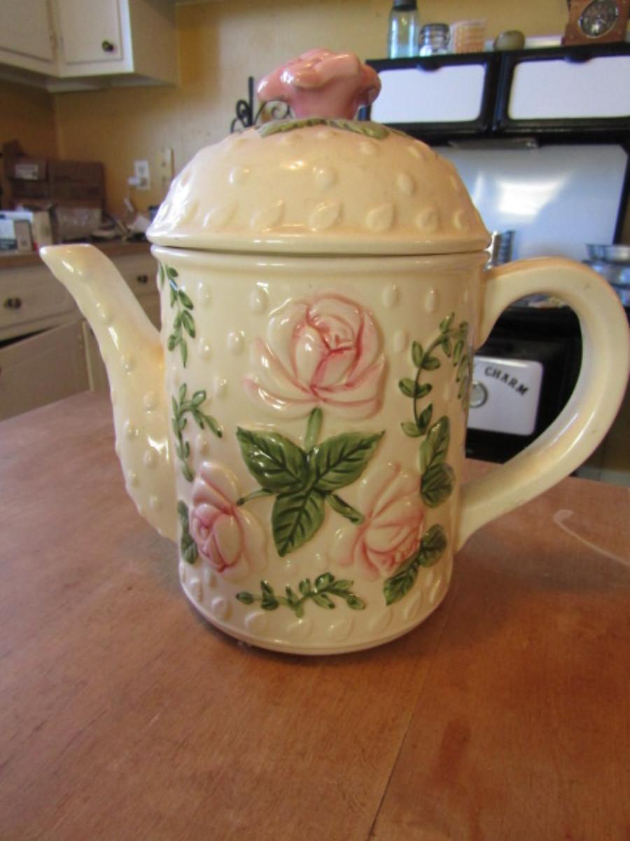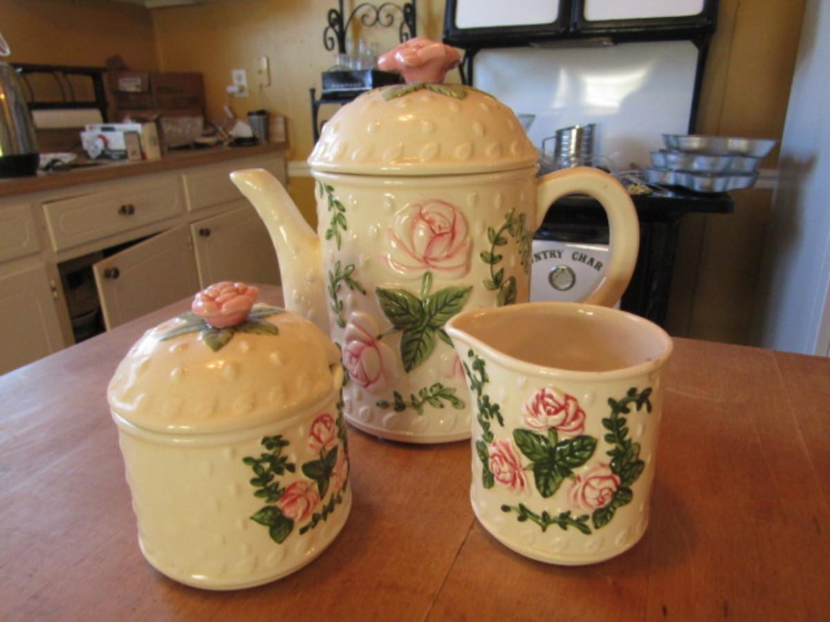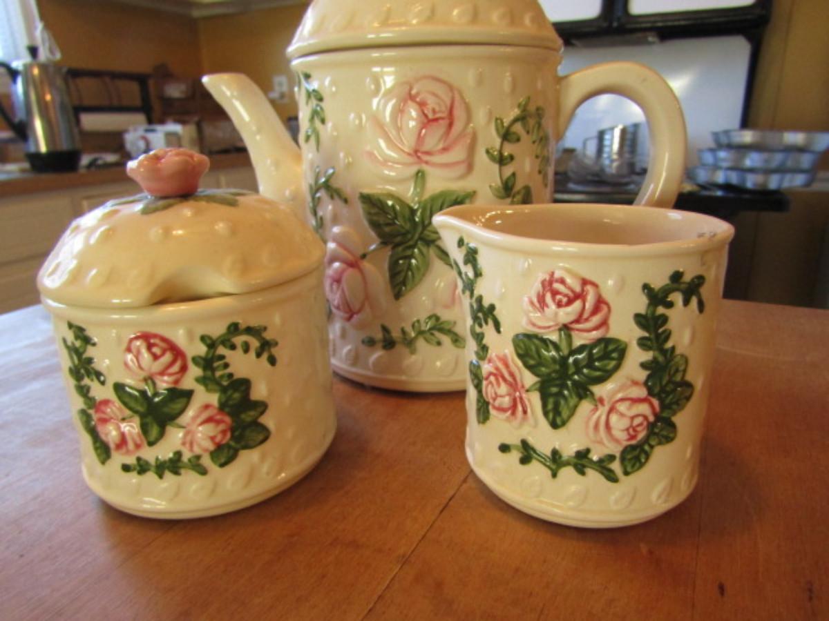 Rose Theme Ceramic Coffee Pot with Creamer and Covered Sugar Bowl