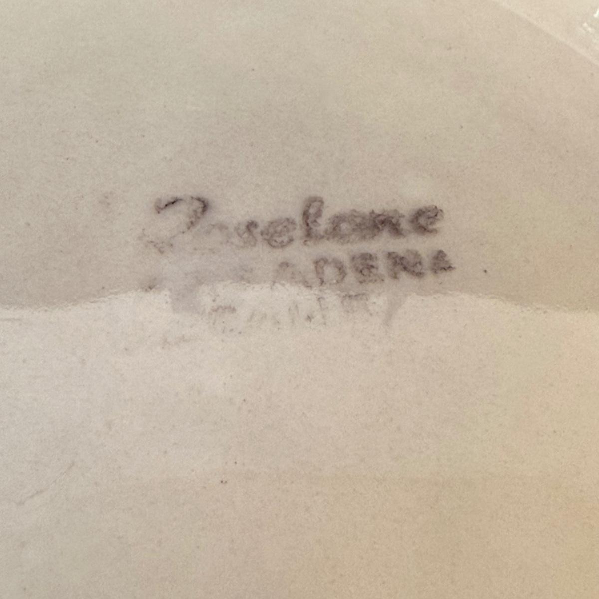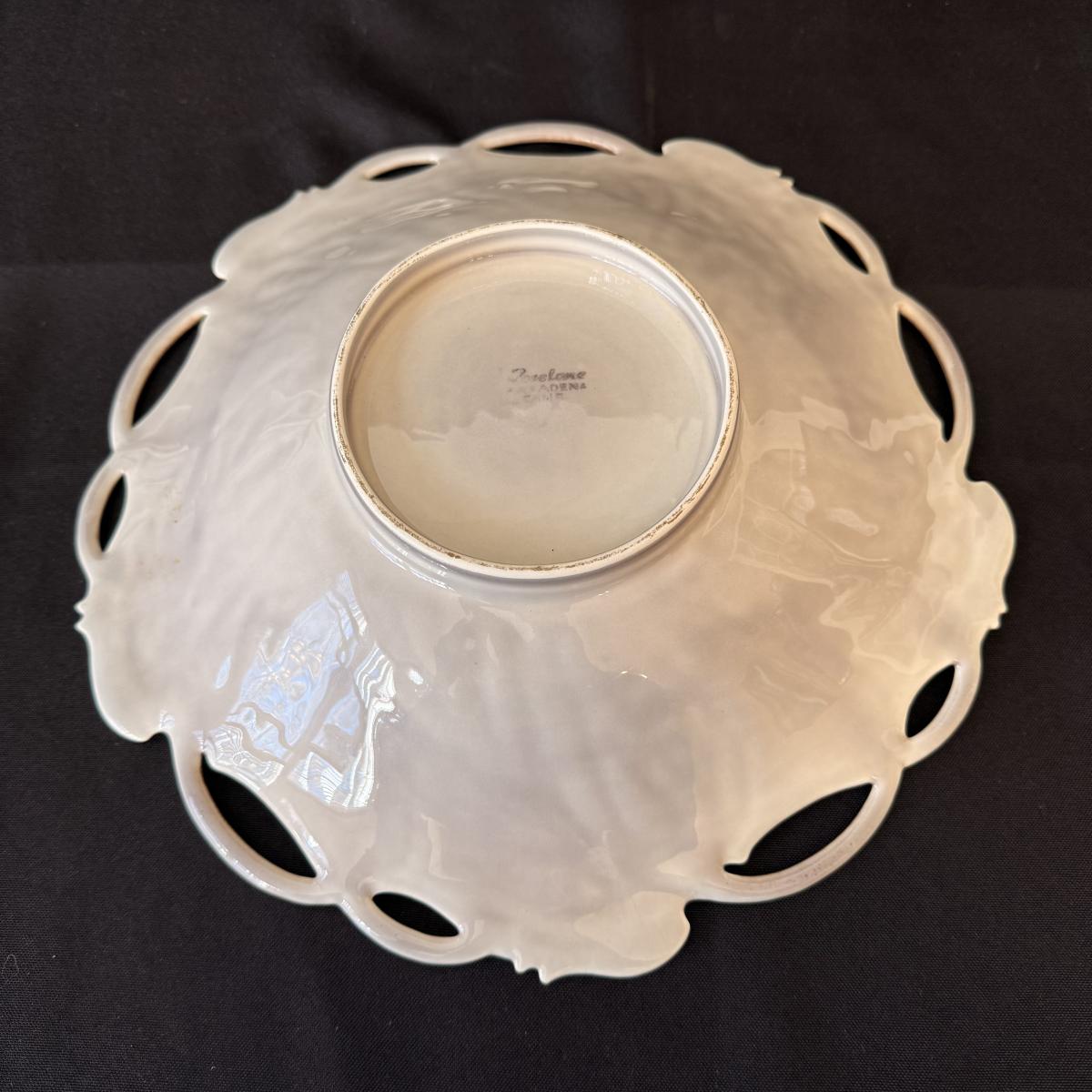 These three sweet pottery pieces include a leaf design dish stamped “Roselane Pasadena”, a leaf adorned bowl stamped with”Emerson Creek Pottery, Bedford Virginia”, and a tile stamped “AI” signifying artist Anne Isaac. The leaf dish is 11.5”D x 2.5”H. The display stand with the tile is included.