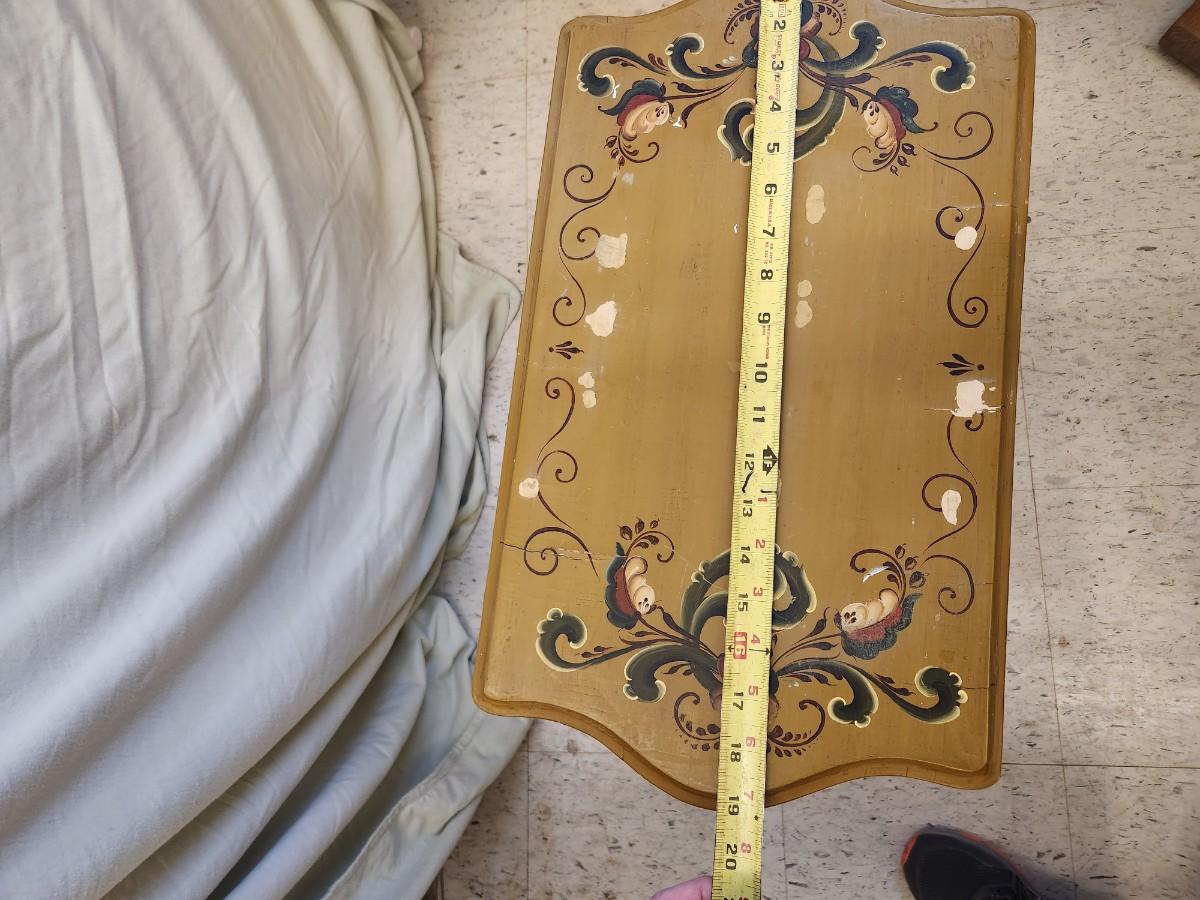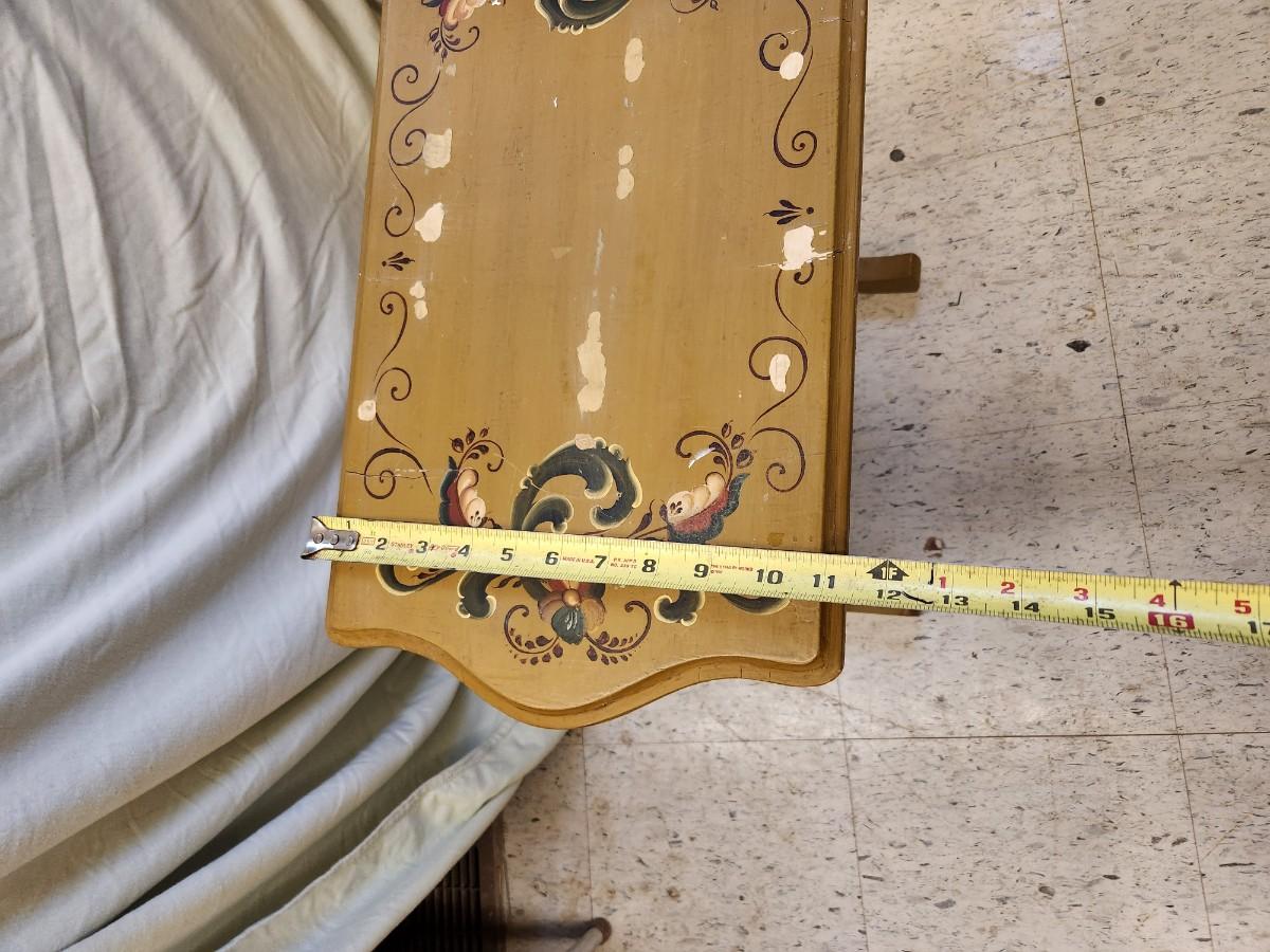 Top damage but I really think it could be repaired. The rest of the piece is spectacular and a super unusual color for rosemaling.