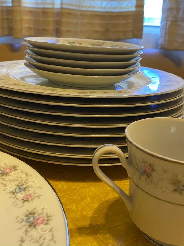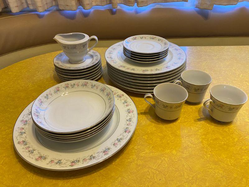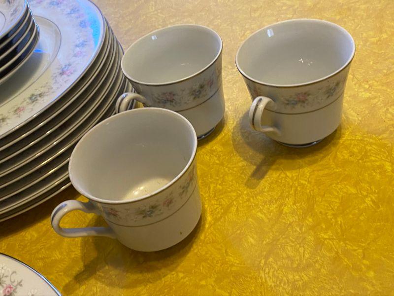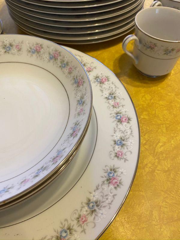 Vintage "M" Fine China in Rosemary. Pink & blue floral pattern with silver accent. Not a complete set. Photographed pieces are in good condition, free of chips or damage.
