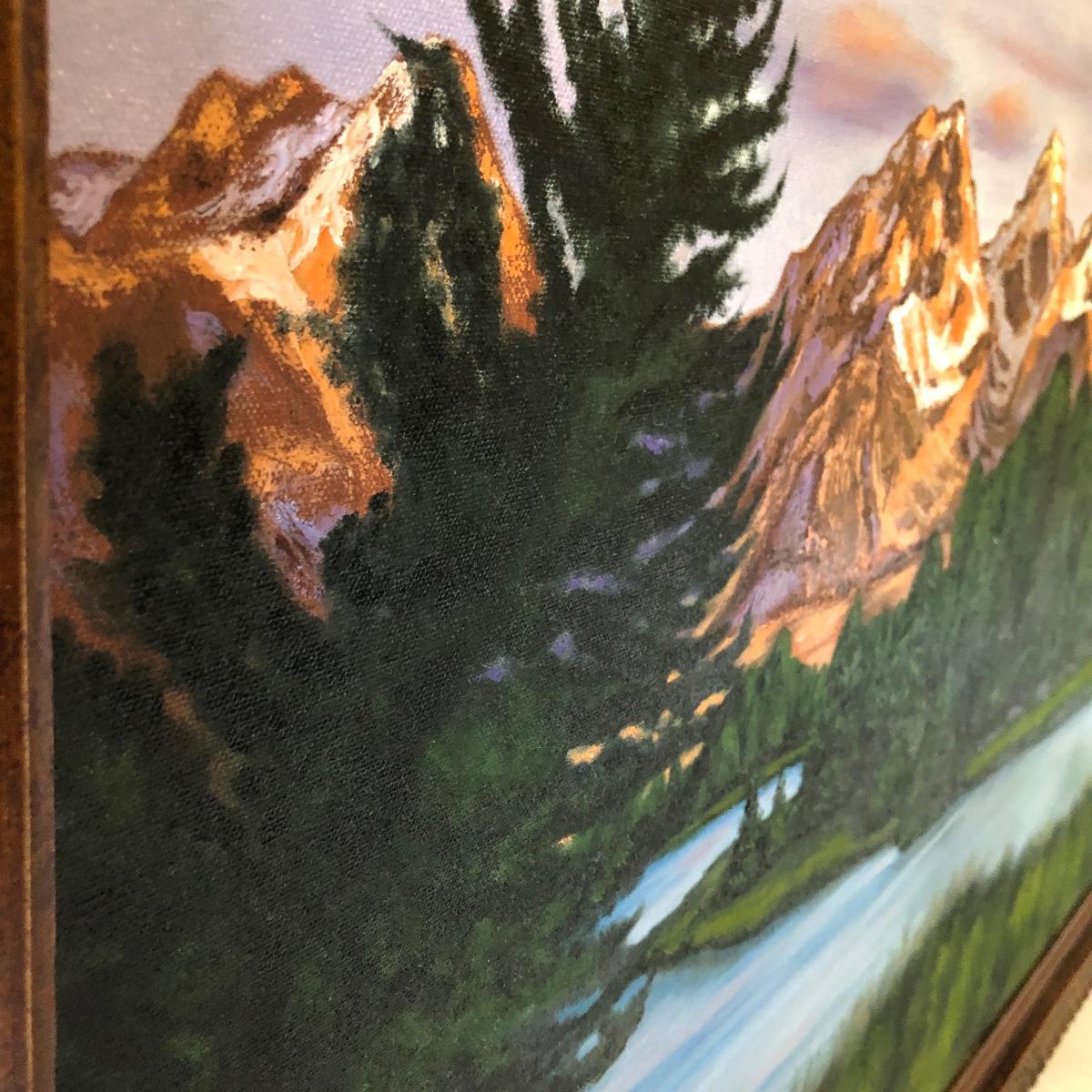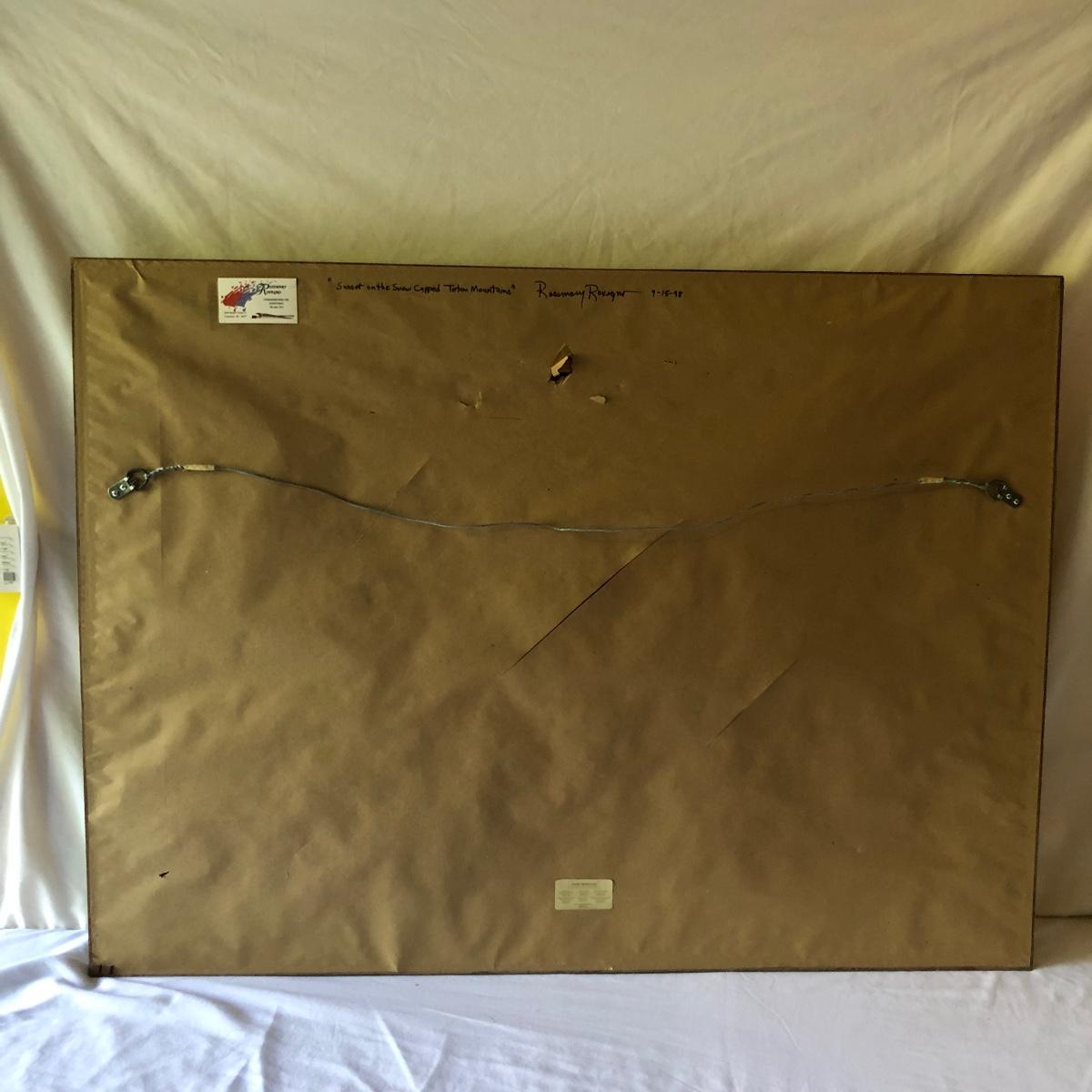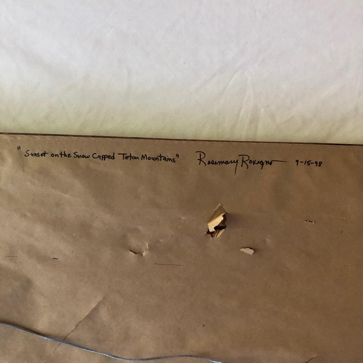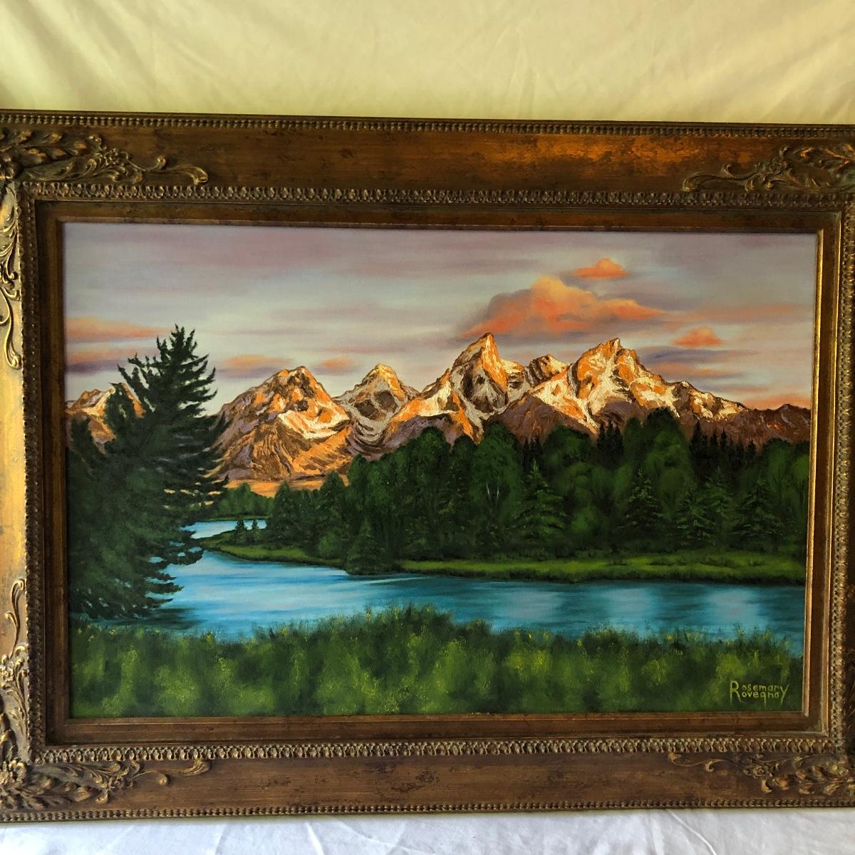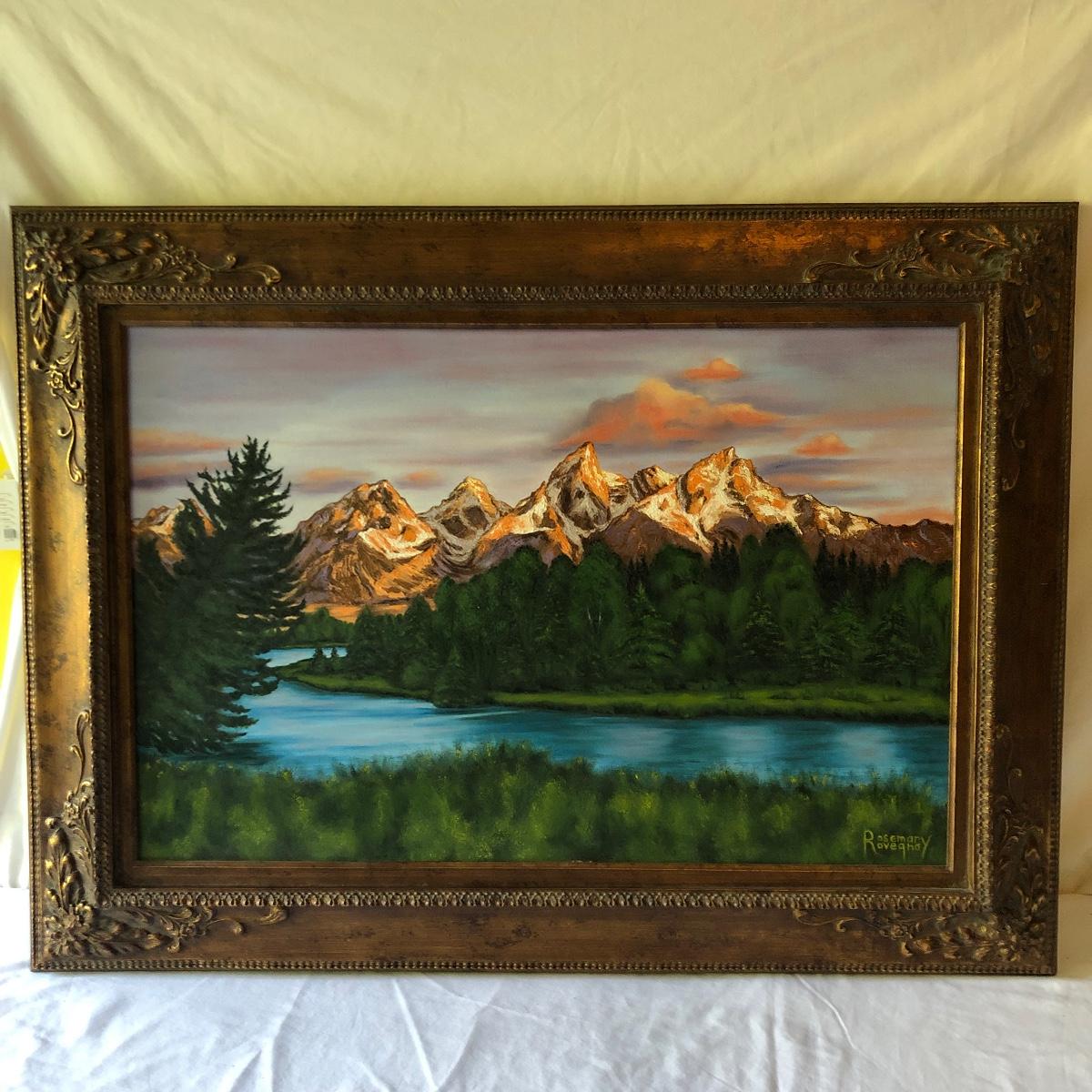 Lot includes Framed and signed Rosemary Rovengo oil painting titled “Sunset on the Snow Capped Teton Mountains” frame is a ornate wooden frame. Frame measures 34” x 45.5” x 2.5”.