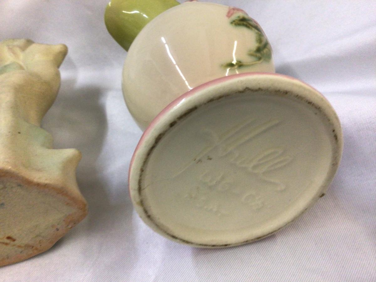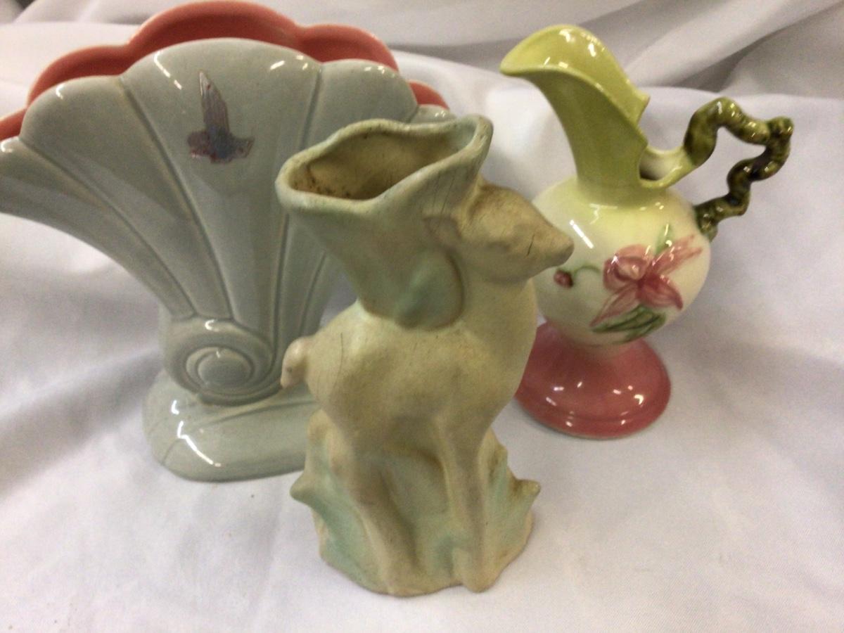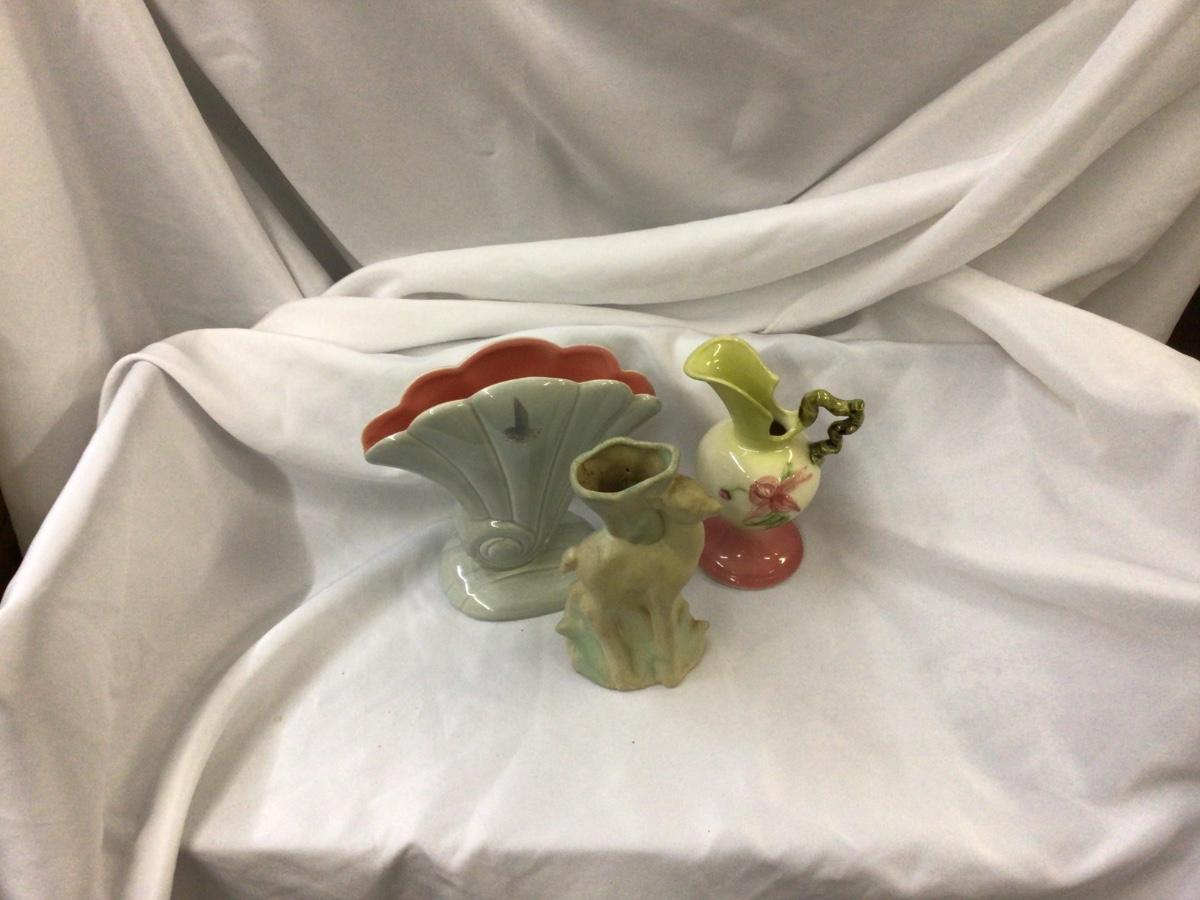 You get three name brand potter item. The Rosemead Deer vase matte finish. The Red Wing fan vase is pink and gray. The Hull pitcher has nice flowers. All are marked and in great condition.