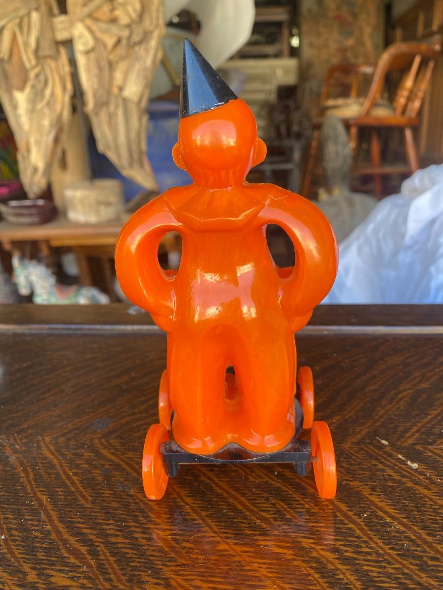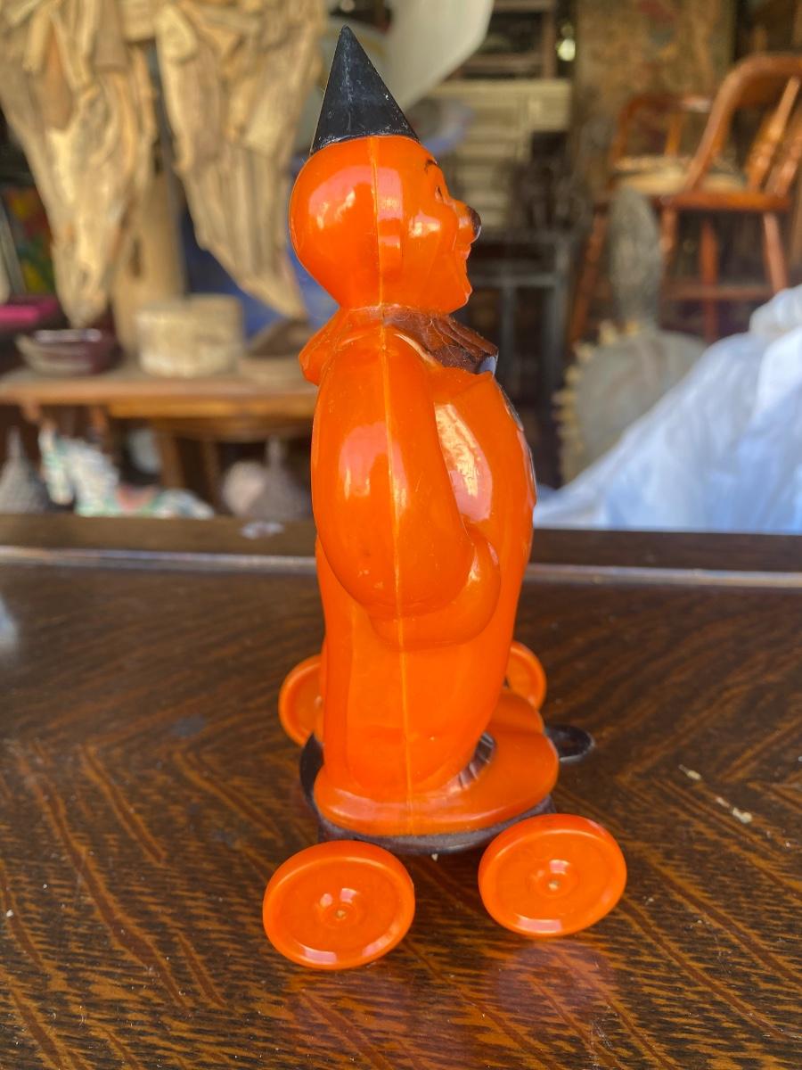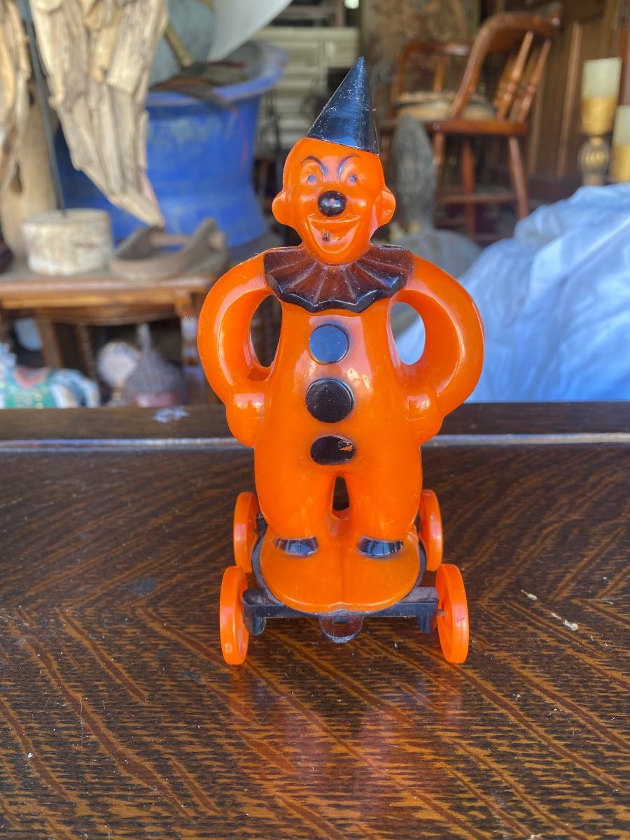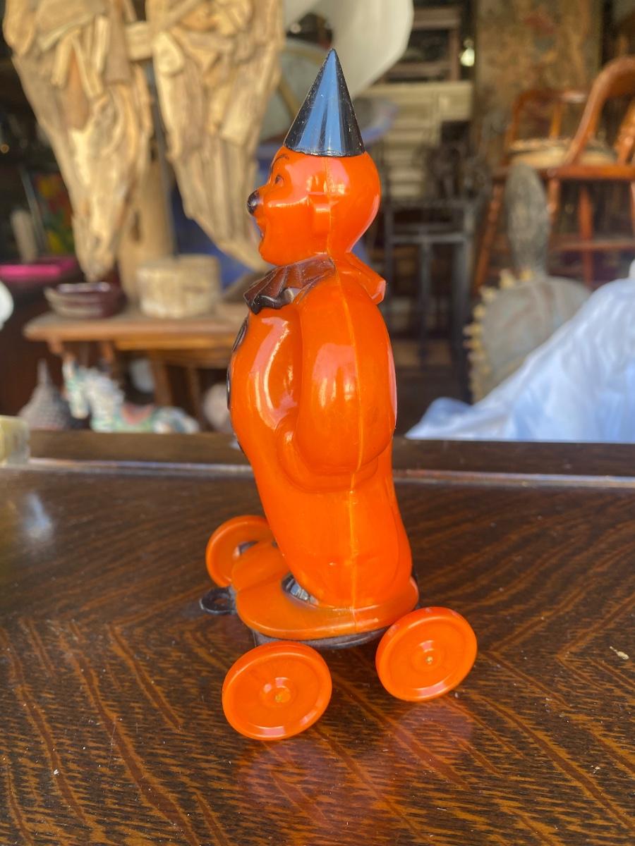 Viintage Halloween Clown Pull Toy collectible by Rosen Rosbro Zook from the 1950s. The toy features a spooky and retro design and captures the festive spirit of the 1950s holiday season. This Zook The Clown pull toy is a unique addition to any holiday collectibles display, Some slight signs of wear on lower sides as shown in photos. 6 1/4" high