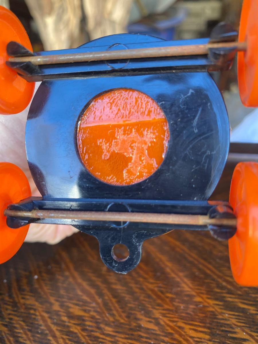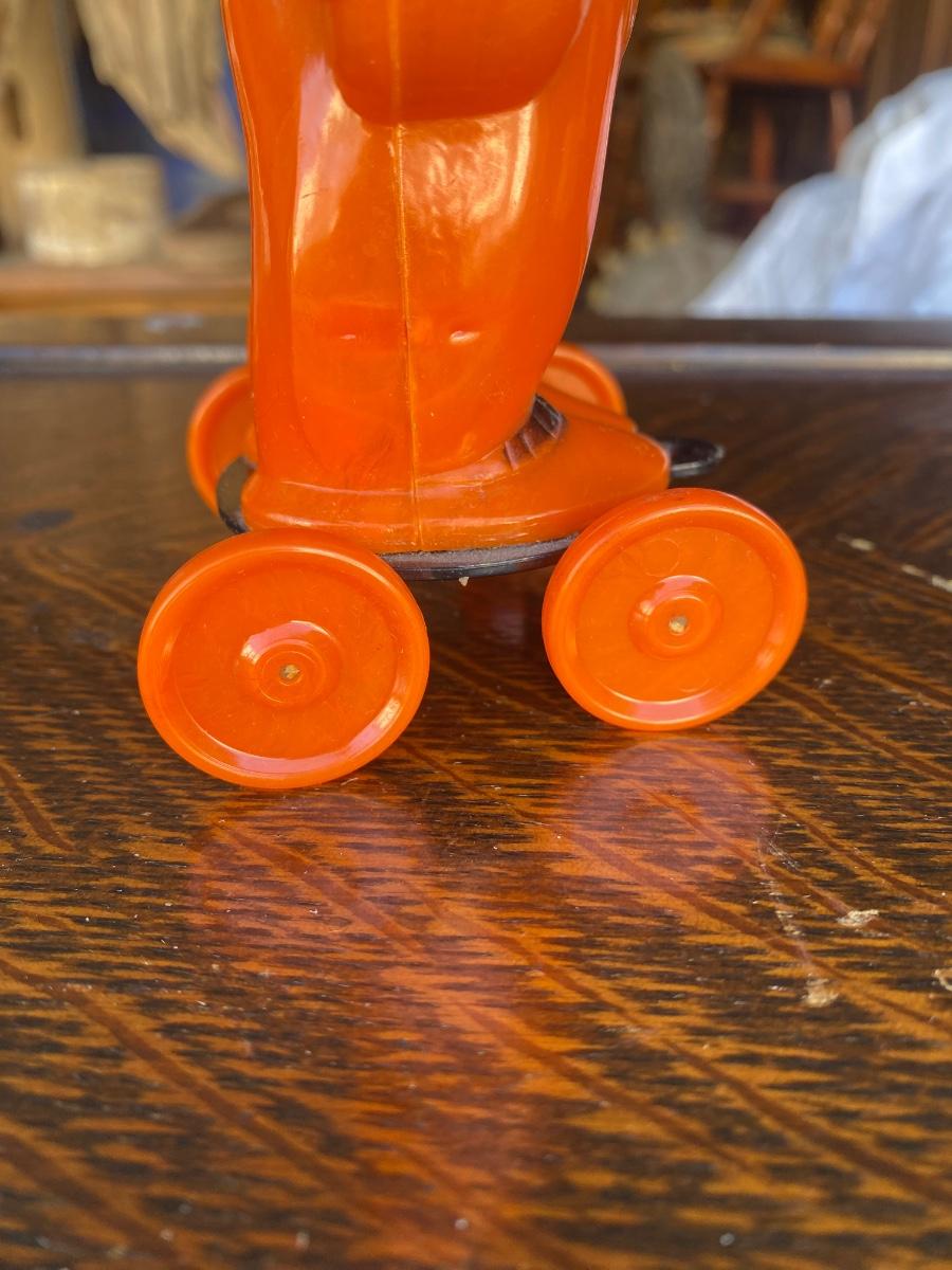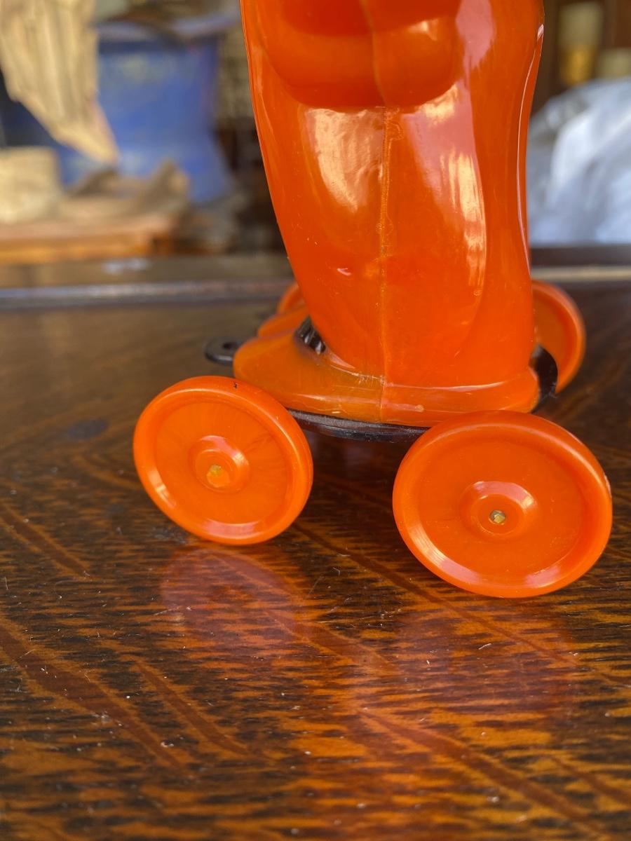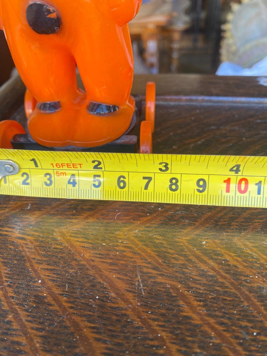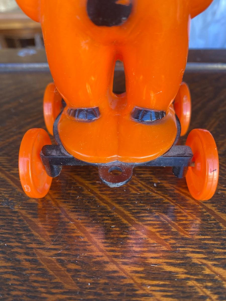 Viintage Halloween Clown Pull Toy collectible by Rosen Rosbro Zook from the 1950s. The toy features a spooky and retro design and captures the festive spirit of the 1950s holiday season. This Zook The Clown pull toy is a unique addition to any holiday collectibles display, Some slight signs of wear on lower sides as shown in photos. 6 1/4" high