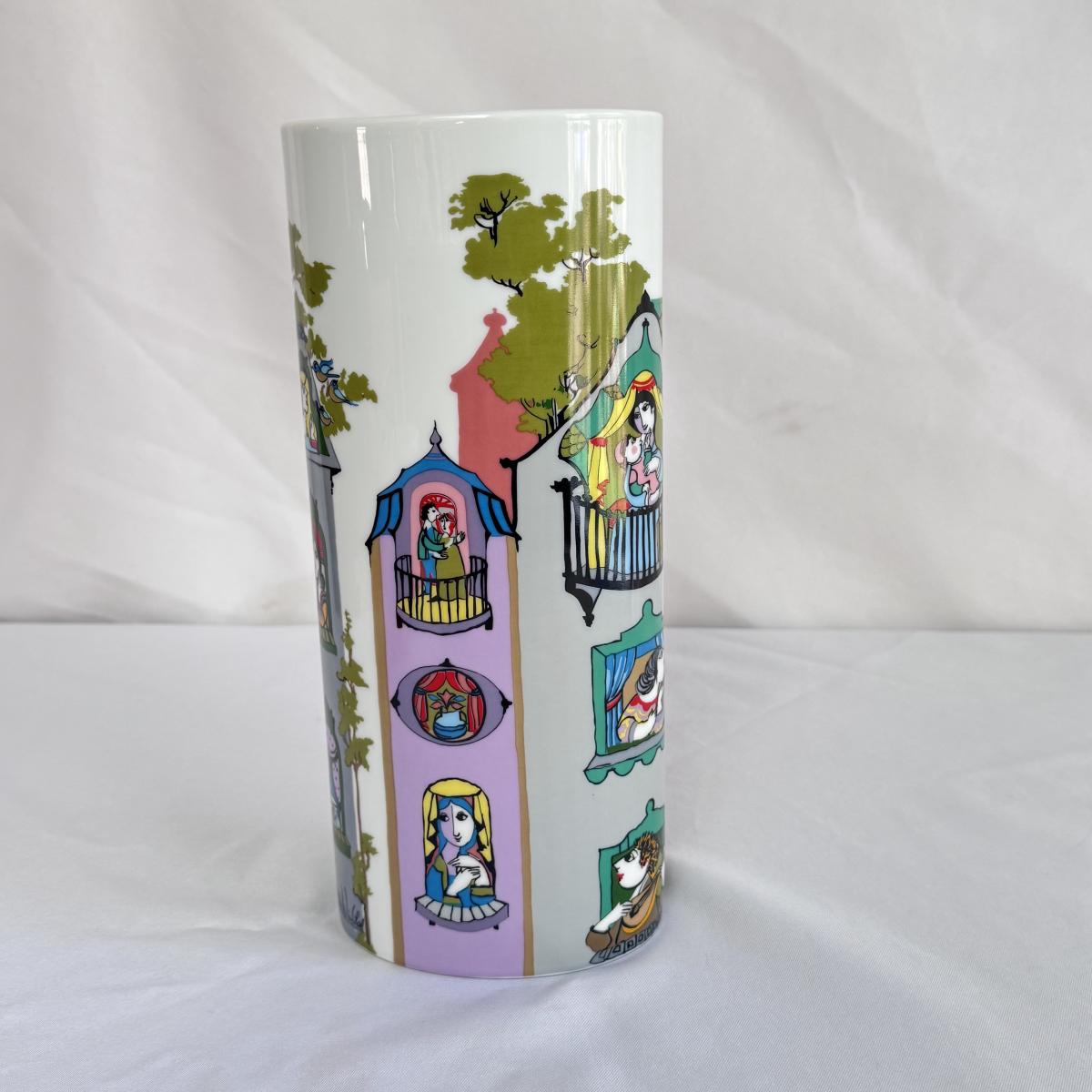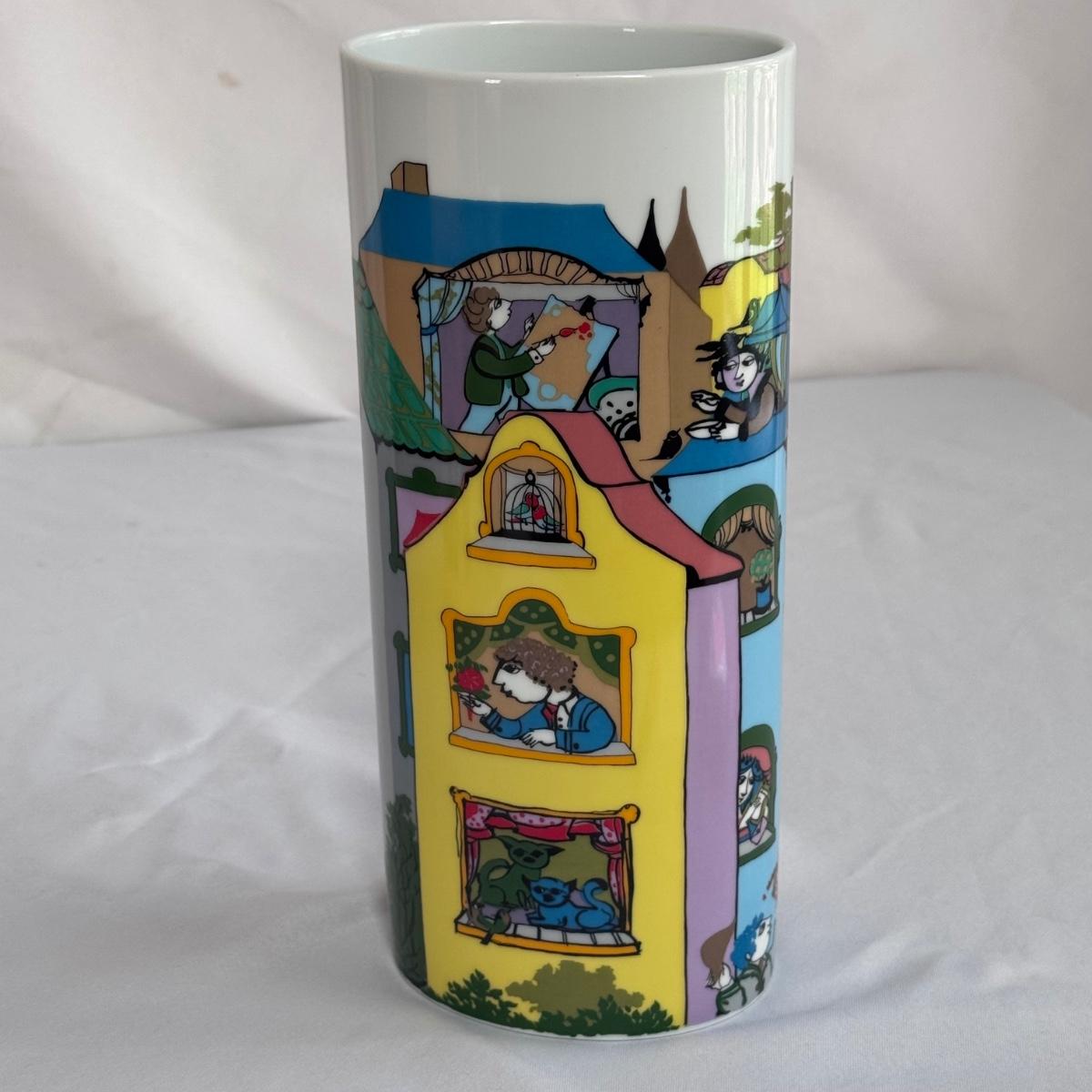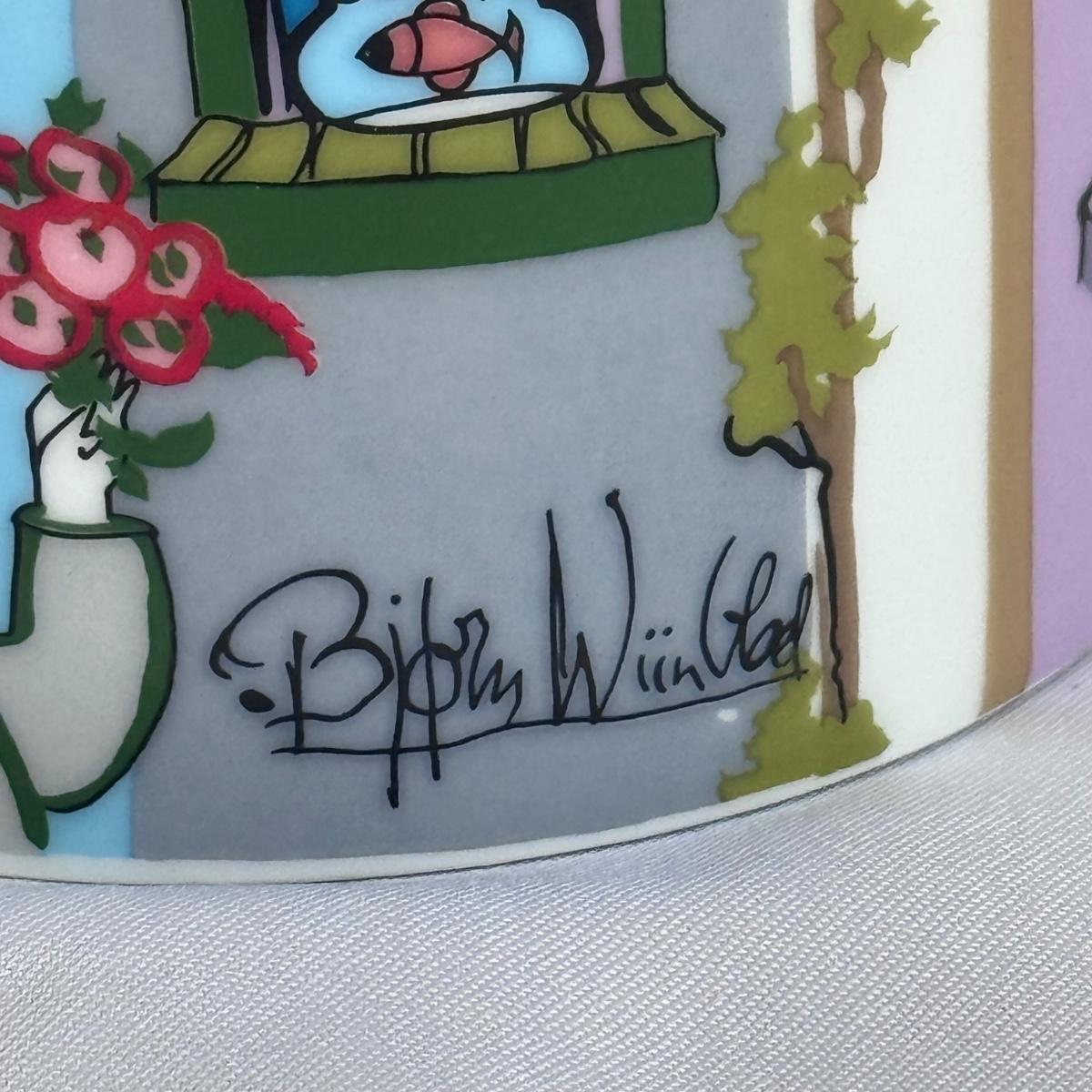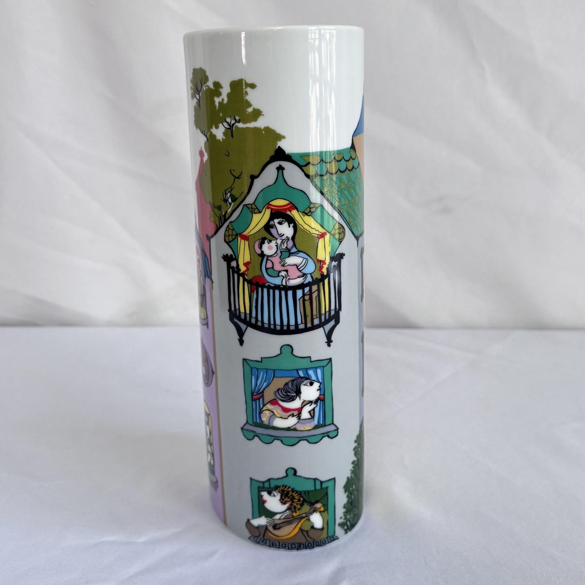 This lot includes one Bjorn Wiinbland vase designed for Rosenthal. It appears to be made of porcelain with several window scenes painted on every side. The vase is signed - see picture included. The vase measures 5” x 3.5” x 11.5”H. Shipping available.