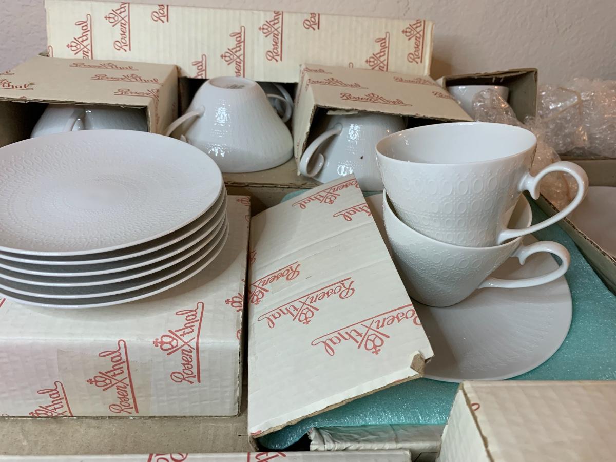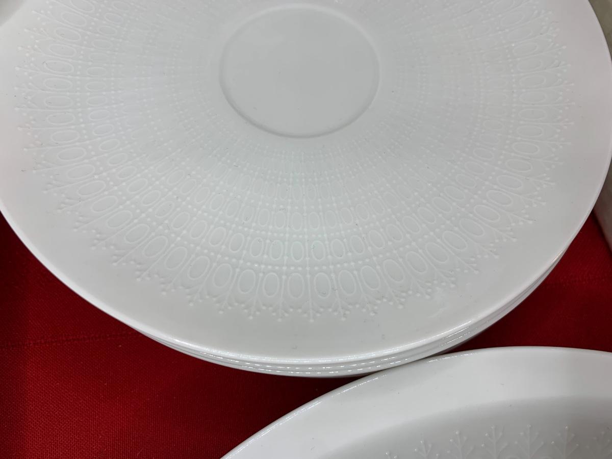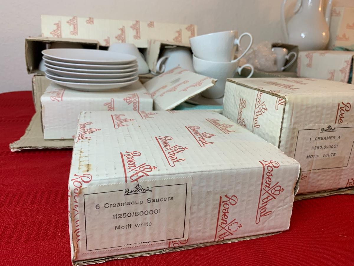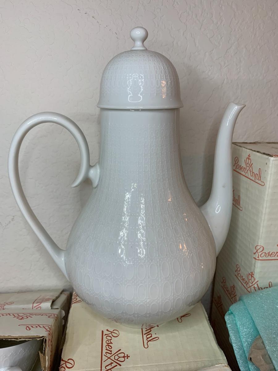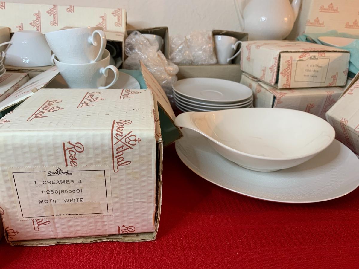 Lot of vintage Rosenthal Studio-line white china, Made in Germany. Continental Romance pattern. Includes tea/coffee pot, cream, sugar, small tea cups, soup cups, dinner plates, salad plates, dessert plates, saucers. Serving platter and bowl. All in amazing condition in original boxes. Appears to be service for at least 8, not all pieces counted.