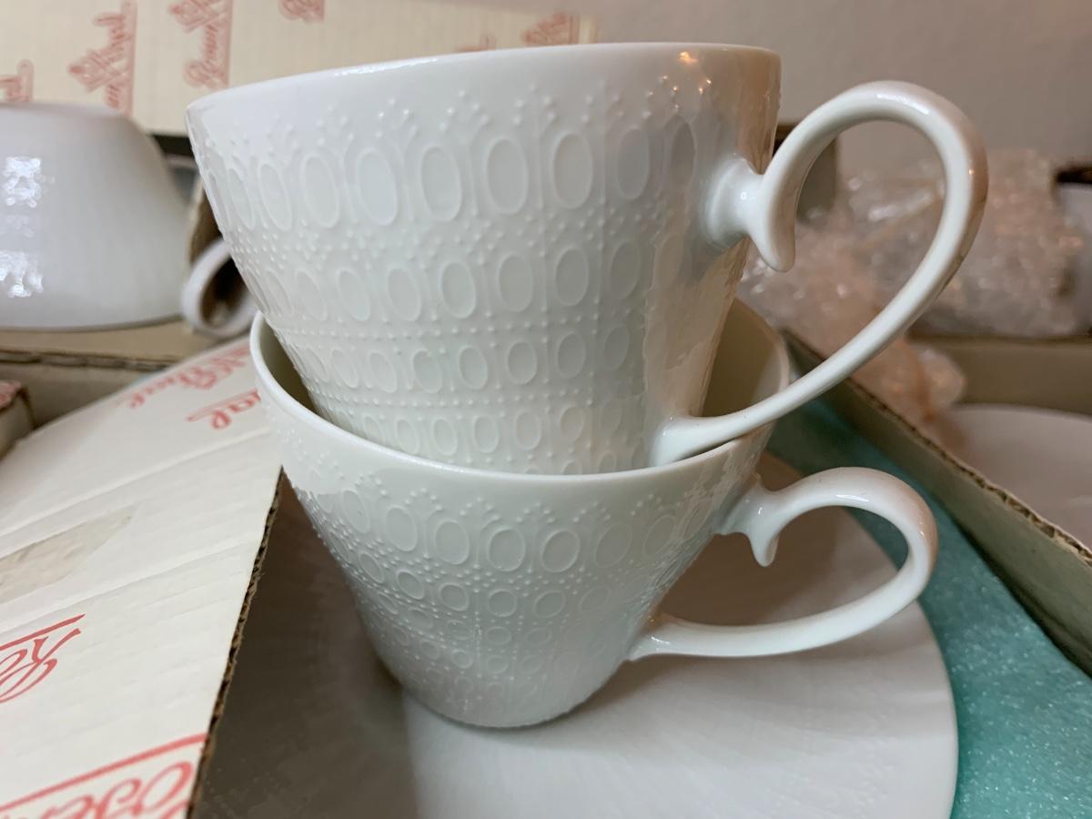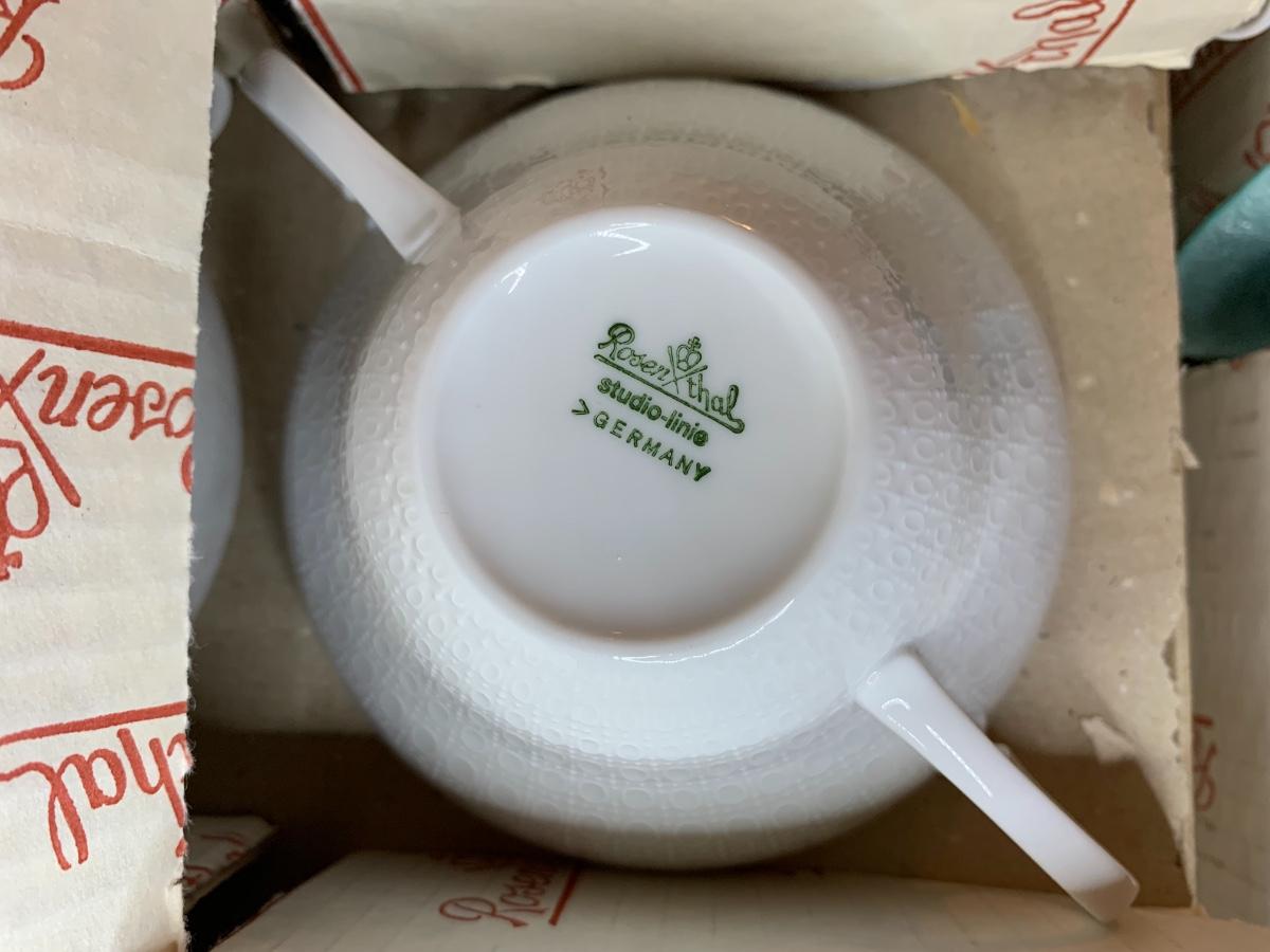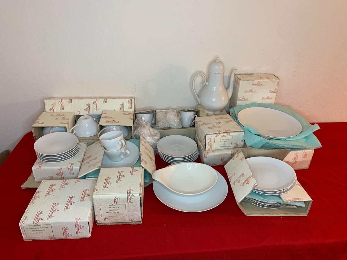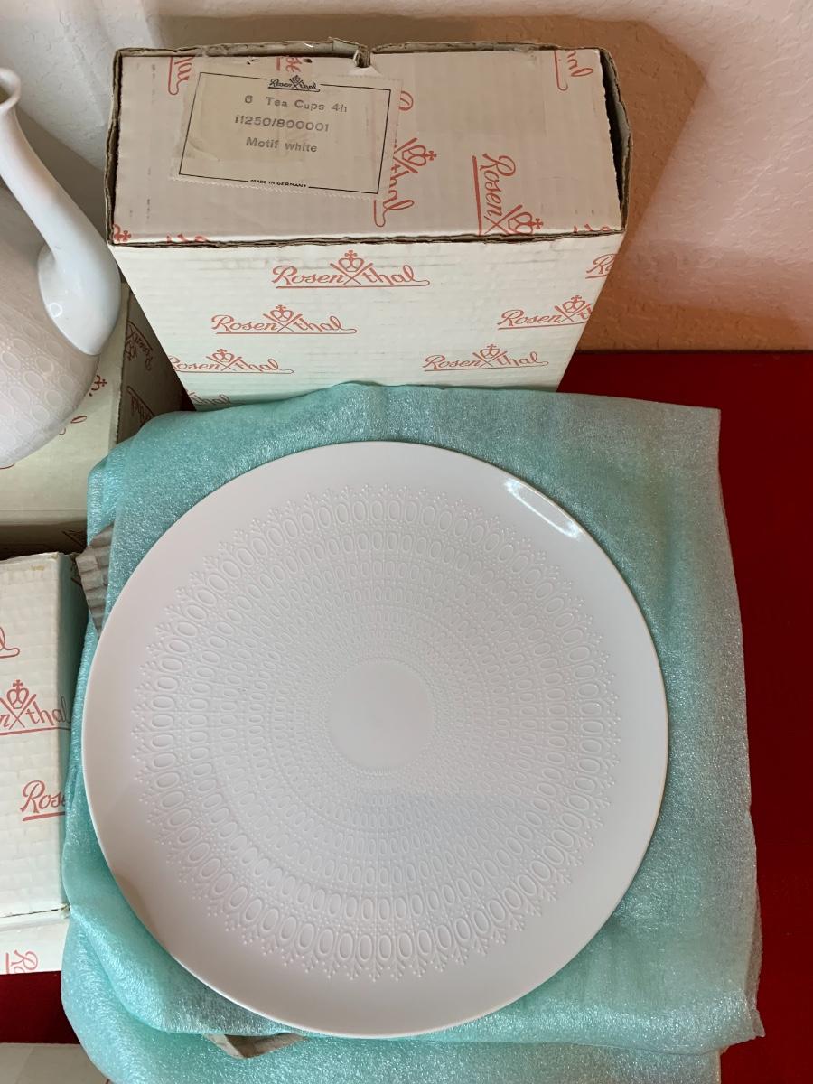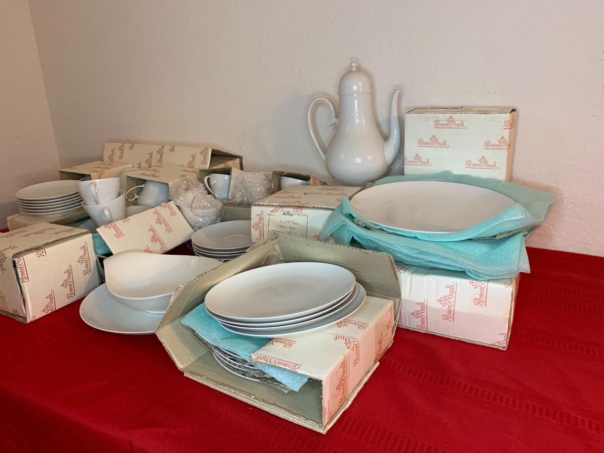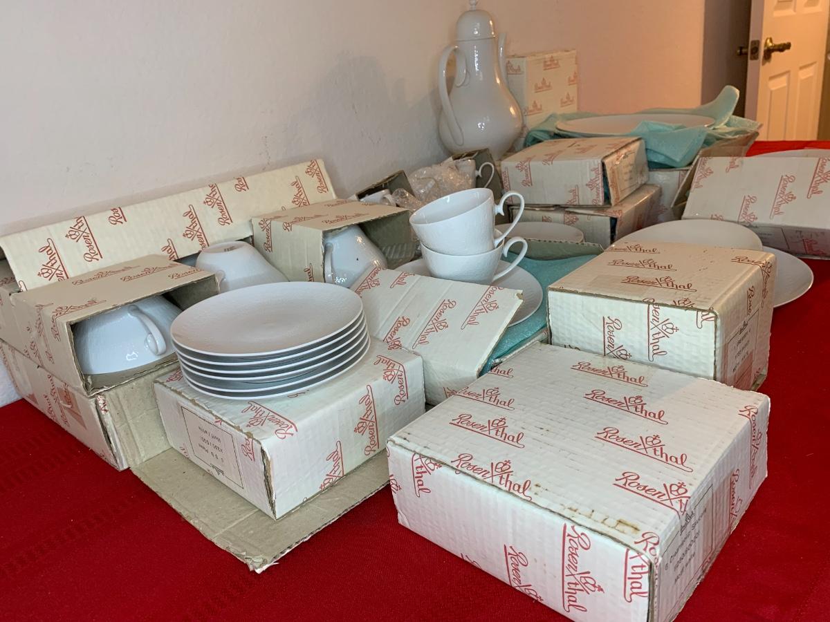 Lot of vintage Rosenthal Studio-line white china, Made in Germany. Continental Romance pattern. Includes tea/coffee pot, cream, sugar, small tea cups, soup cups, dinner plates, salad plates, dessert plates, saucers. Serving platter and bowl. All in amazing condition in original boxes. Appears to be service for at least 8, not all pieces counted.