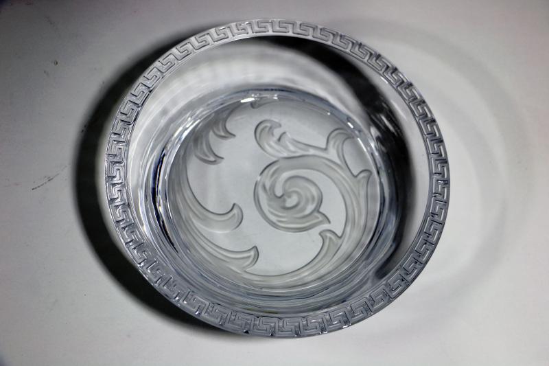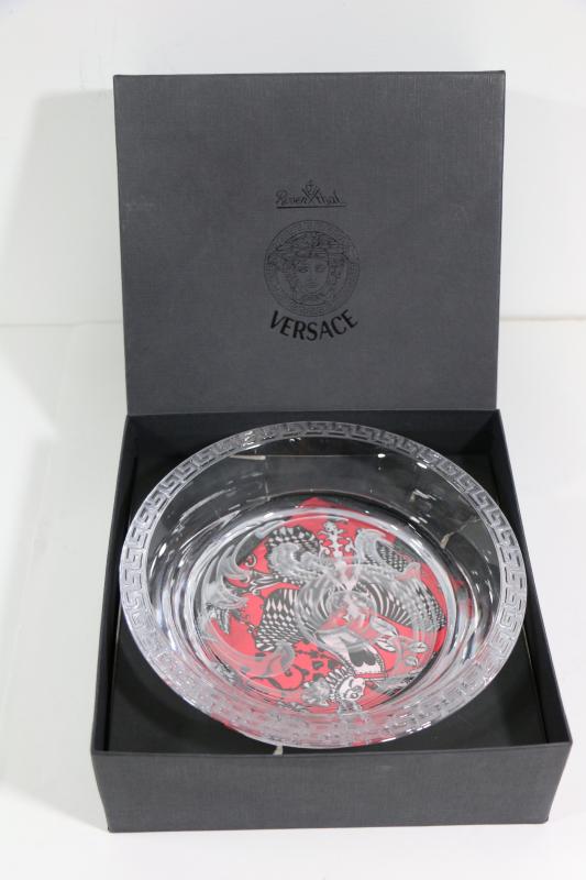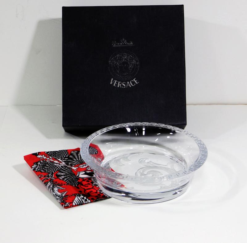 This is a Genuine Rosenthal Crystal Arabesque Bottle Coaster by Versace. This is pre-owned piece, the bottom has a few minor scratches, the sides and inner part is in excellent condition. Coaster is 7" in diameter meausred outside and it will hold 5" diameter bottle, it stands 1-7/8" tall and weights almost 3 lbs. It comes complete with original box and Versace Certificate of Authenticity, offered here at great price - all as seen on pictures