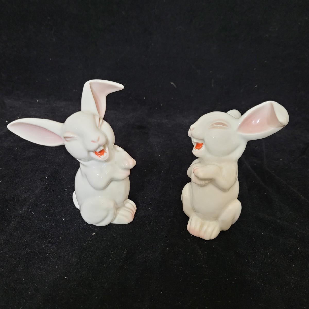 Adorably amusing pair of white porcelain Rosenthal of Germany laughing rabbits. Excellent condition. Measures approximately 6"H. Shipping available.
