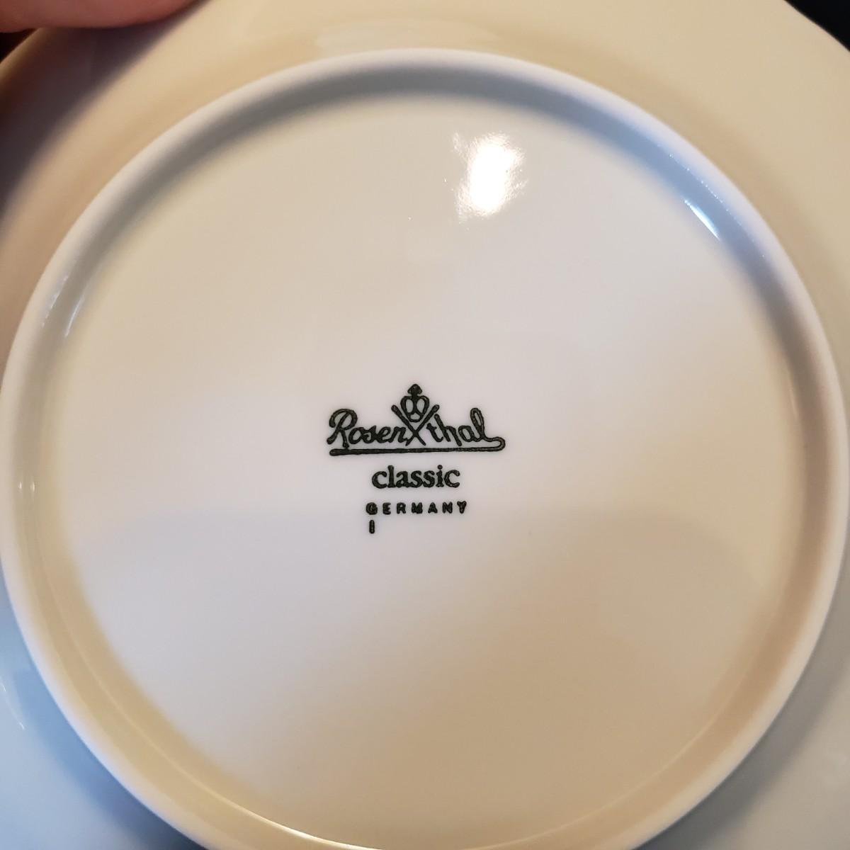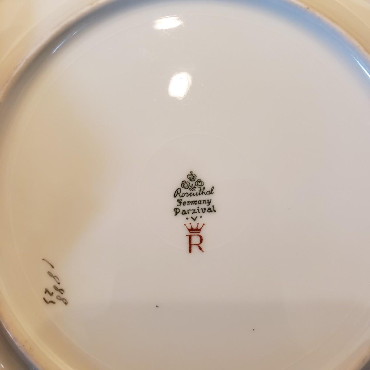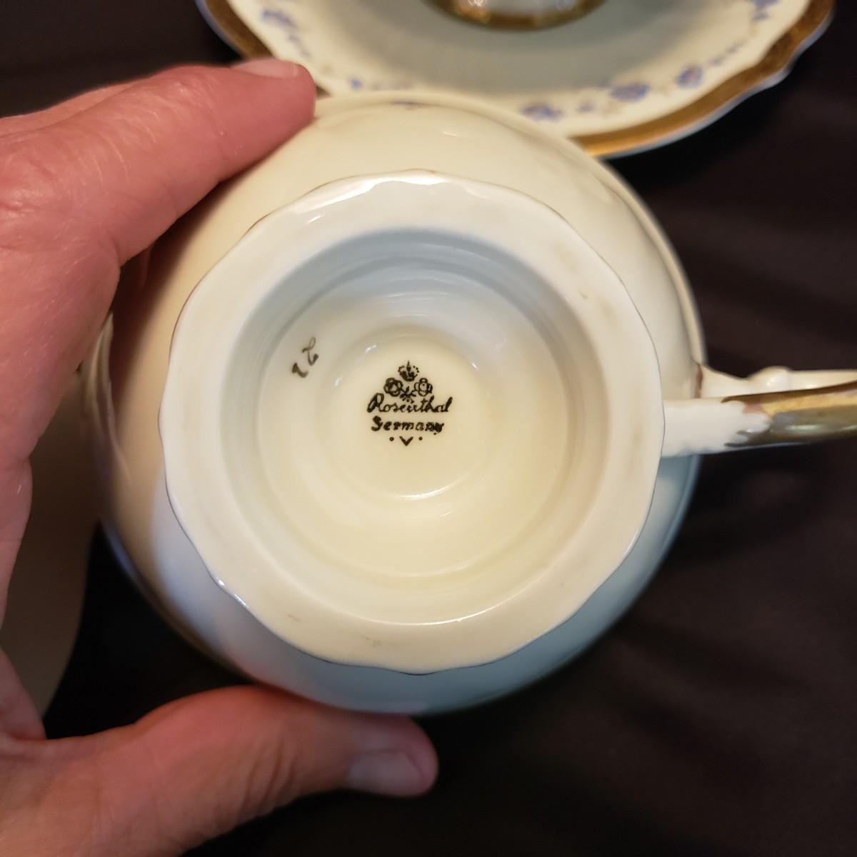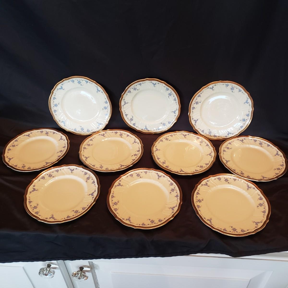 This Rosenthal lot contains two different patterns that compliment each other with their gold rim. The six all white with gold rimmed dessert plates measure 7". The ten 8" dessert plates feature a gold rim with delicate blue flowers. The nine tea cup and saucers match the blue dessert plates and measure 5" x 2.5" for the cup and 6" for the saucers. One cup has a chip, see picture. Shipping available. Shipping can be costly. We suggest contacting our preferred local shipping provider, Postage Express, with dimensions and getting an estimate before bidding: (828) 225-9250 or shipping@postageexpressnc.com.