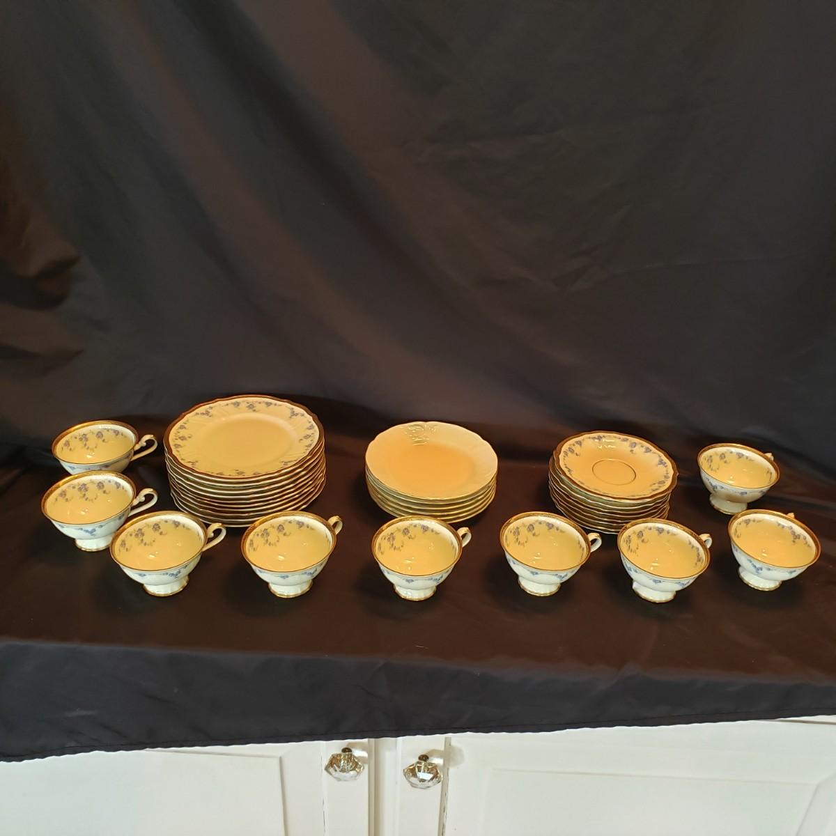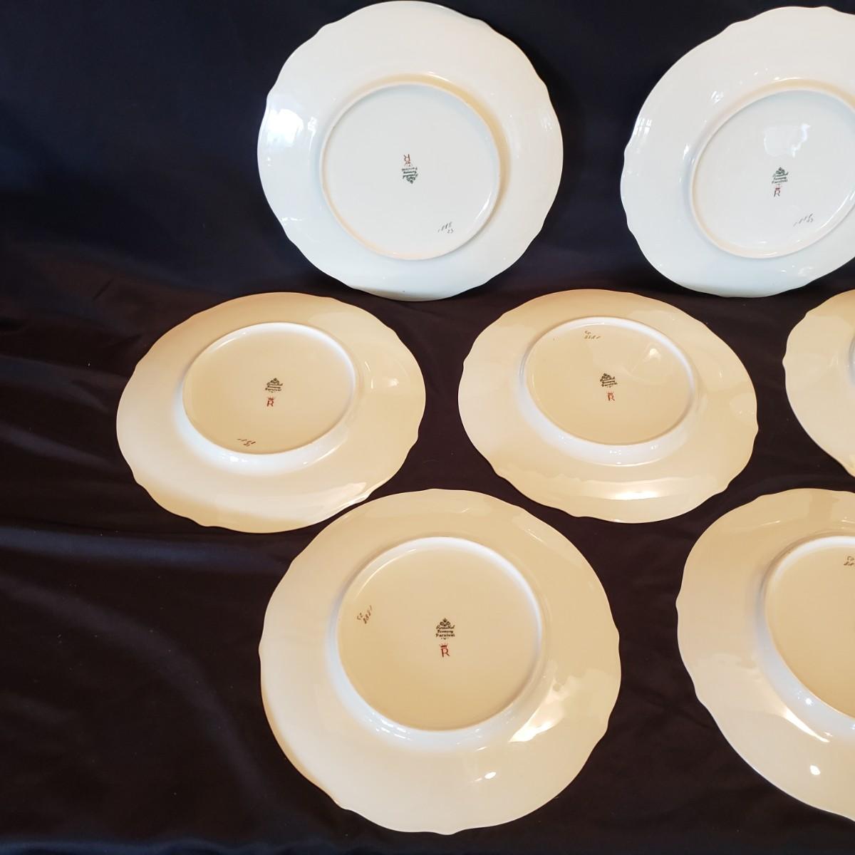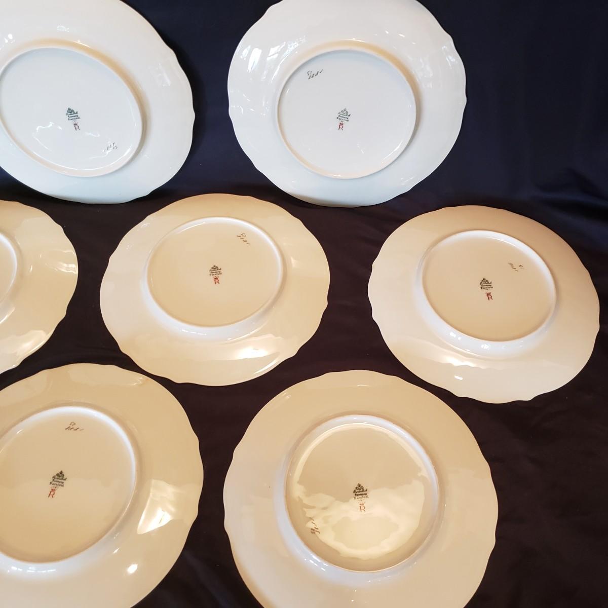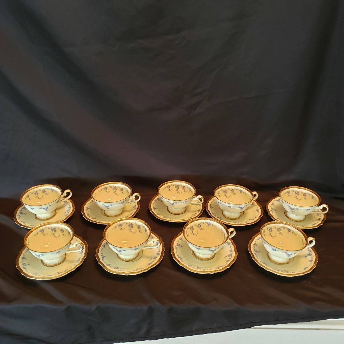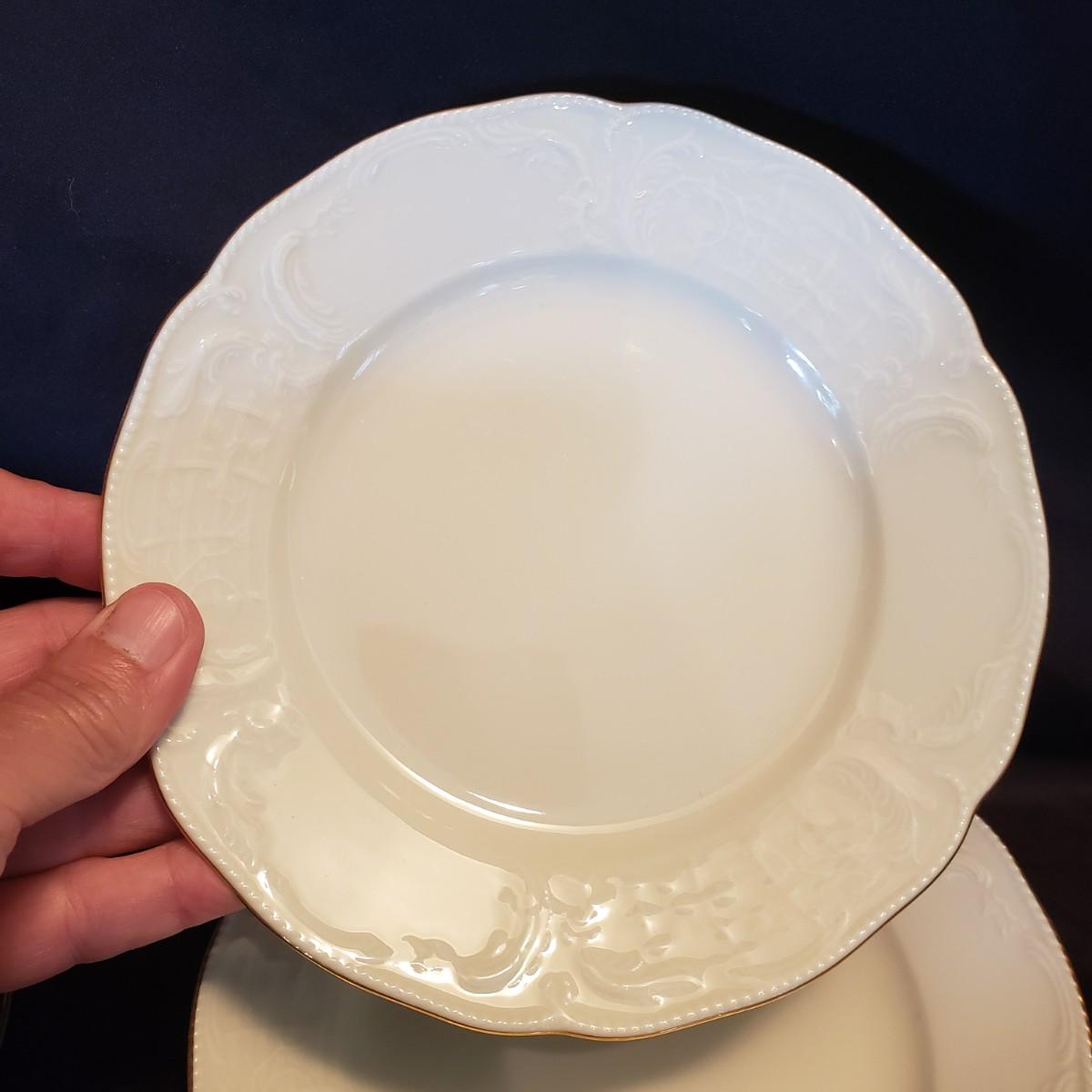 This Rosenthal lot contains two different patterns that compliment each other with their gold rim. The six all white with gold rimmed dessert plates measure 7". The ten 8" dessert plates feature a gold rim with delicate blue flowers. The nine tea cup and saucers match the blue dessert plates and measure 5" x 2.5" for the cup and 6" for the saucers. One cup has a chip, see picture. Shipping available. Shipping can be costly. We suggest contacting our preferred local shipping provider, Postage Express, with dimensions and getting an estimate before bidding: (828) 225-9250 or shipping@postageexpressnc.com.
