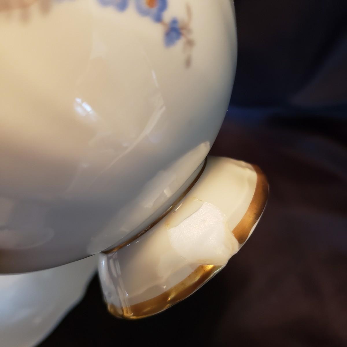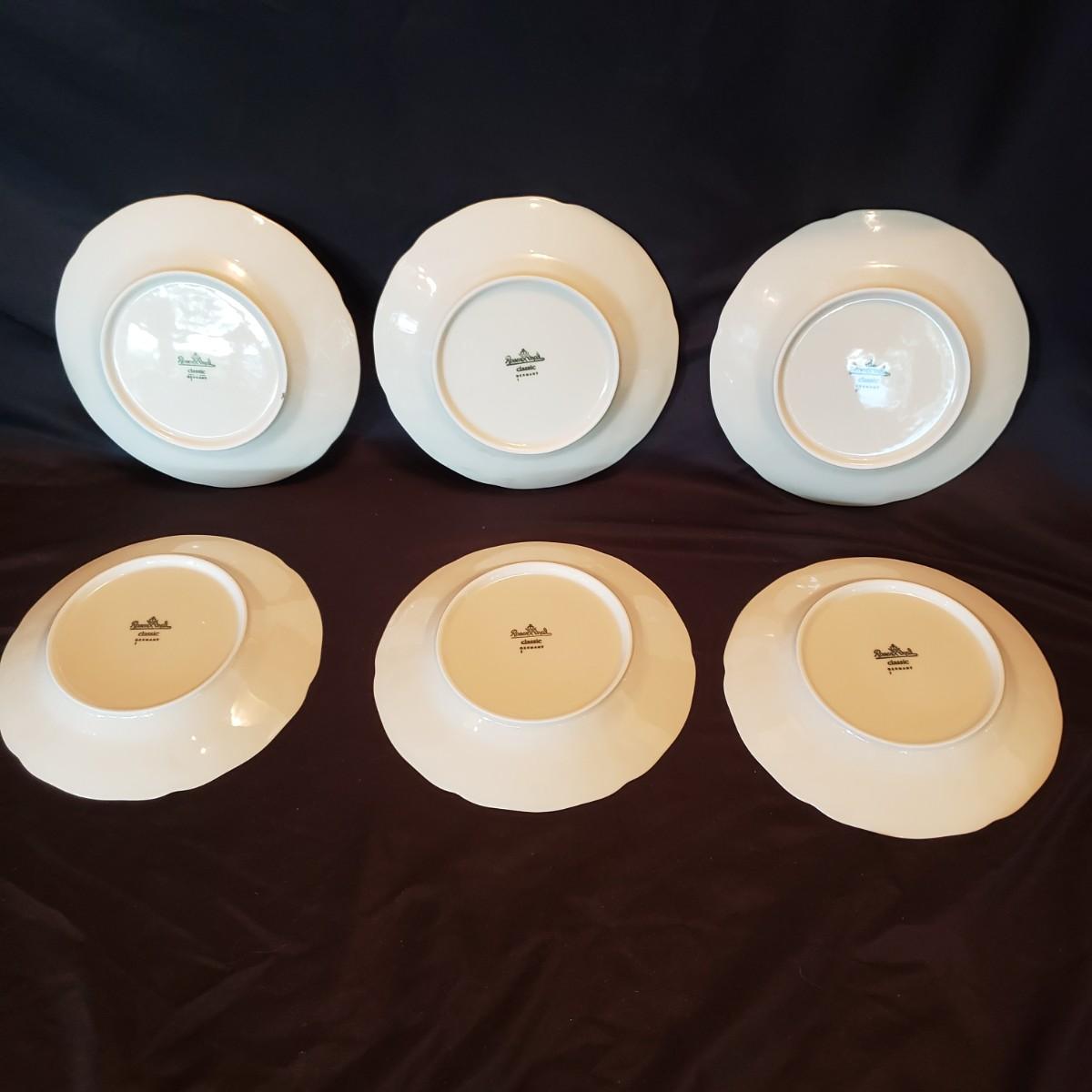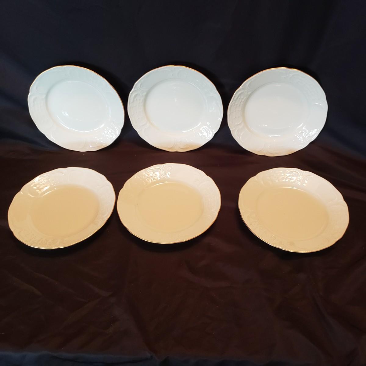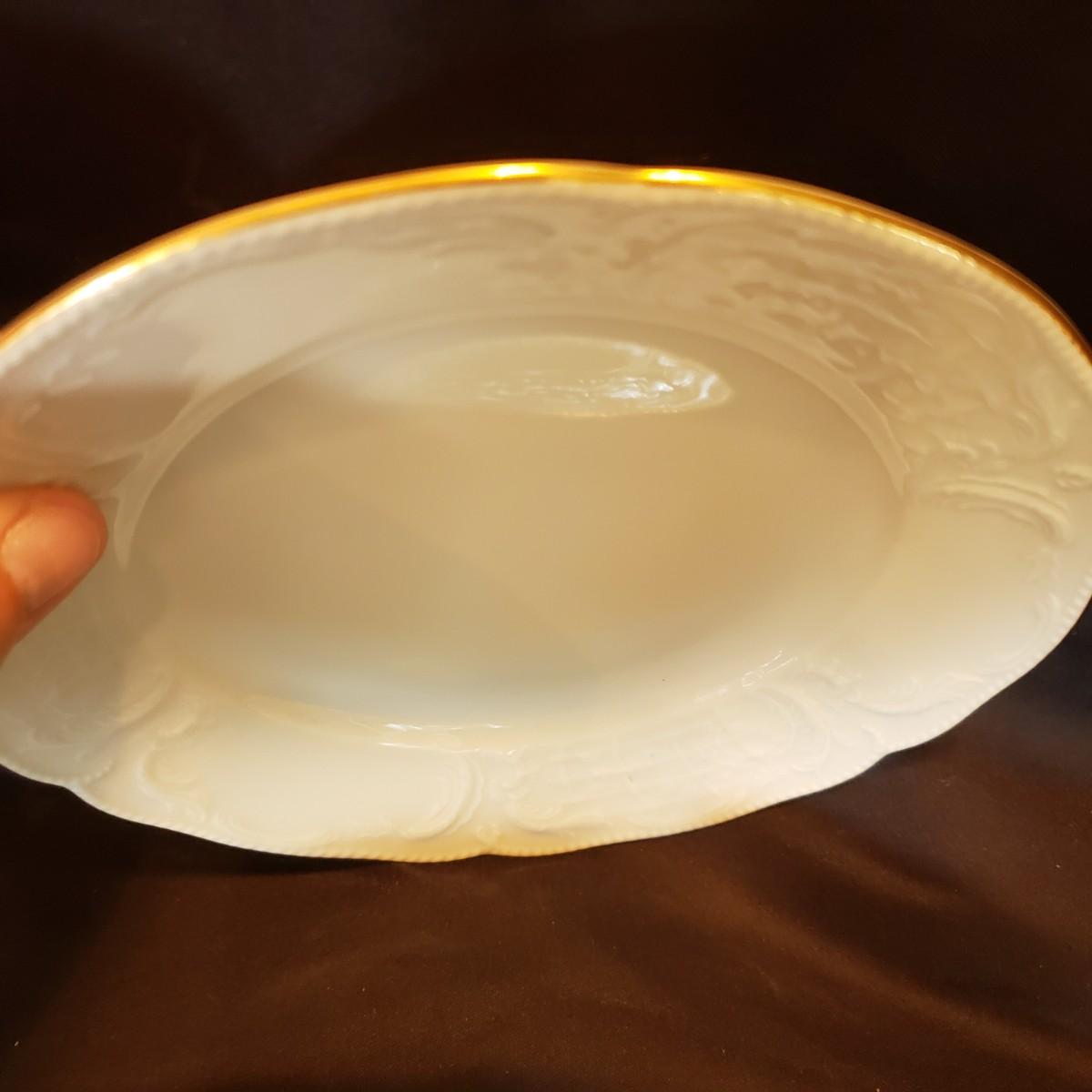 This Rosenthal lot contains two different patterns that compliment each other with their gold rim. The six all white with gold rimmed dessert plates measure 7". The ten 8" dessert plates feature a gold rim with delicate blue flowers. The nine tea cup and saucers match the blue dessert plates and measure 5" x 2.5" for the cup and 6" for the saucers. One cup has a chip, see picture. Shipping available. Shipping can be costly. We suggest contacting our preferred local shipping provider, Postage Express, with dimensions and getting an estimate before bidding: (828) 225-9250 or shipping@postageexpressnc.com.