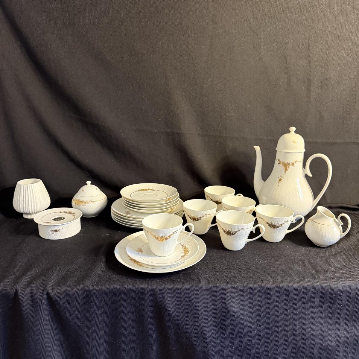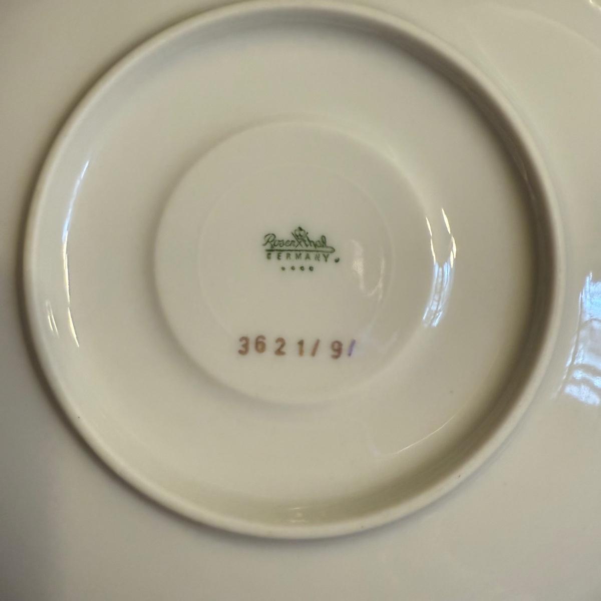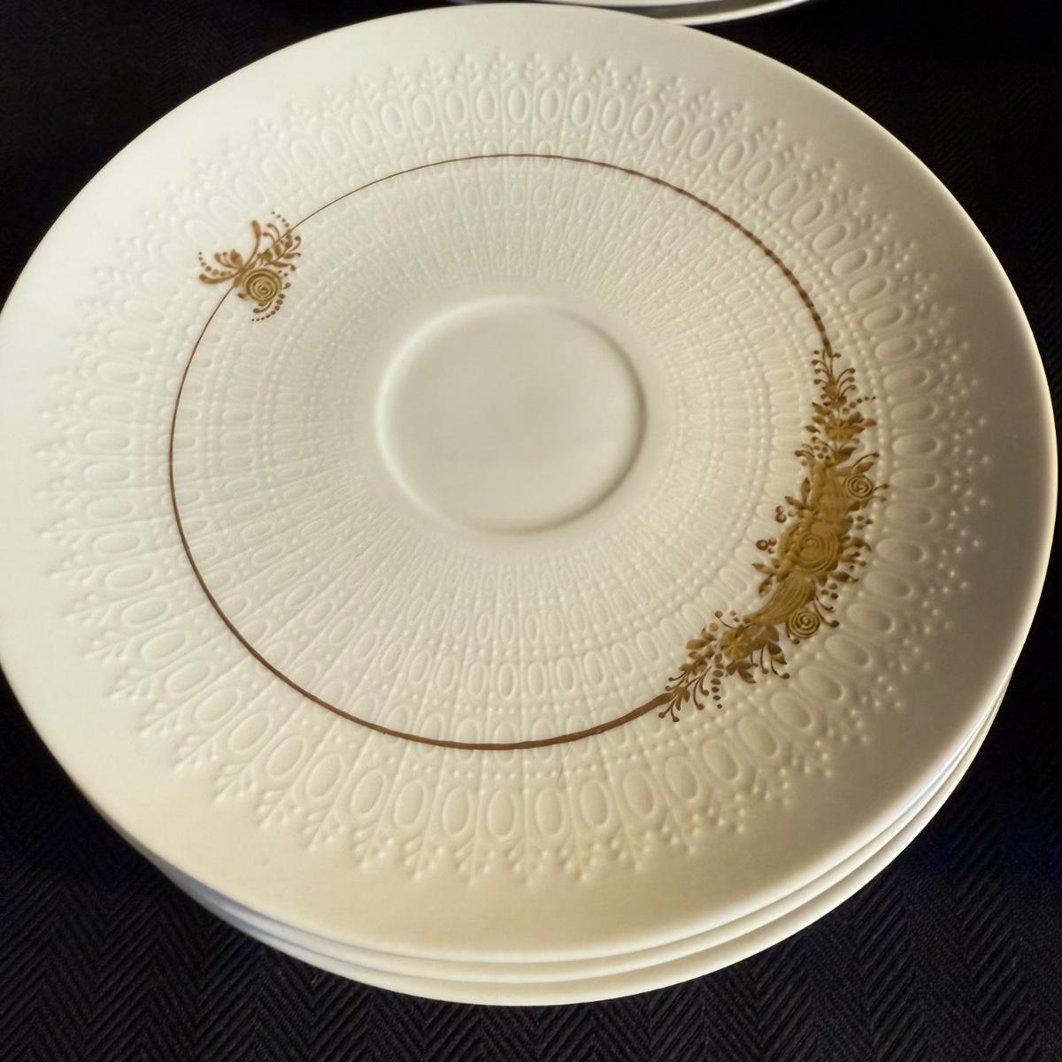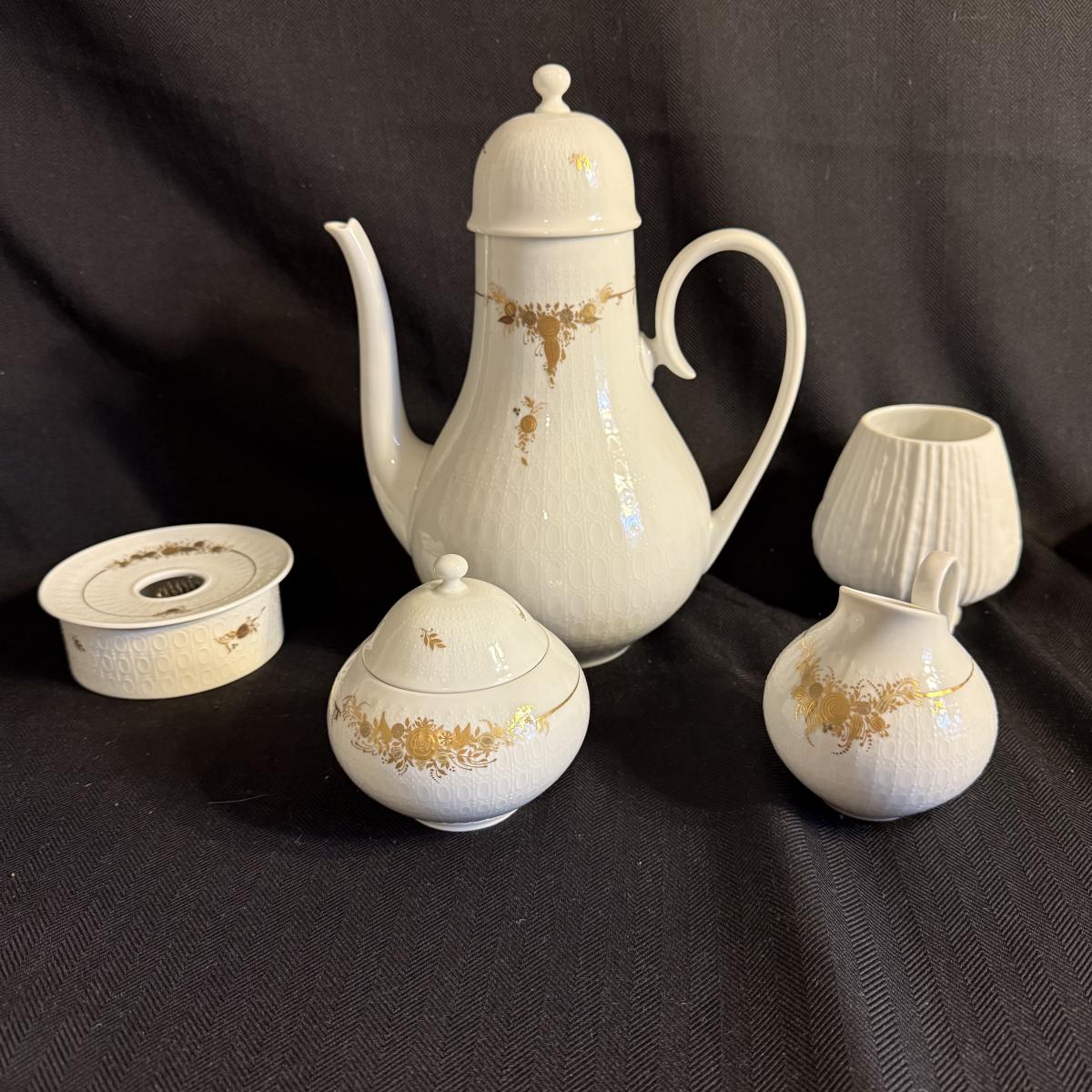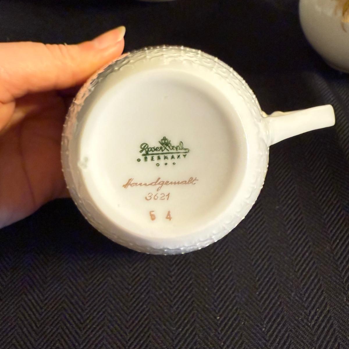This lot contains Rosenthal’s Romance Medley China tea set for six. Included in the set is a vase with a frog, as well as another small vase, a teapot, a sugar bowl, a creamer, and six small plates, saucers and teacups. Each piece has a stunning textured design as well as a gorgeous golden floral pattern. There is a teeny little chip on one of the tea cups, see picture of the bottom of the cup, located on far left. Everything else appears pristine, see pictures for details. Shipping available. Shipping can be costly. We suggest contacting our preferred local shipping provider, Postage Express, with dimensions and getting an estimate before bidding: (828) 255-9250 or shipping@postageexpressnc.com.