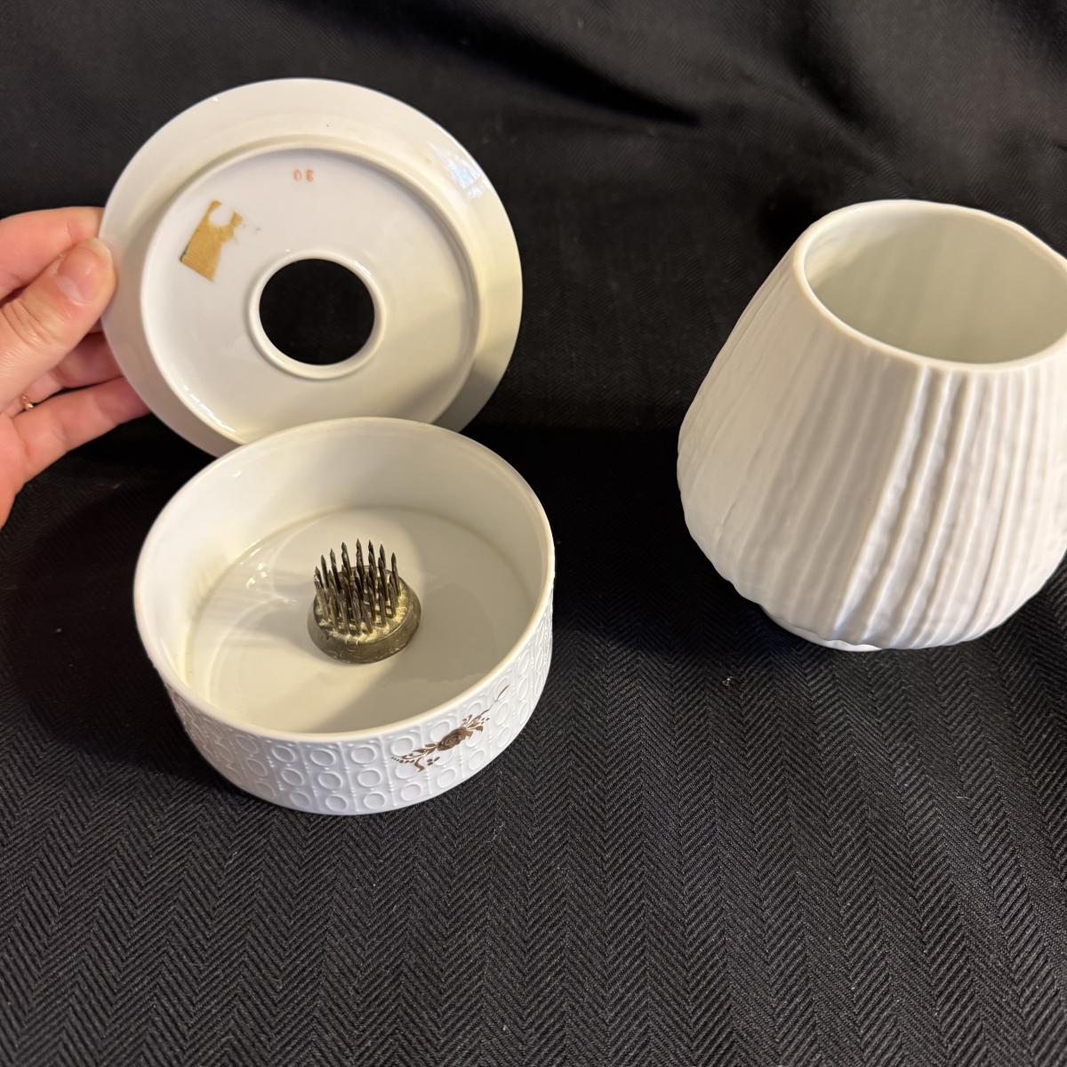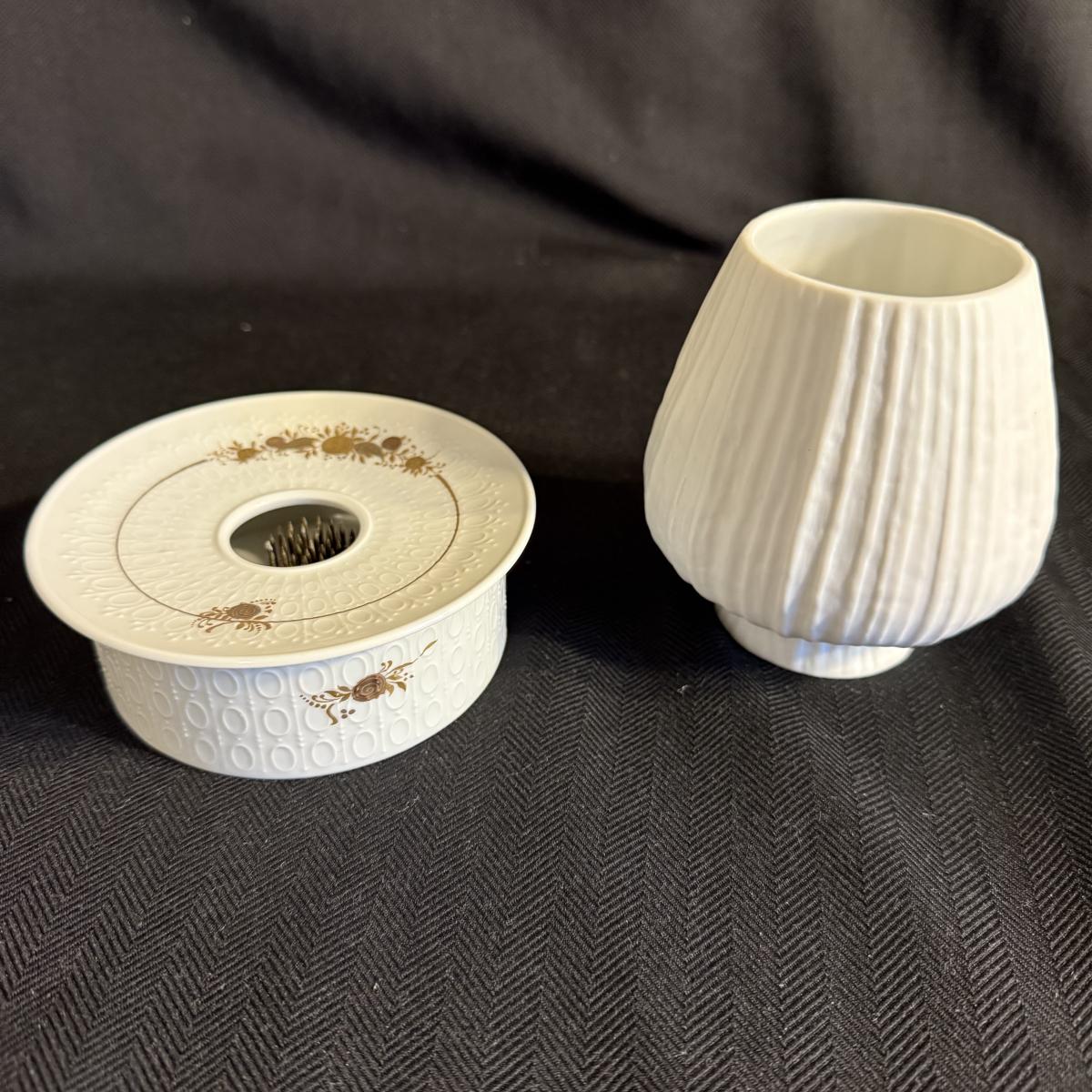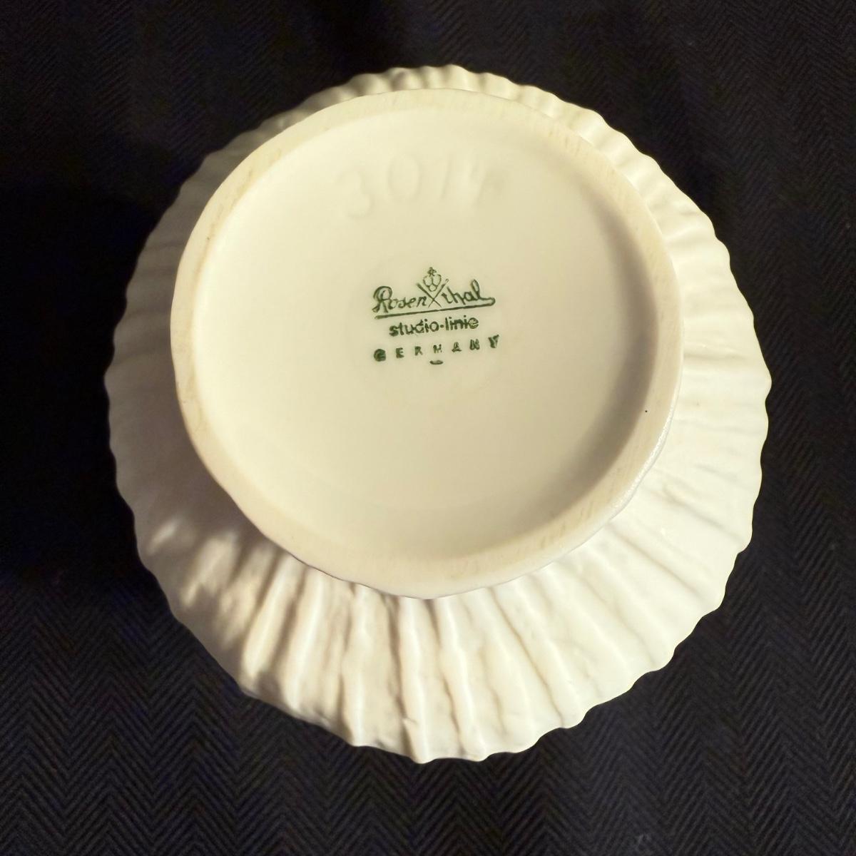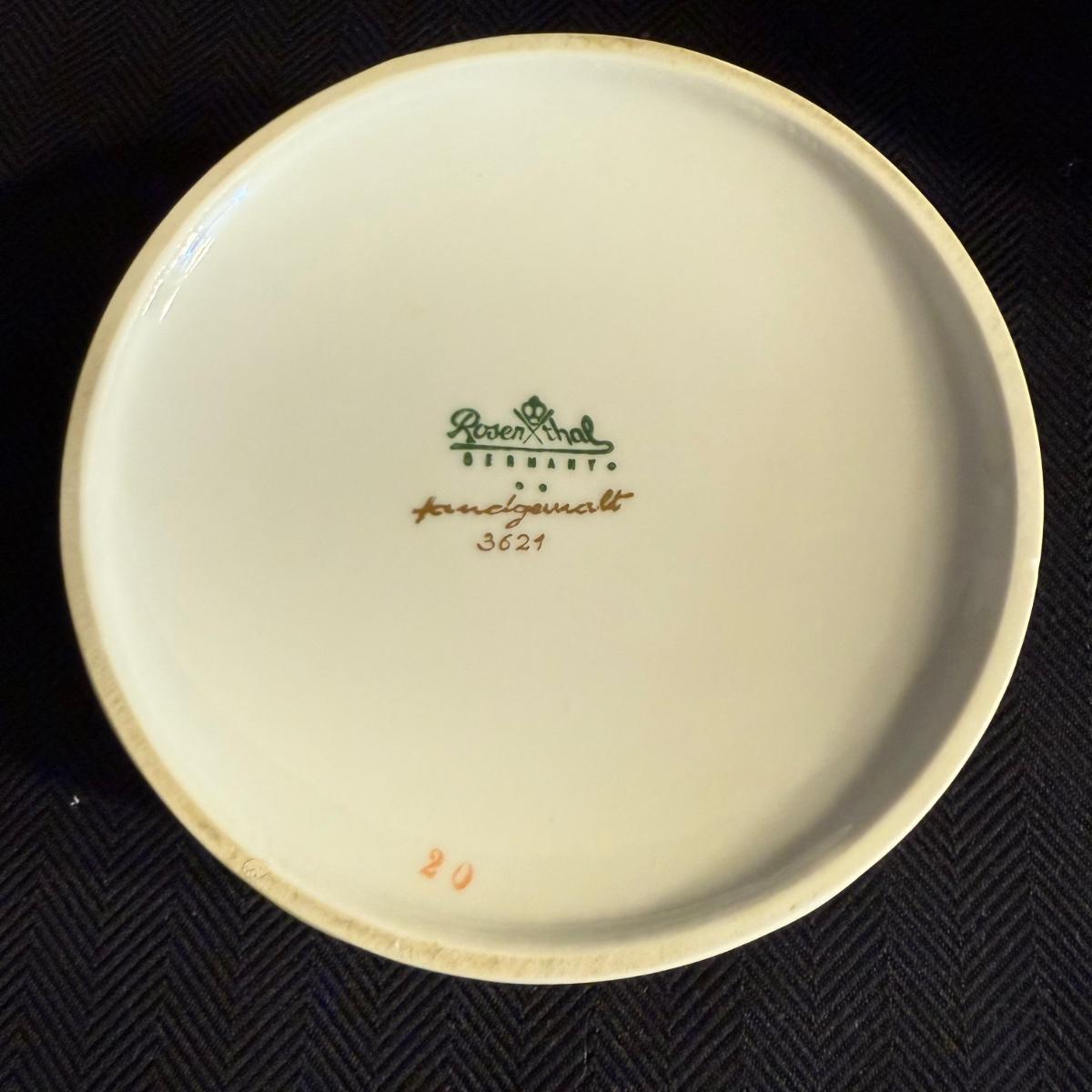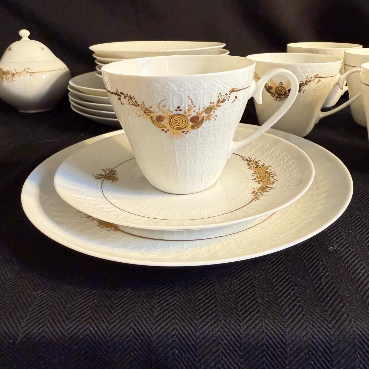 This lot contains Rosenthal’s Romance Medley China tea set for six. Included in the set is a vase with a frog, as well as another small vase, a teapot, a sugar bowl, a creamer, and six small plates, saucers and teacups. Each piece has a stunning textured design as well as a gorgeous golden floral pattern. There is a teeny little chip on one of the tea cups, see picture of the bottom of the cup, located on far left. Everything else appears pristine, see pictures for details. Shipping available. Shipping can be costly. We suggest contacting our preferred local shipping provider, Postage Express, with dimensions and getting an estimate before bidding: (828) 255-9250 or shipping@postageexpressnc.com.