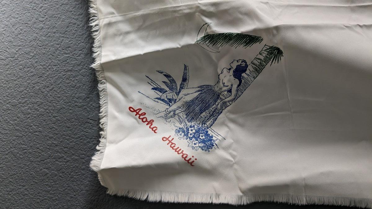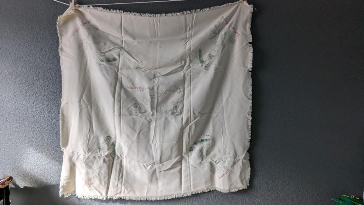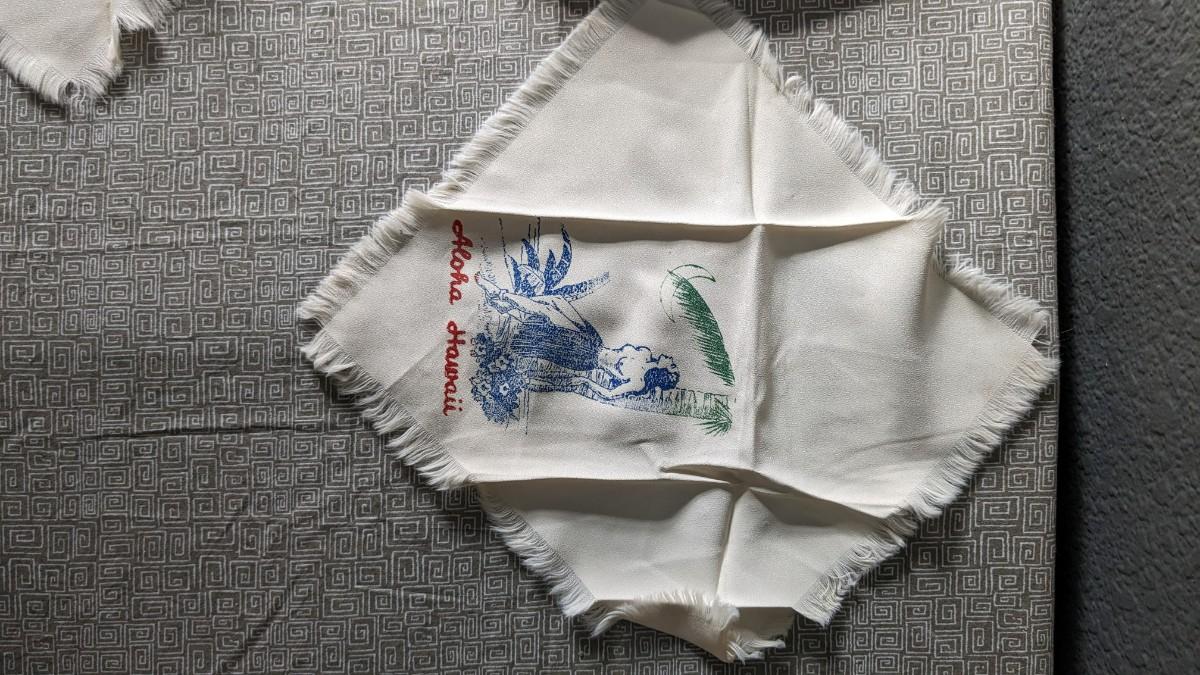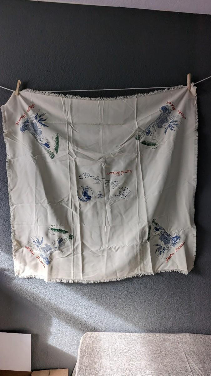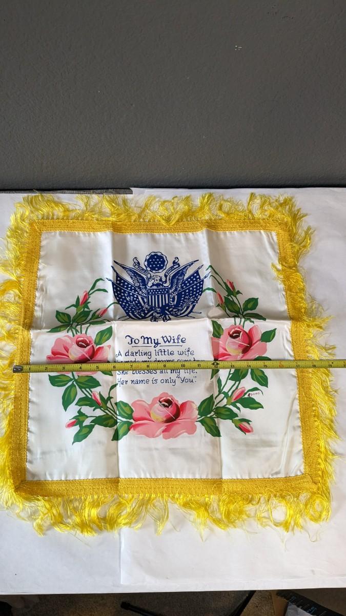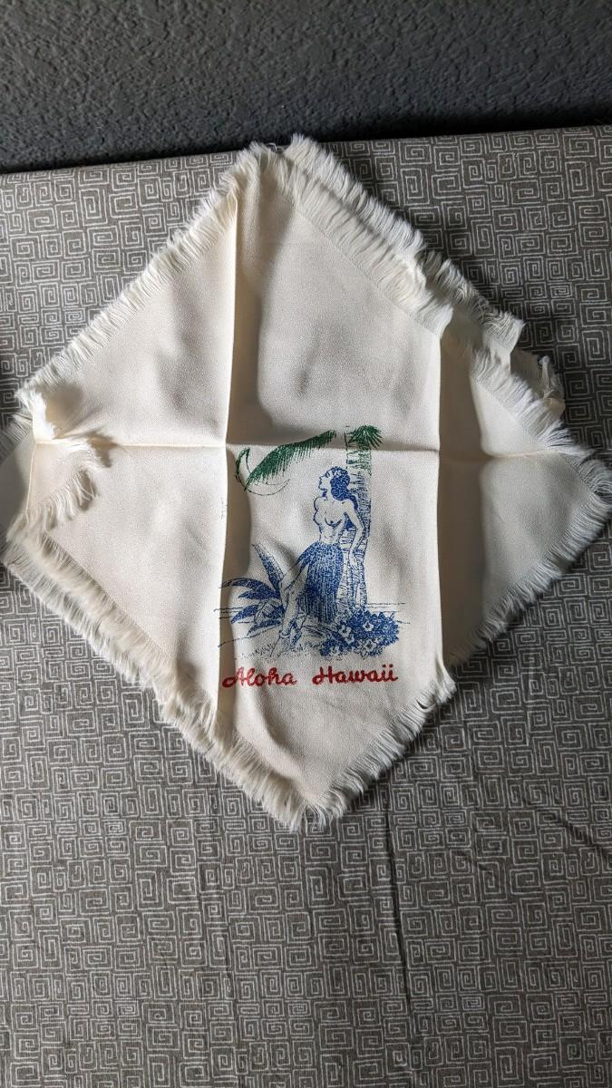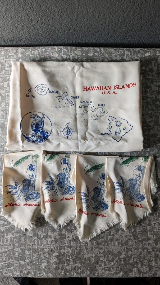 4 beautiful multi size satin/poly WW2 era pillowcases. 2 from Camp Adair in Oregon and one from Ft. Campbell Kentucky, the final is unmarked. Each are stunning and in excellent condition. Also includes an incredible matched set of silk screen on acetate Hawaiian hula girl tablecloth and napkins. This beautiful set has a lovely cream color to linen, frayed edges and matched silk screens. Napkins are a stunning tricolor with green at the top of the tree going into blue with the striking red "Aloha Hawaii" at the base. The four corners of the tablecloth have the same design and detail with Hawaiian specifics in the center in blue. One small pull is located in the center image, please see in photos, as well as one pen point spot. There is almost non-existent image seeping and no holes, tears, or other major damage found. This is an incredible set of linens that are very hard to find complete and in this condition! Don't miss out!