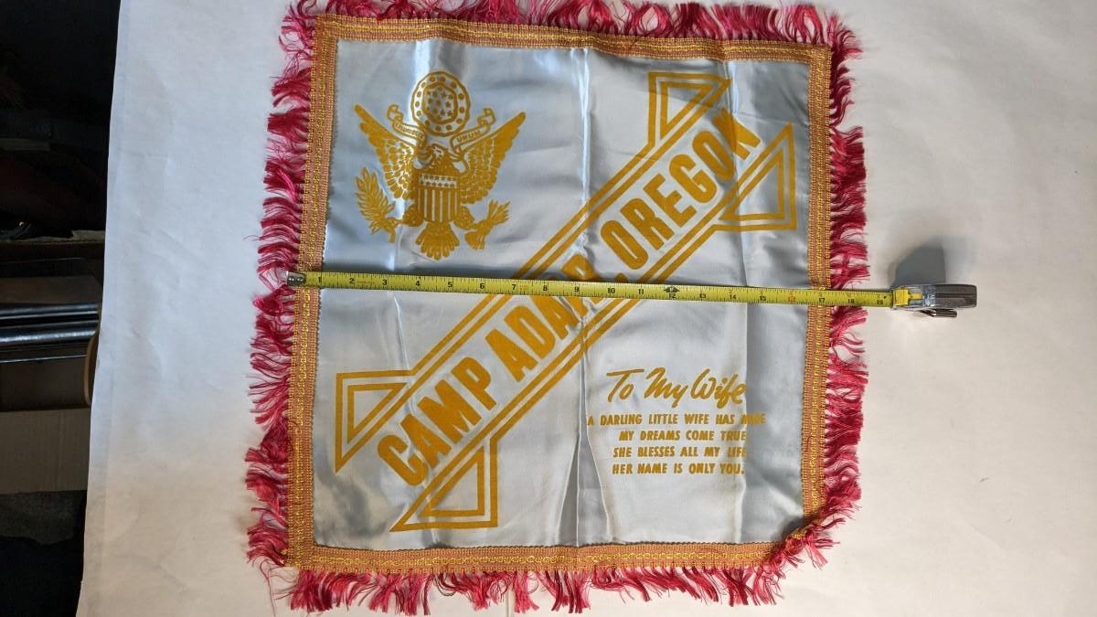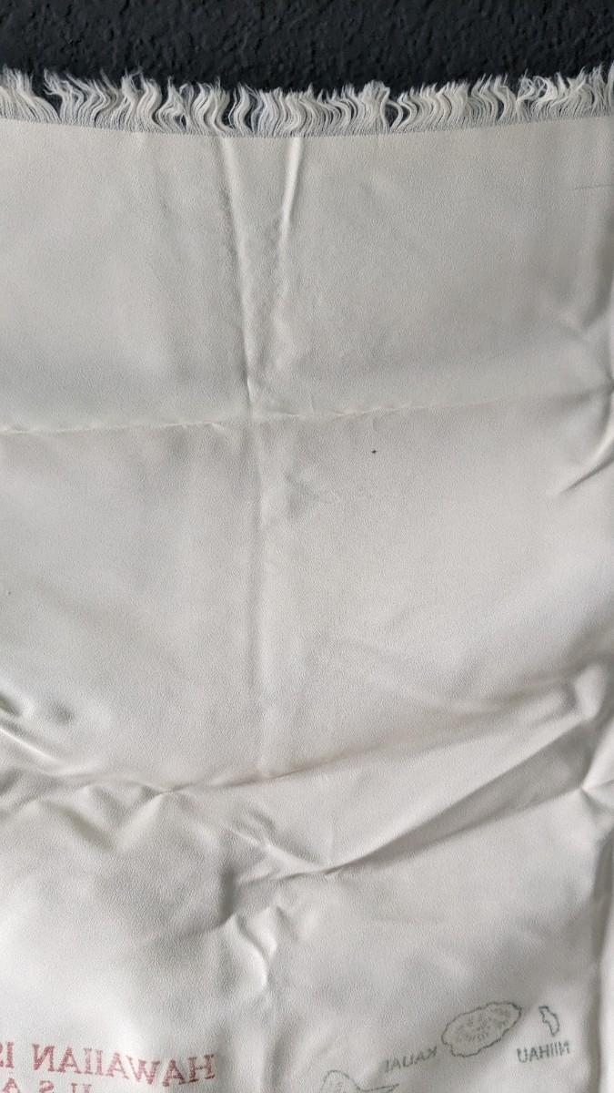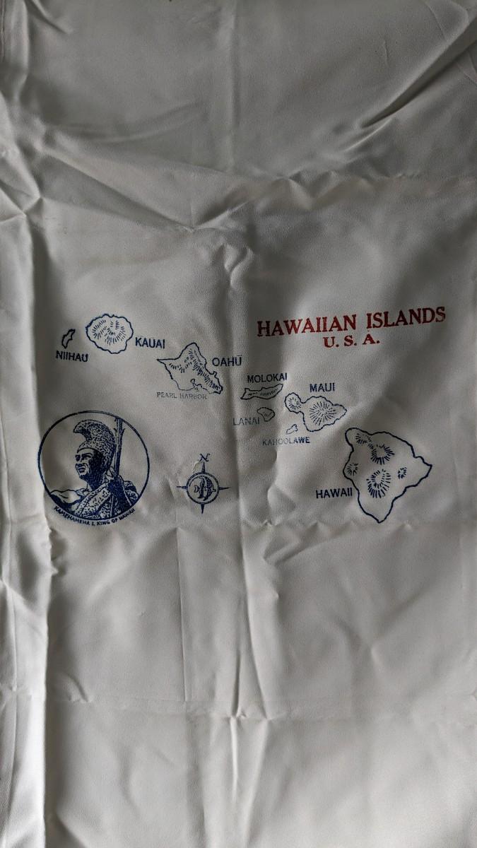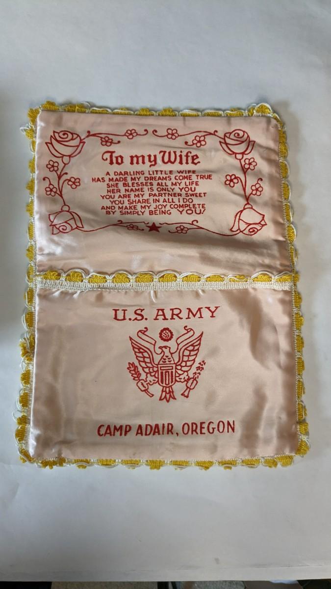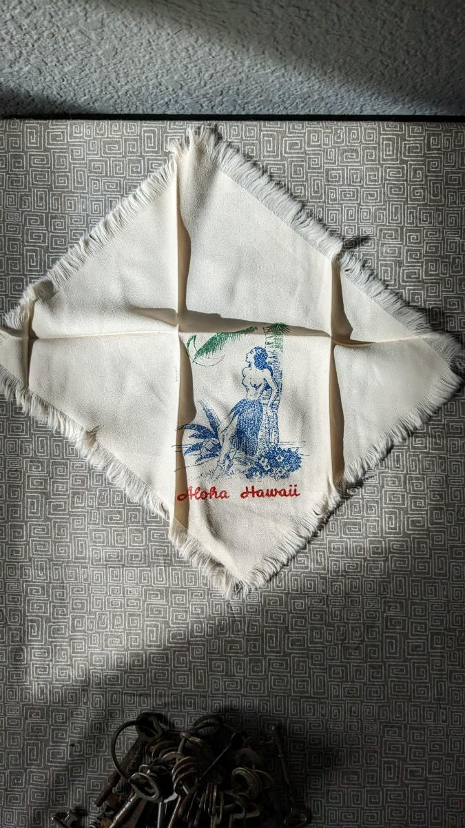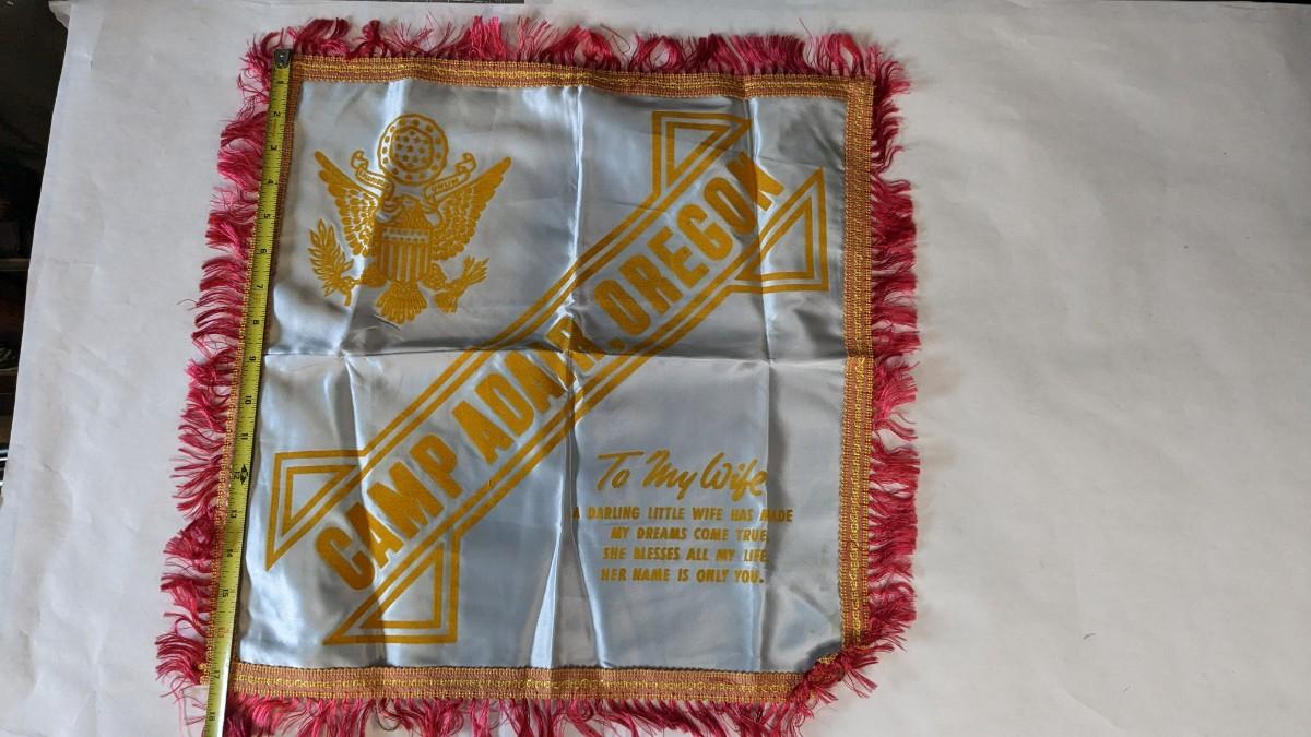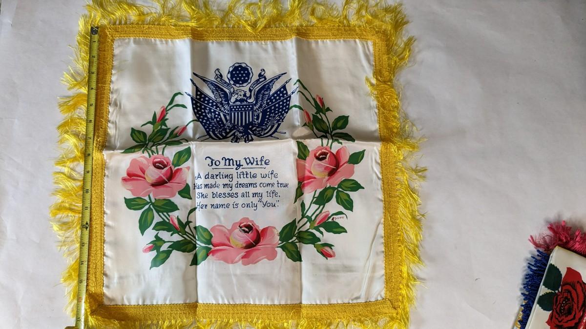 4 beautiful multi size satin/poly WW2 era pillowcases. 2 from Camp Adair in Oregon and one from Ft. Campbell Kentucky, the final is unmarked. Each are stunning and in excellent condition. Also includes an incredible matched set of silk screen on acetate Hawaiian hula girl tablecloth and napkins. This beautiful set has a lovely cream color to linen, frayed edges and matched silk screens. Napkins are a stunning tricolor with green at the top of the tree going into blue with the striking red "Aloha Hawaii" at the base. The four corners of the tablecloth have the same design and detail with Hawaiian specifics in the center in blue. One small pull is located in the center image, please see in photos, as well as one pen point spot. There is almost non-existent image seeping and no holes, tears, or other major damage found. This is an incredible set of linens that are very hard to find complete and in this condition! Don't miss out!