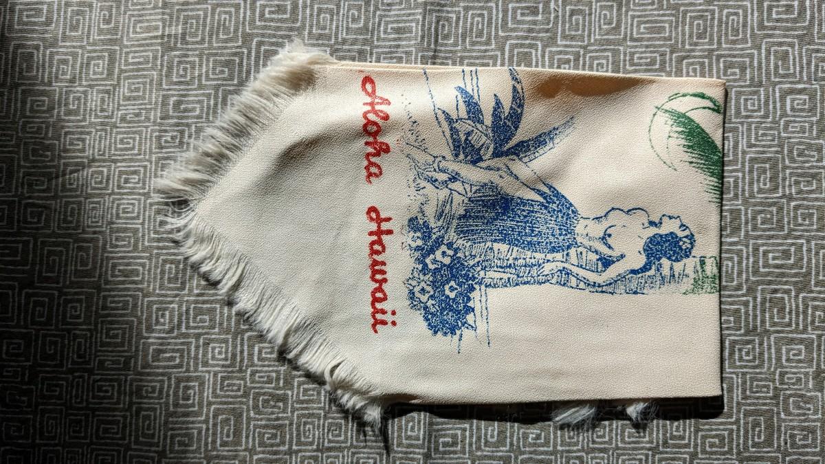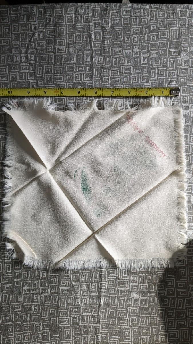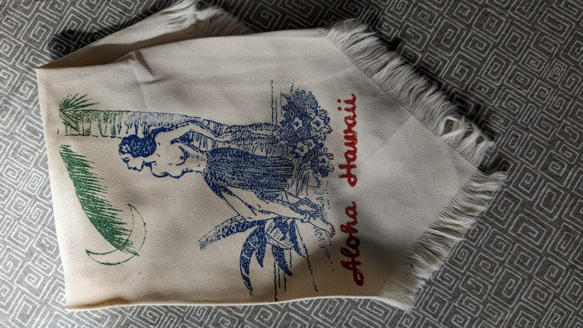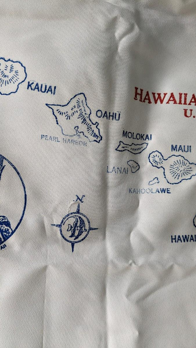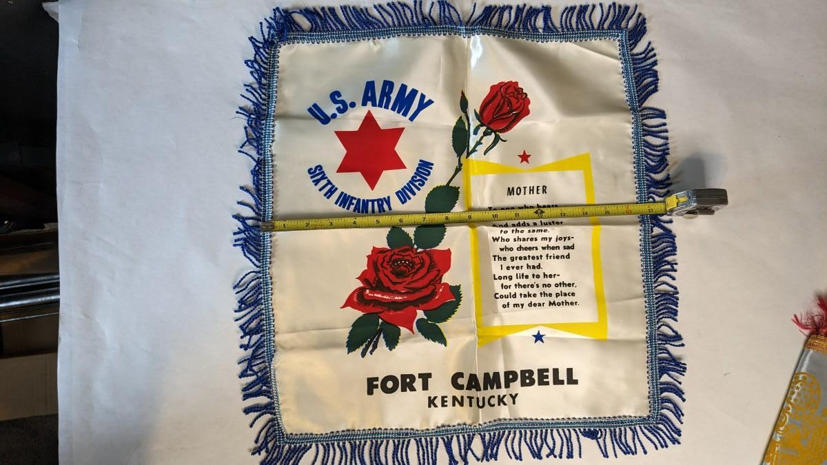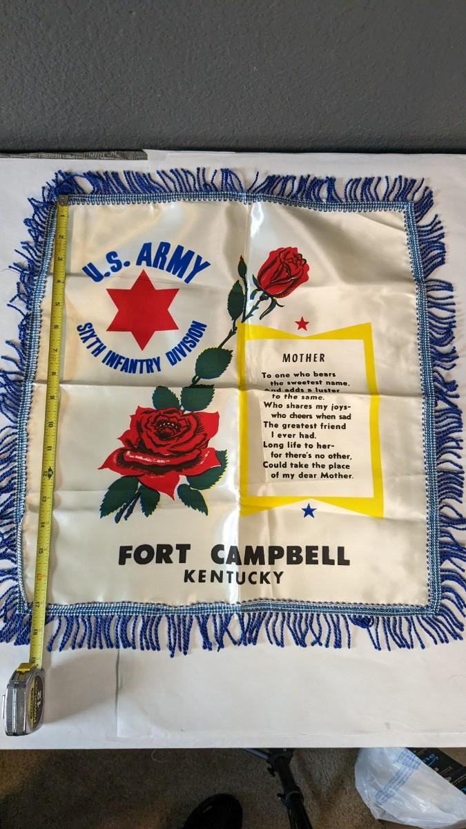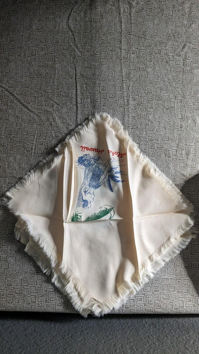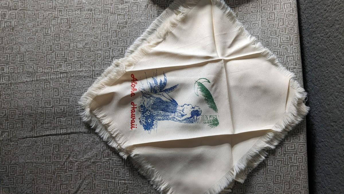 4 beautiful multi size satin/poly WW2 era pillowcases. 2 from Camp Adair in Oregon and one from Ft. Campbell Kentucky, the final is unmarked. Each are stunning and in excellent condition. Also includes an incredible matched set of silk screen on acetate Hawaiian hula girl tablecloth and napkins. This beautiful set has a lovely cream color to linen, frayed edges and matched silk screens. Napkins are a stunning tricolor with green at the top of the tree going into blue with the striking red "Aloha Hawaii" at the base. The four corners of the tablecloth have the same design and detail with Hawaiian specifics in the center in blue. One small pull is located in the center image, please see in photos, as well as one pen point spot. There is almost non-existent image seeping and no holes, tears, or other major damage found. This is an incredible set of linens that are very hard to find complete and in this condition! Don't miss out!