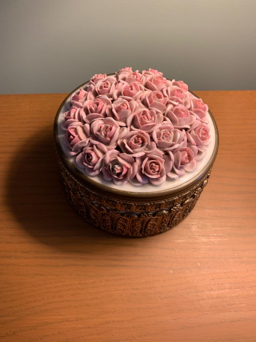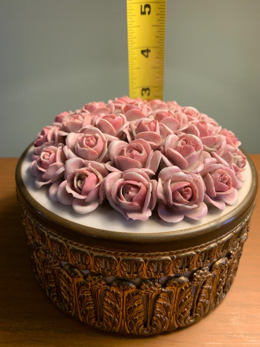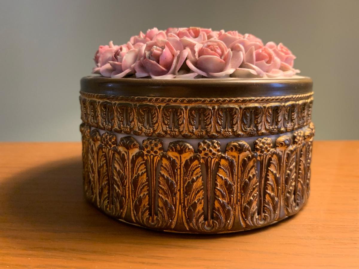 Ceramic roses cover a bronze filigree encased ceramic trinket container.