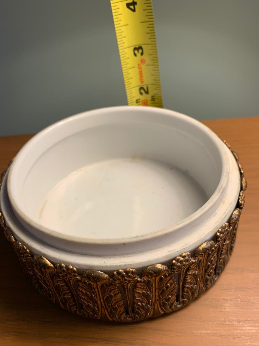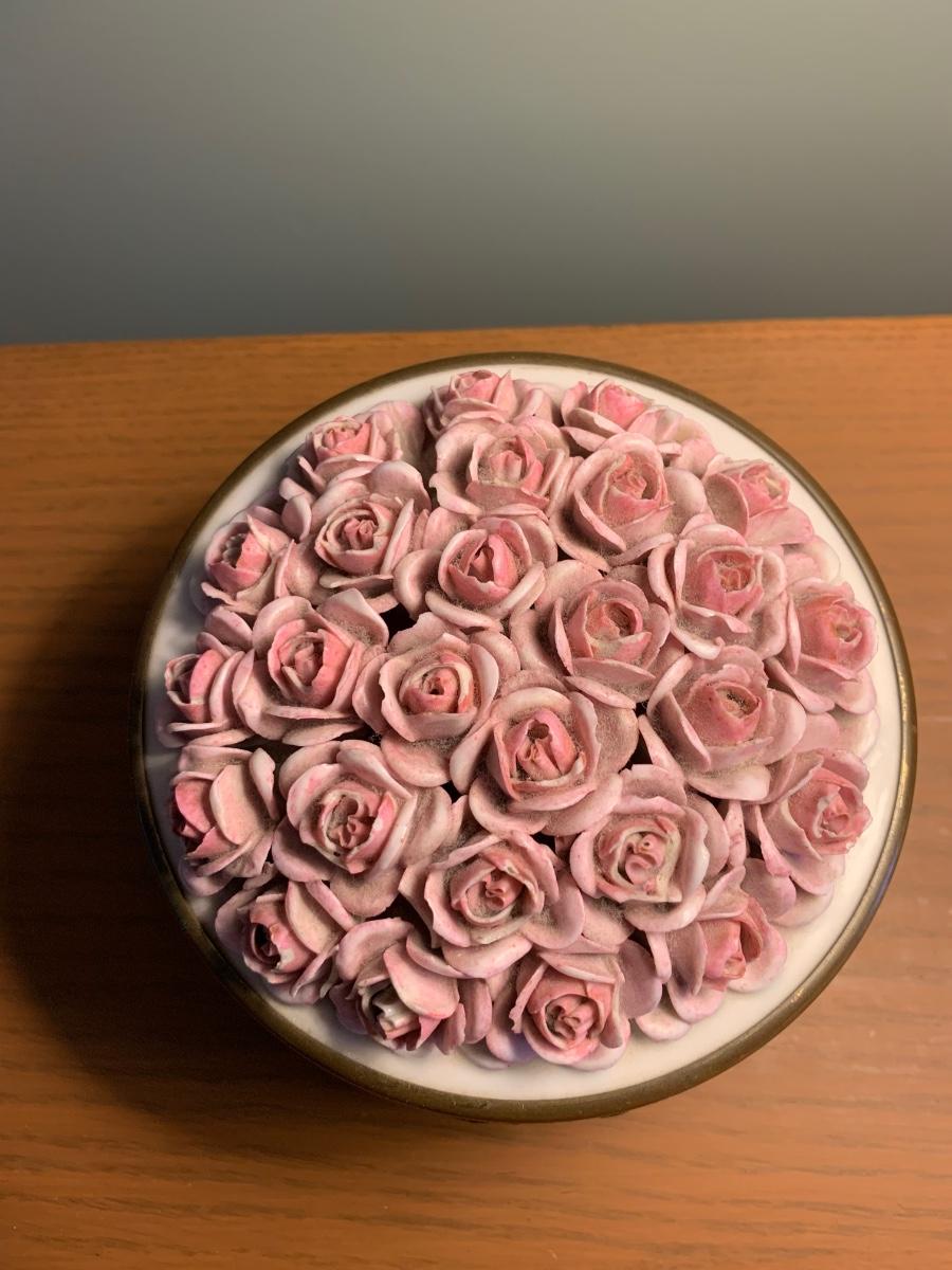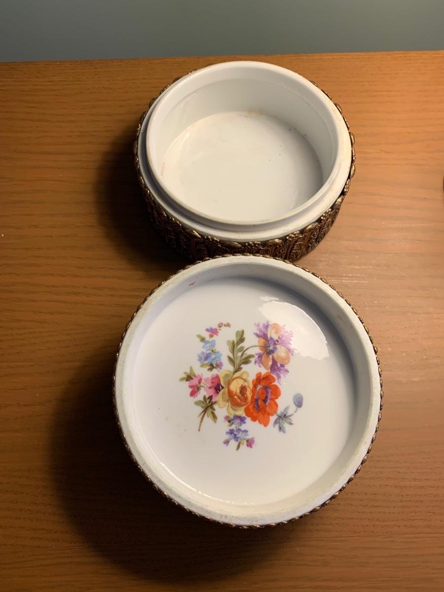 Ceramic roses cover a bronze filigree encased ceramic trinket container.
