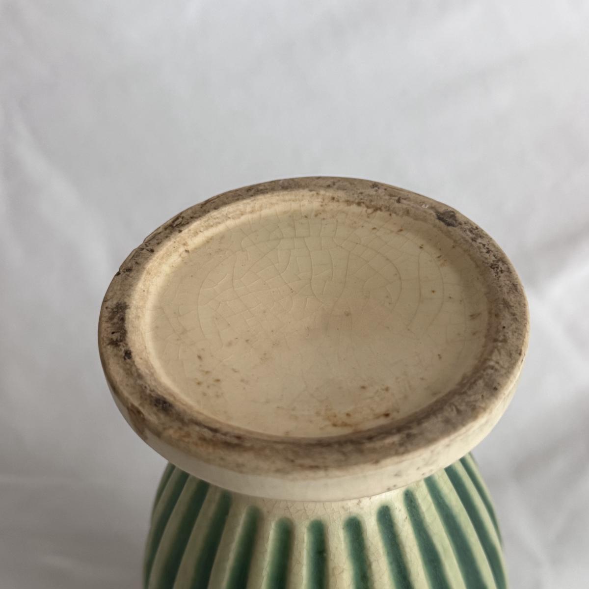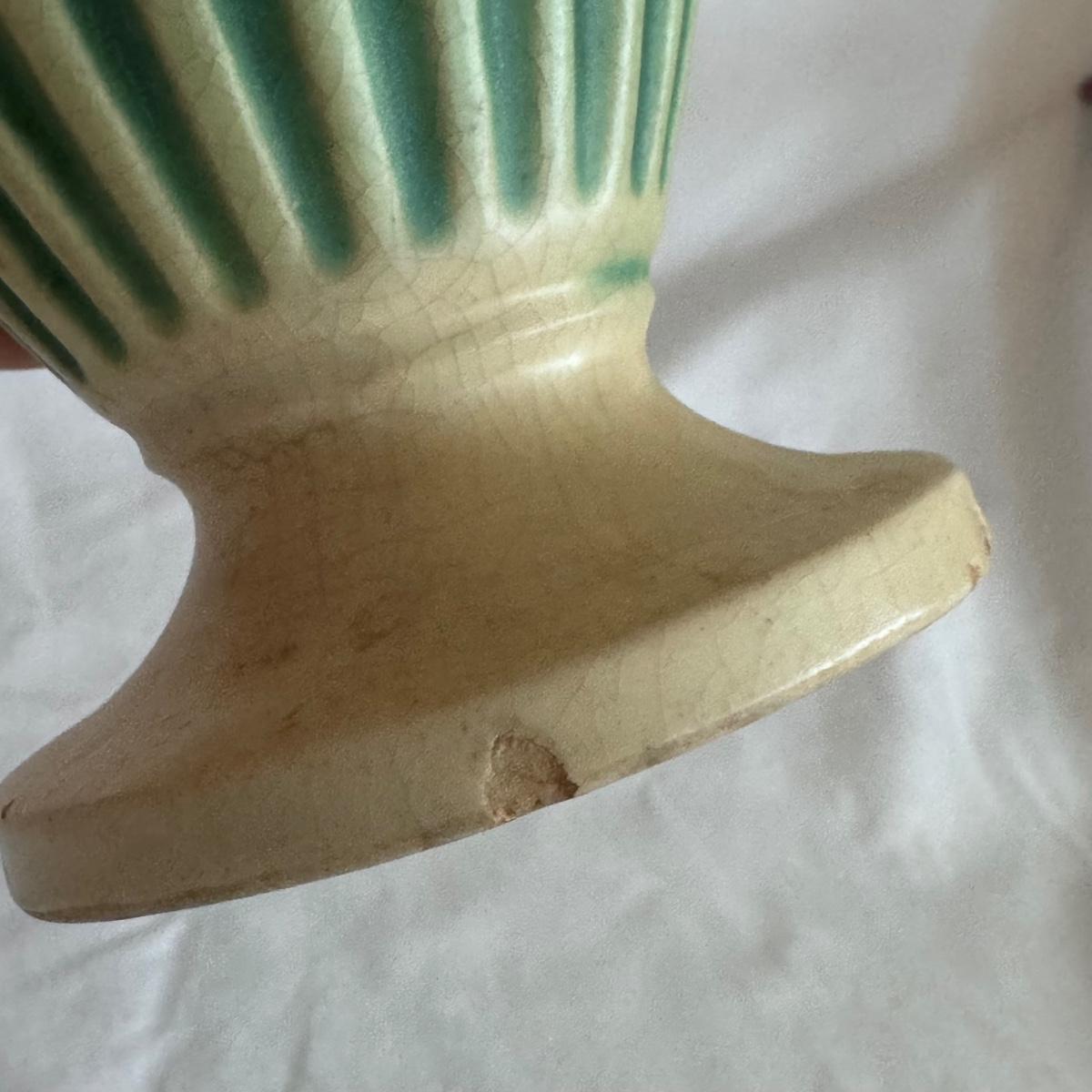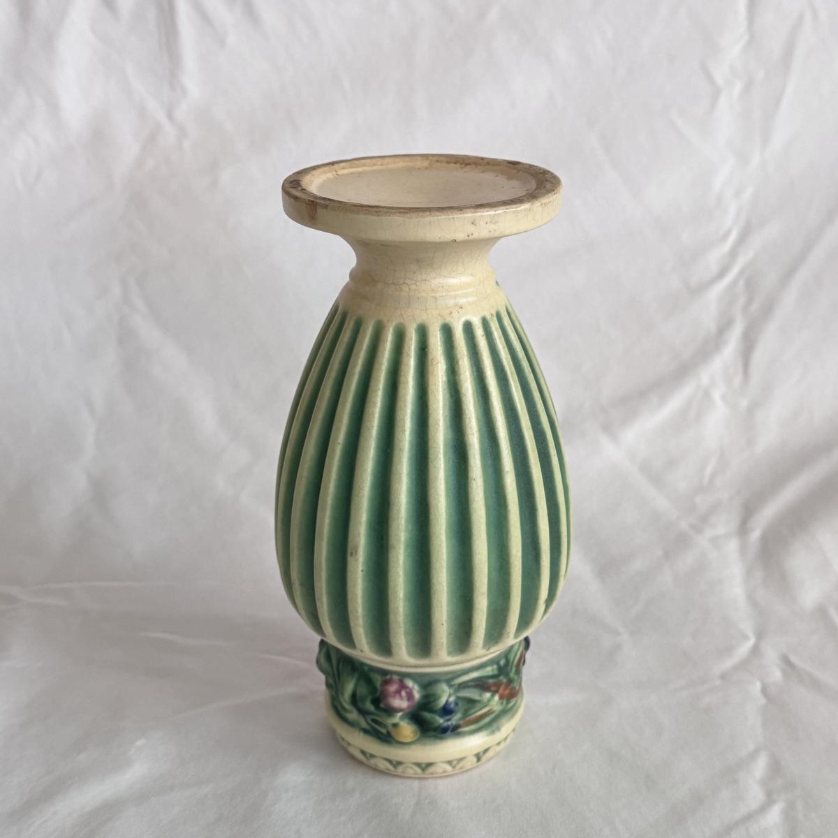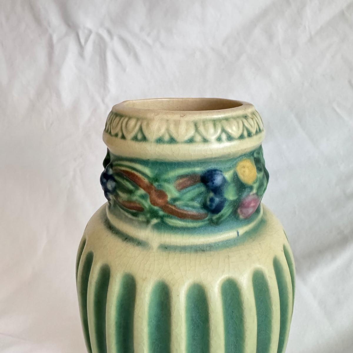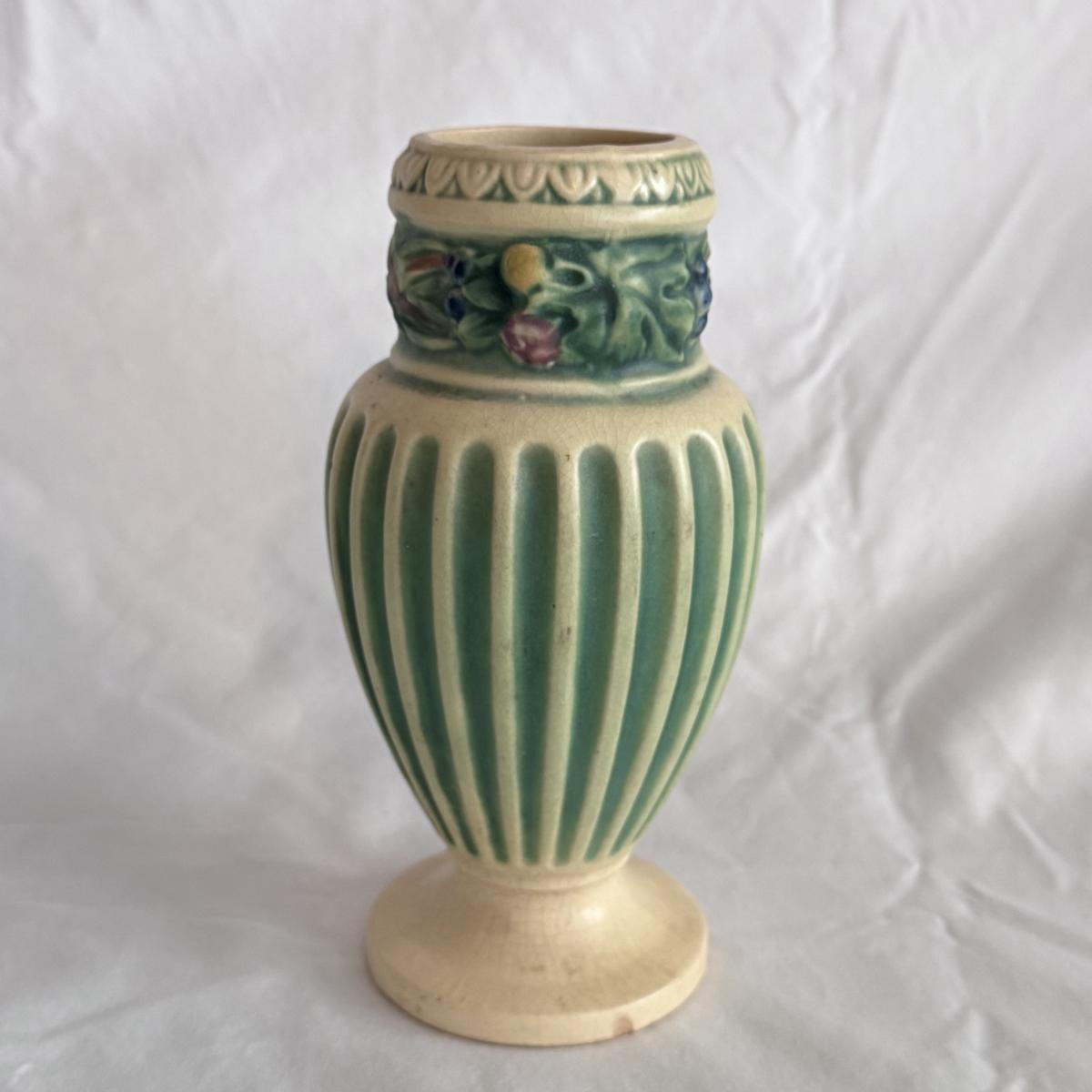 This lot includes what appears to be one Roseville art deco Corinthian vase that may be from the 1920’s. There are no markings to confirm this. The vase is in a pretty shade of blue with cream accents. It measures 3.5”D x 7.5”H. There are two small chips at the bottom of the vase - see picture included. Shipping available.
